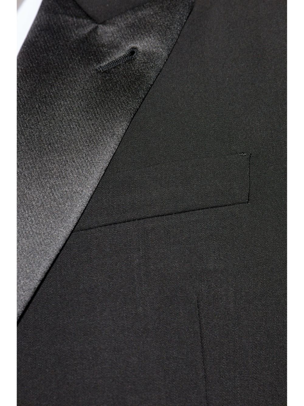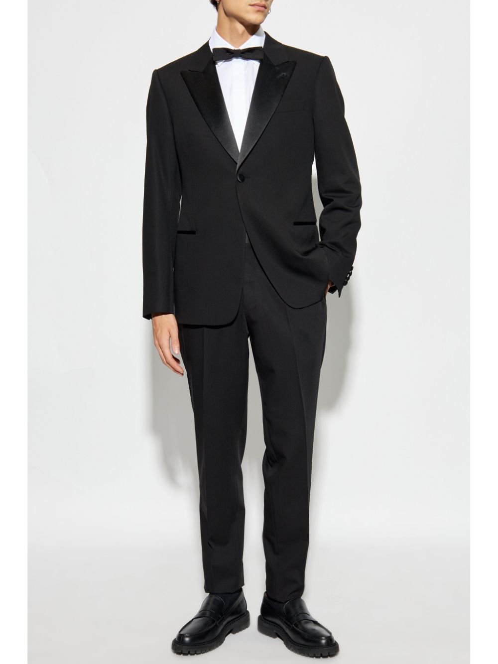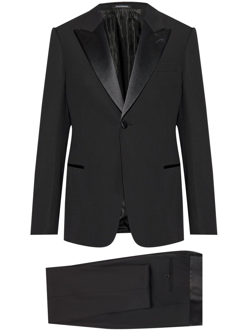black wool tailored design Blazer front button fastening peak lapels long sleeves chest welt pocket two side welt pockets buttoned cuffs Trousers mid-rise concealed front button, hook and zip fastening two side inset pockets two rear button-fastening jetted pockets straight leg Size and Fit - This piece fits true to size. We recommend you get your regular size. Model is 1,84m / 6ft 1in wearing size 48 (IT)