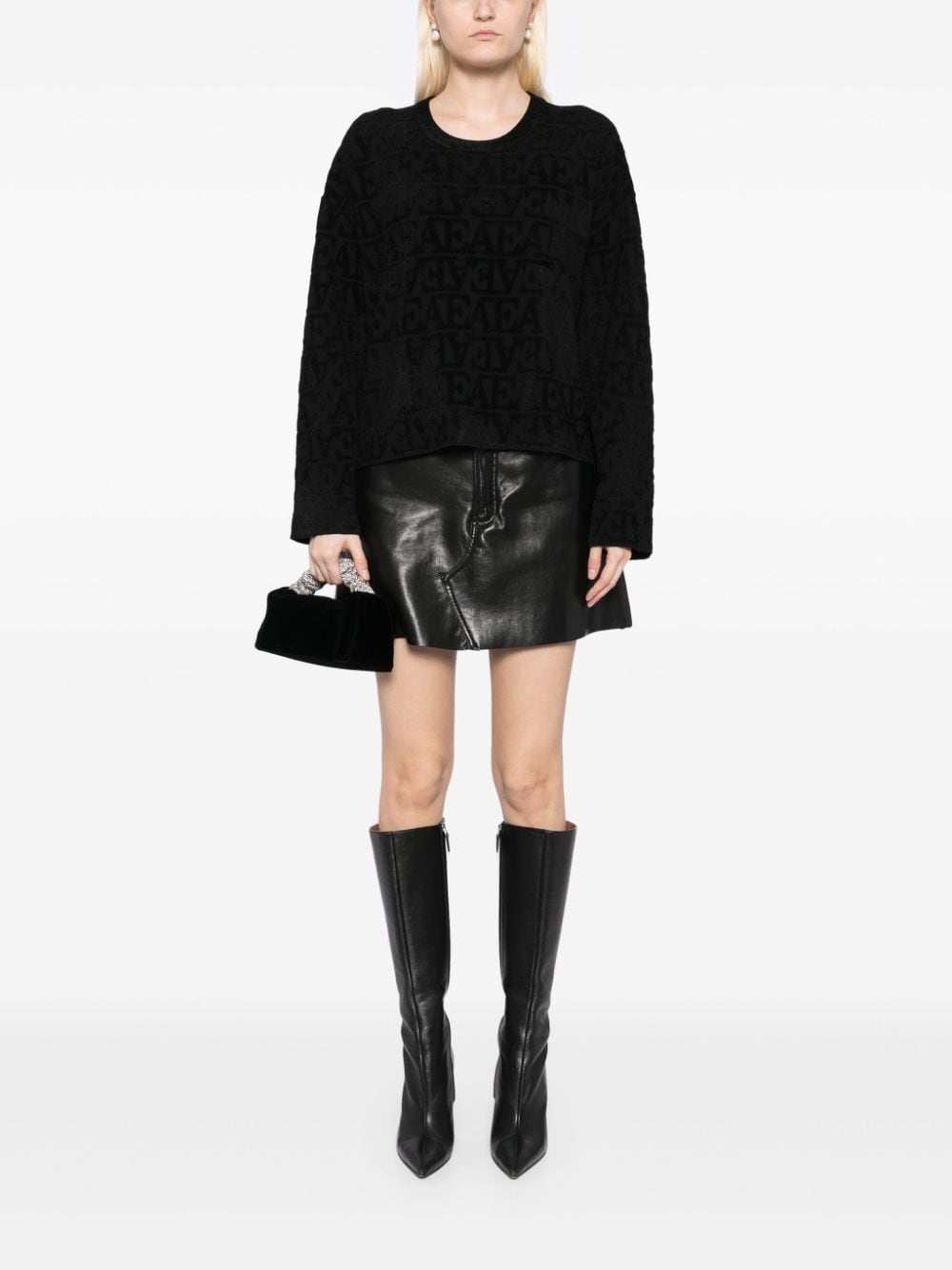 black knitted construction all-over logo pattern crew neck long sleeves straight hem Size and Fit - This piece fits true to size. We recommend you get your regular size. Model is 1,75m / 5ft 8in wearing size S