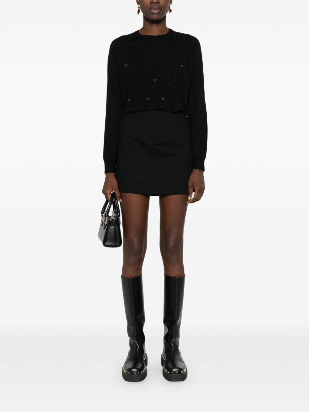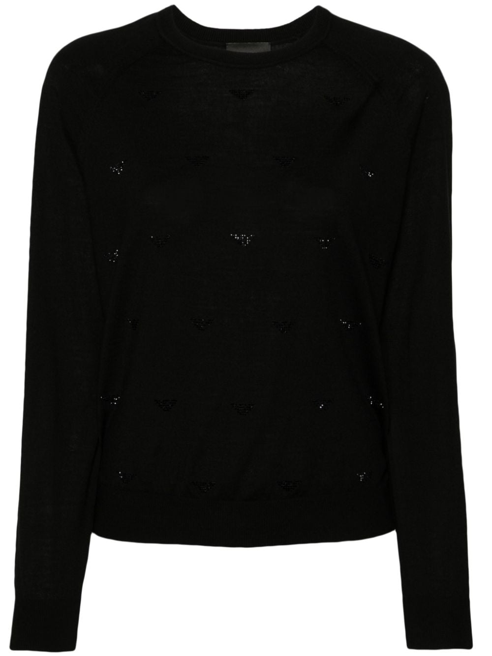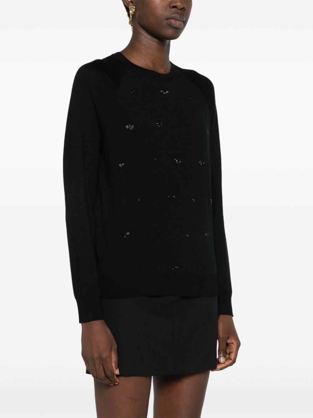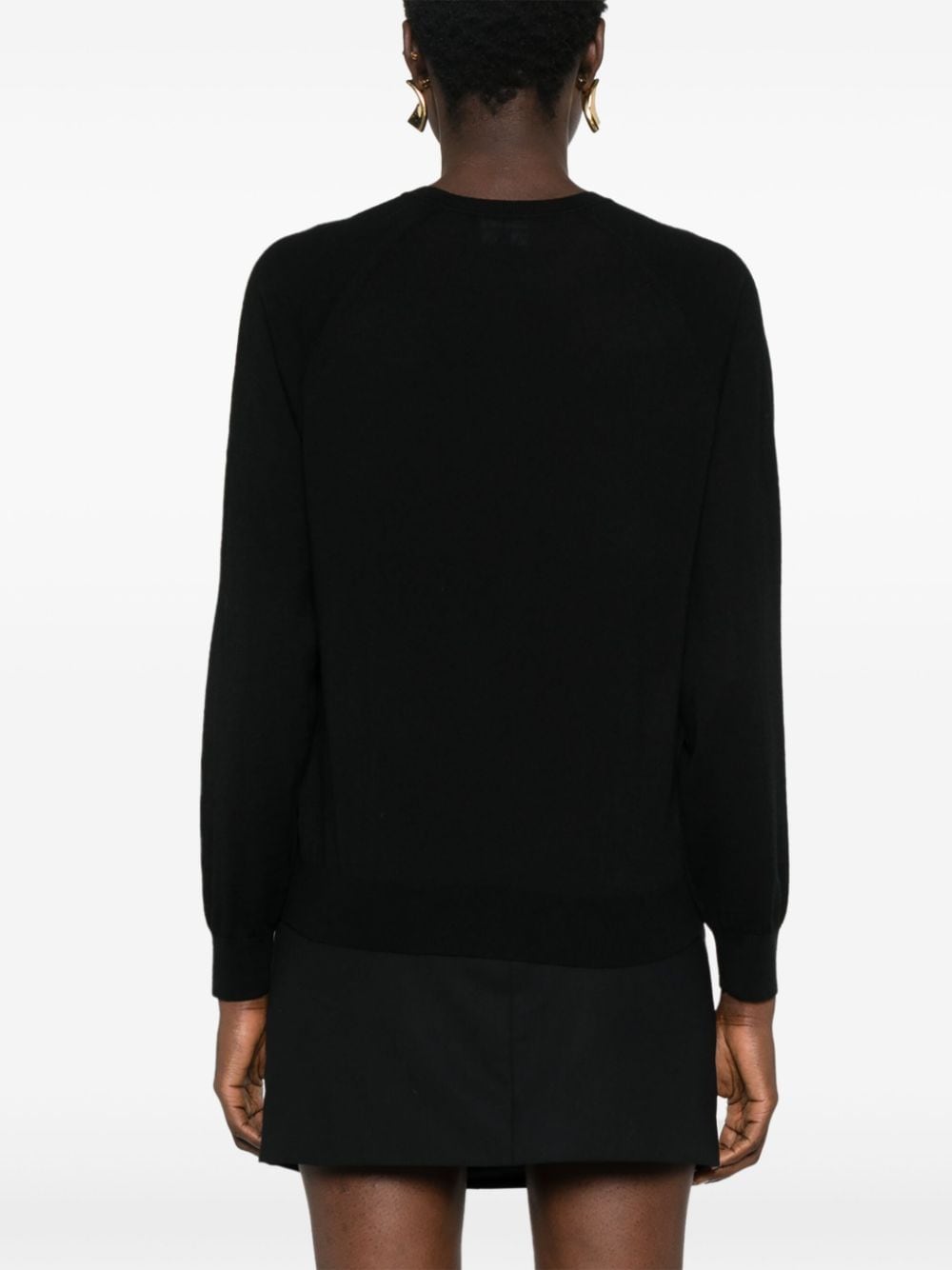 black virgin wool fine knit rhinestone logo appliqués to the front crew neck long raglan sleeves ribbed cuffs and hem Size and Fit - This piece fits true to size. We recommend you get your regular size. Model is 1,75m / 5ft 8in wearing size S