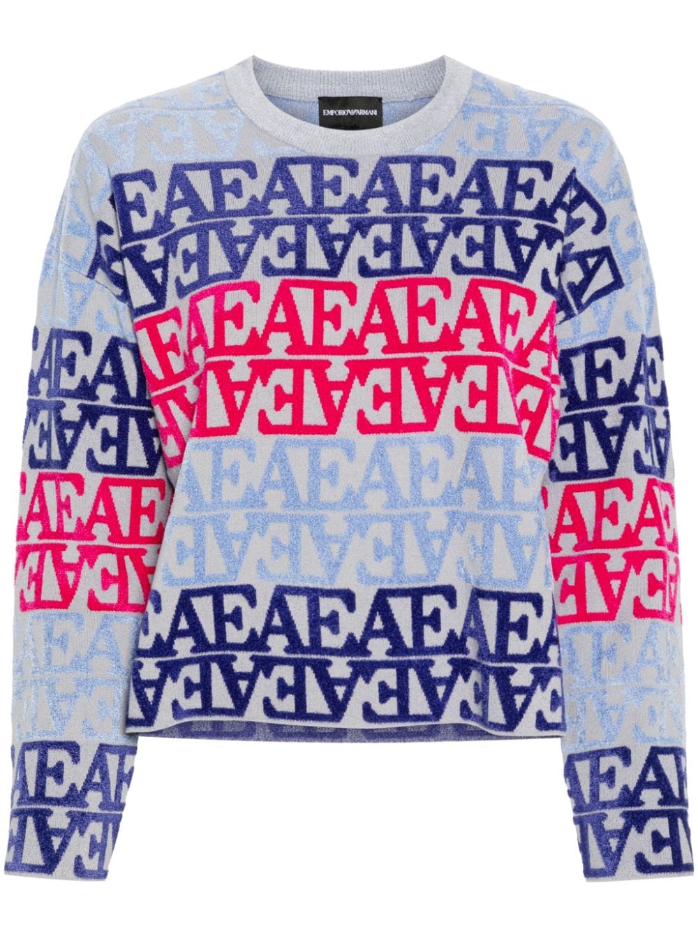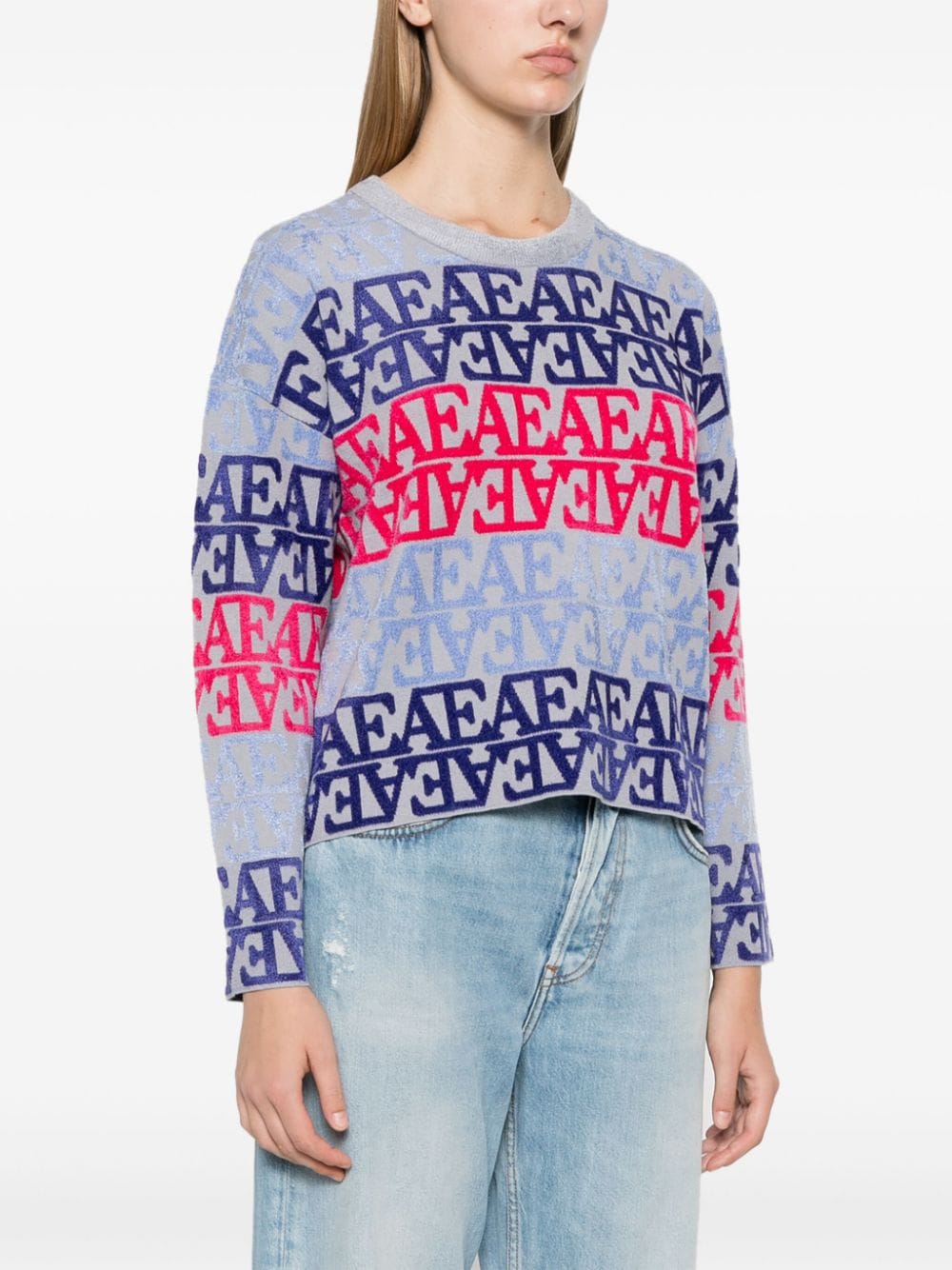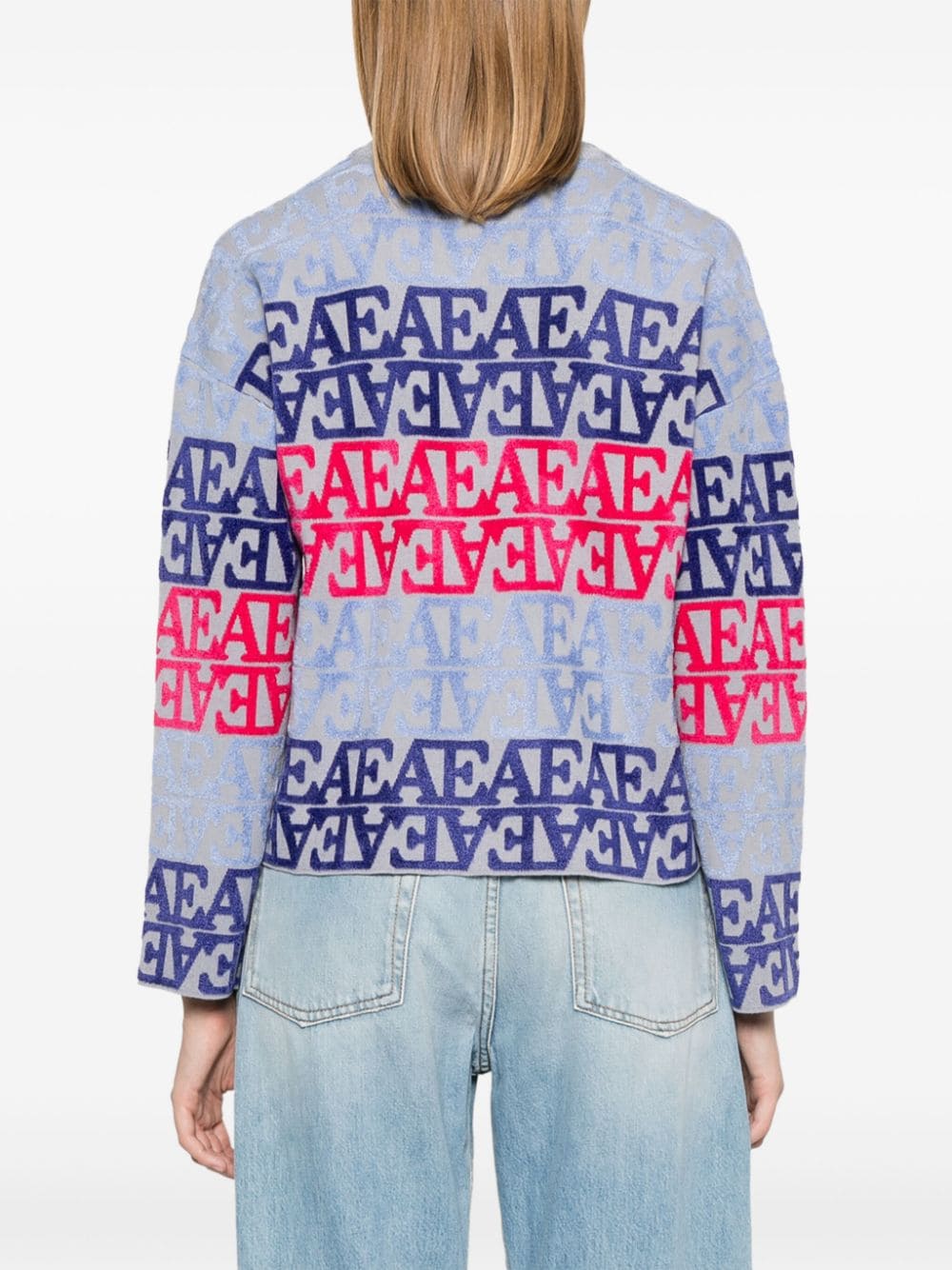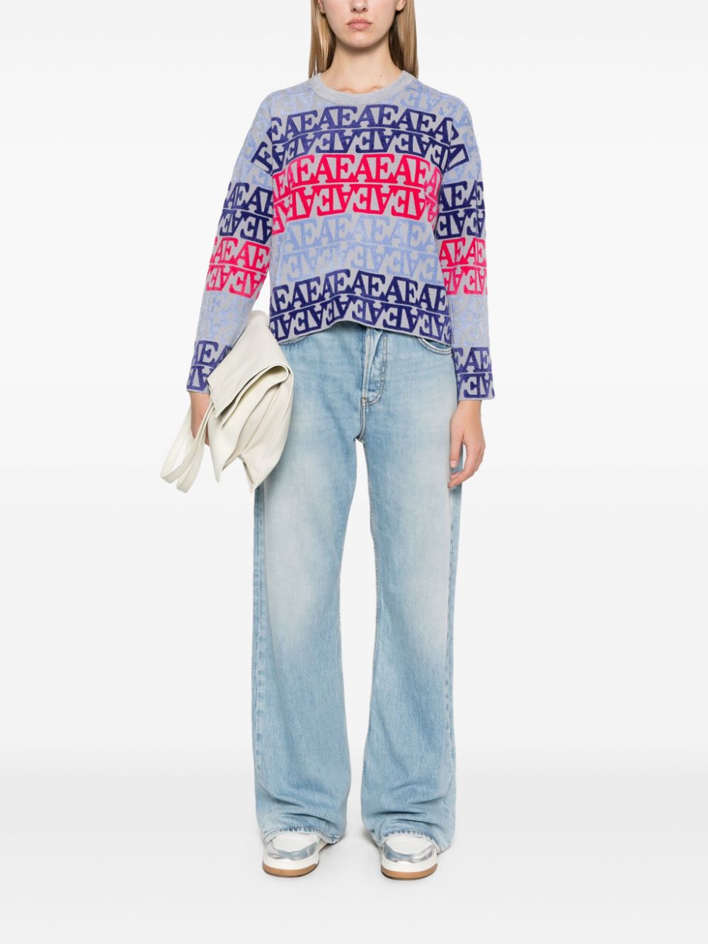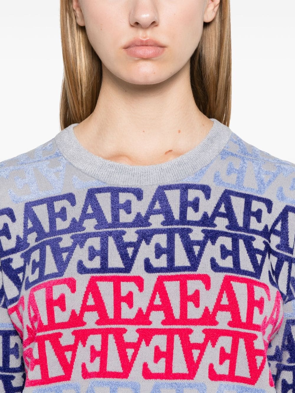 duck egg blue/multicolour knitted construction all-over flocked logo chenille trim ribbed trim crew neck long sleeves straight hem Size and Fit - This piece fits true to size. We recommend you get your regular size. Model is 1,75m / 5ft 8in wearing size S