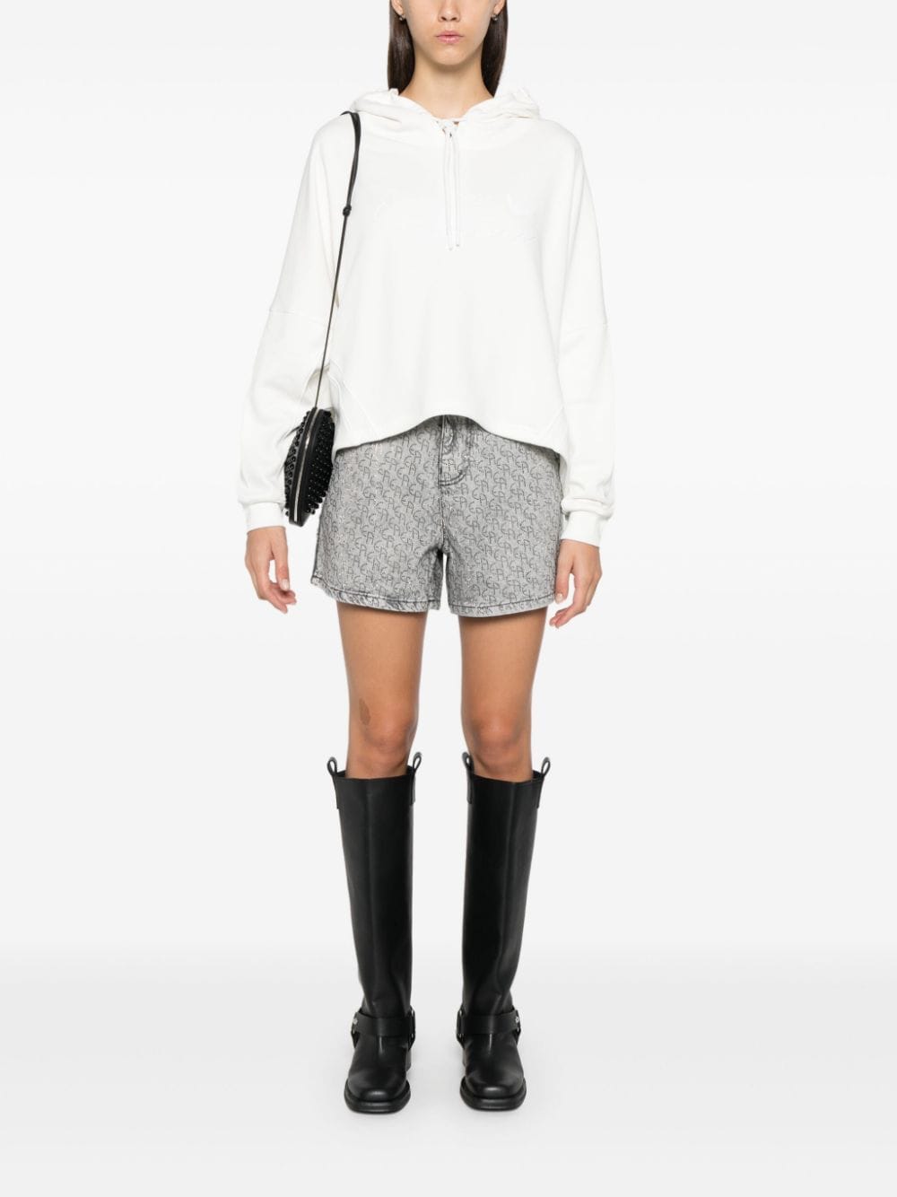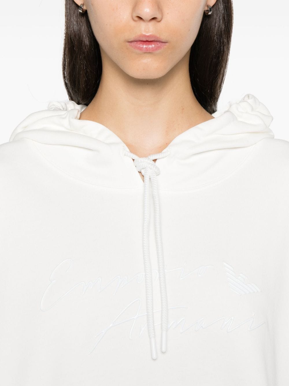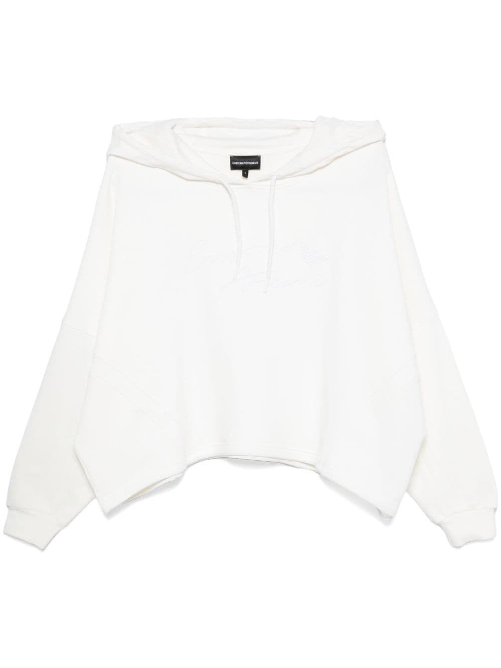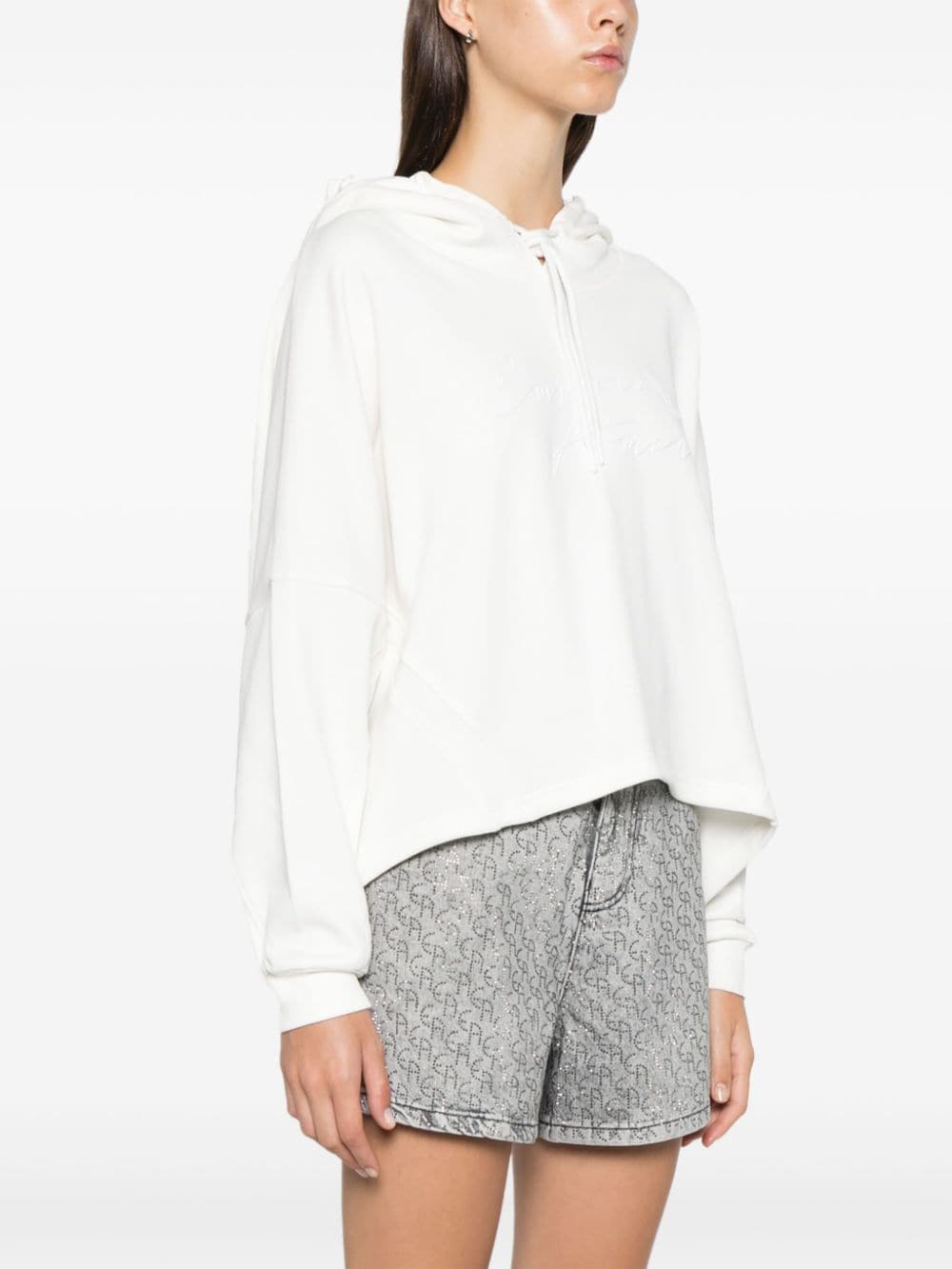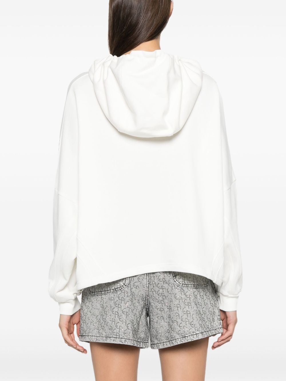 white organic cotton jersey texture rubberised logo detail to the front slouchy drawstring hood drop shoulder long sleeves ribbed cuffs drawstring straight hem French terry lining This item is made from at least 50% organic materials. Learn more about what makes a product Conscious on our Conscious Criteria page Size and Fit - This piece fits true to size. We recommend you get your regular size. Model is 1,75m / 5ft 8in wearing size S
