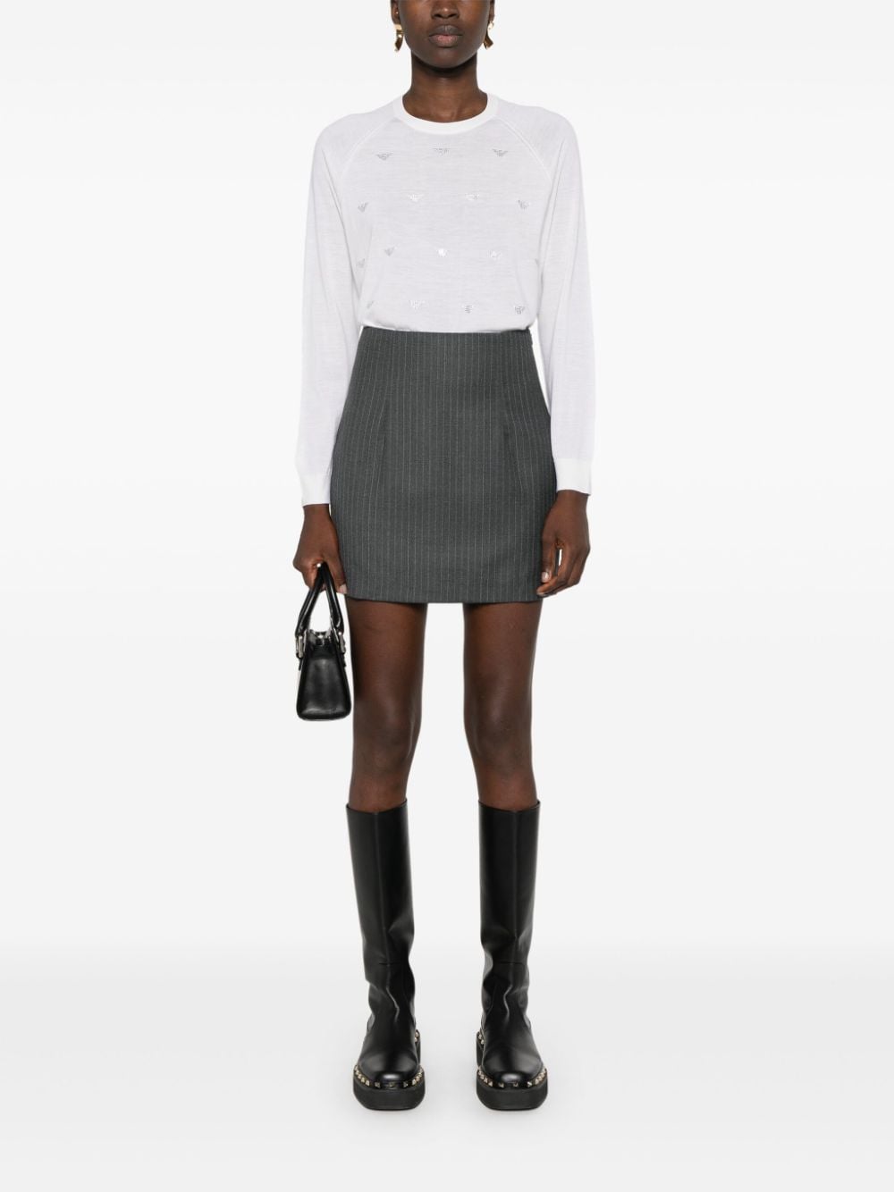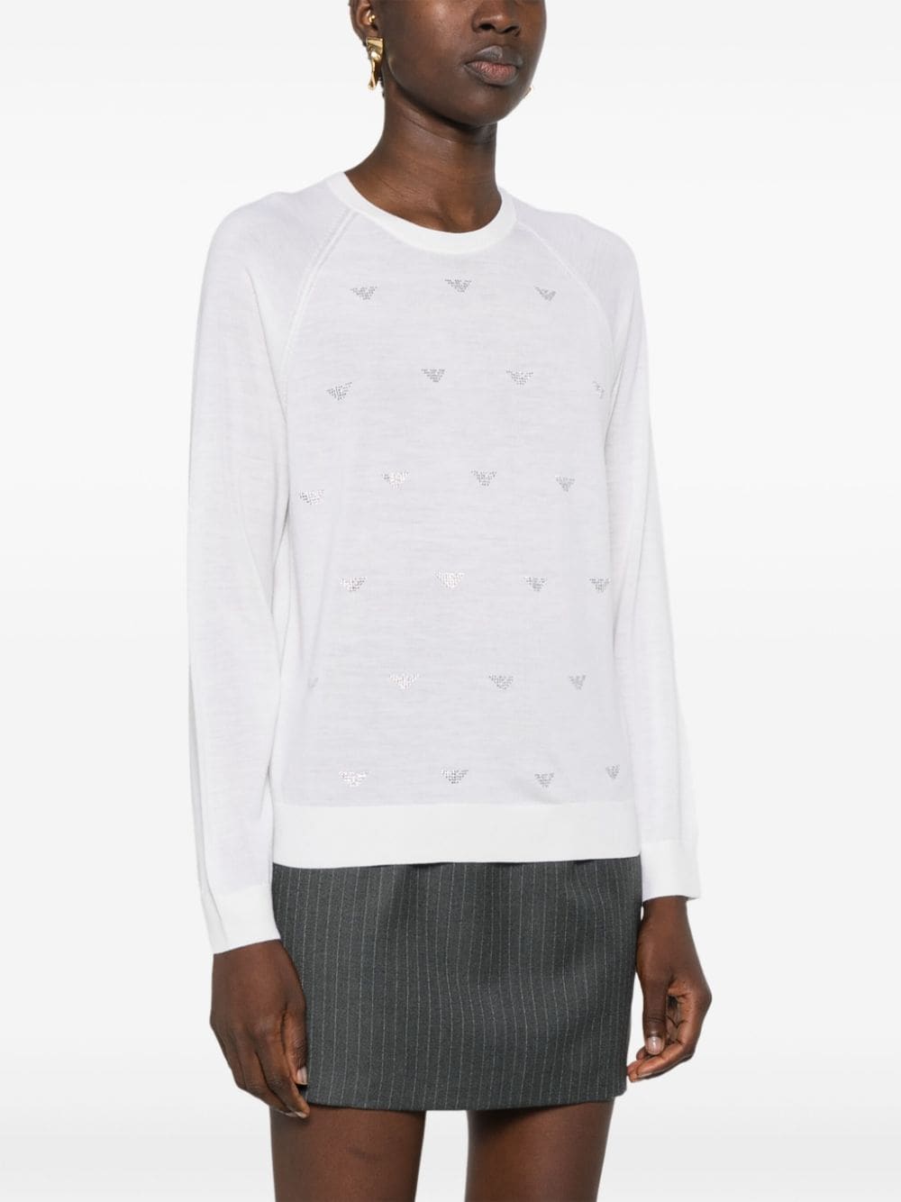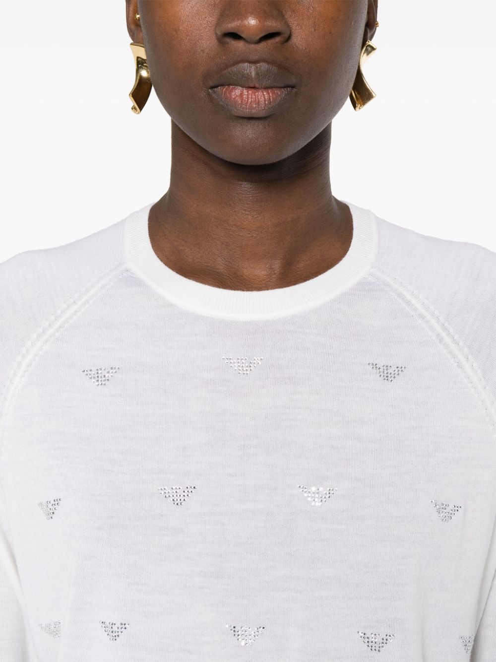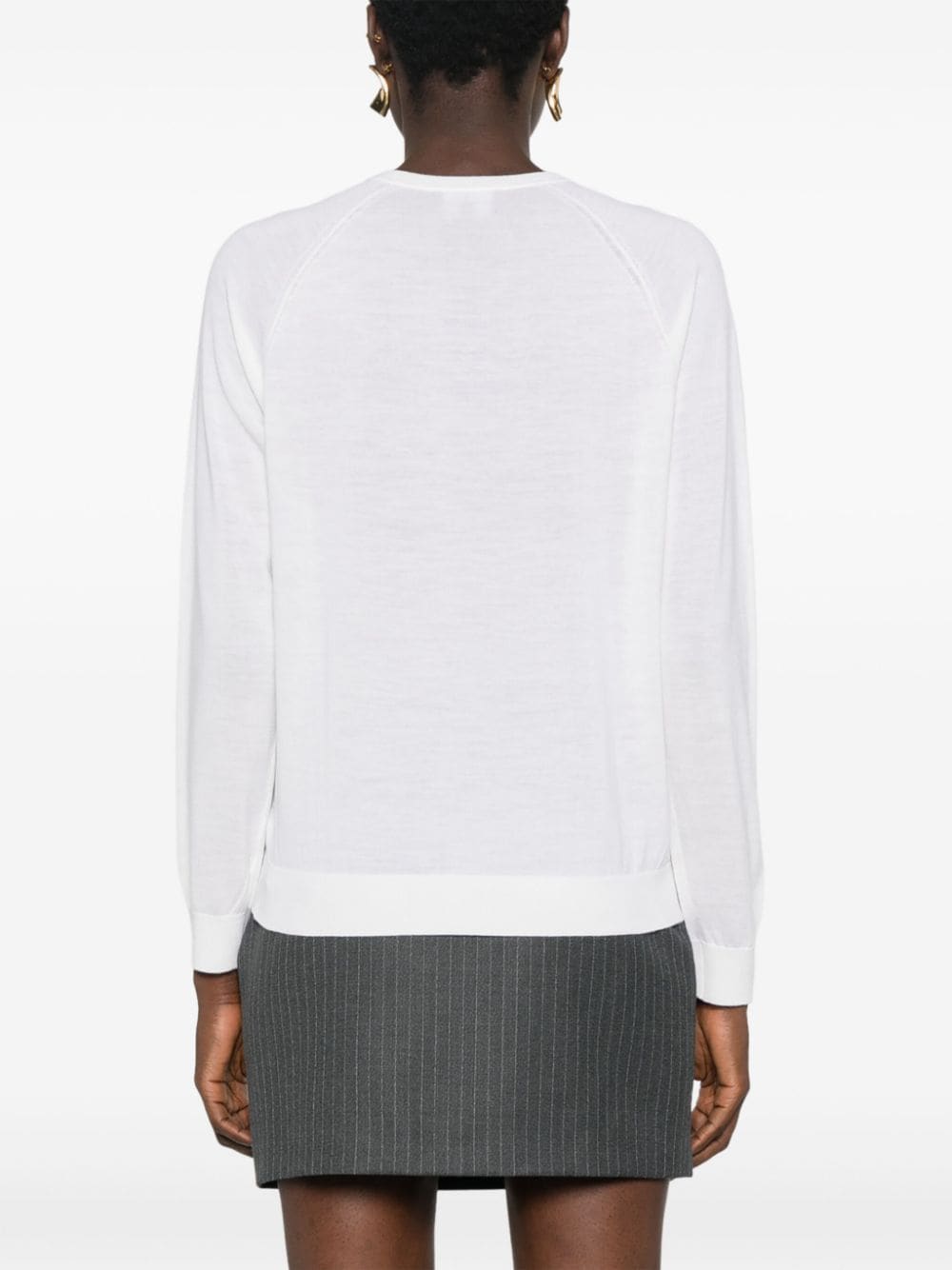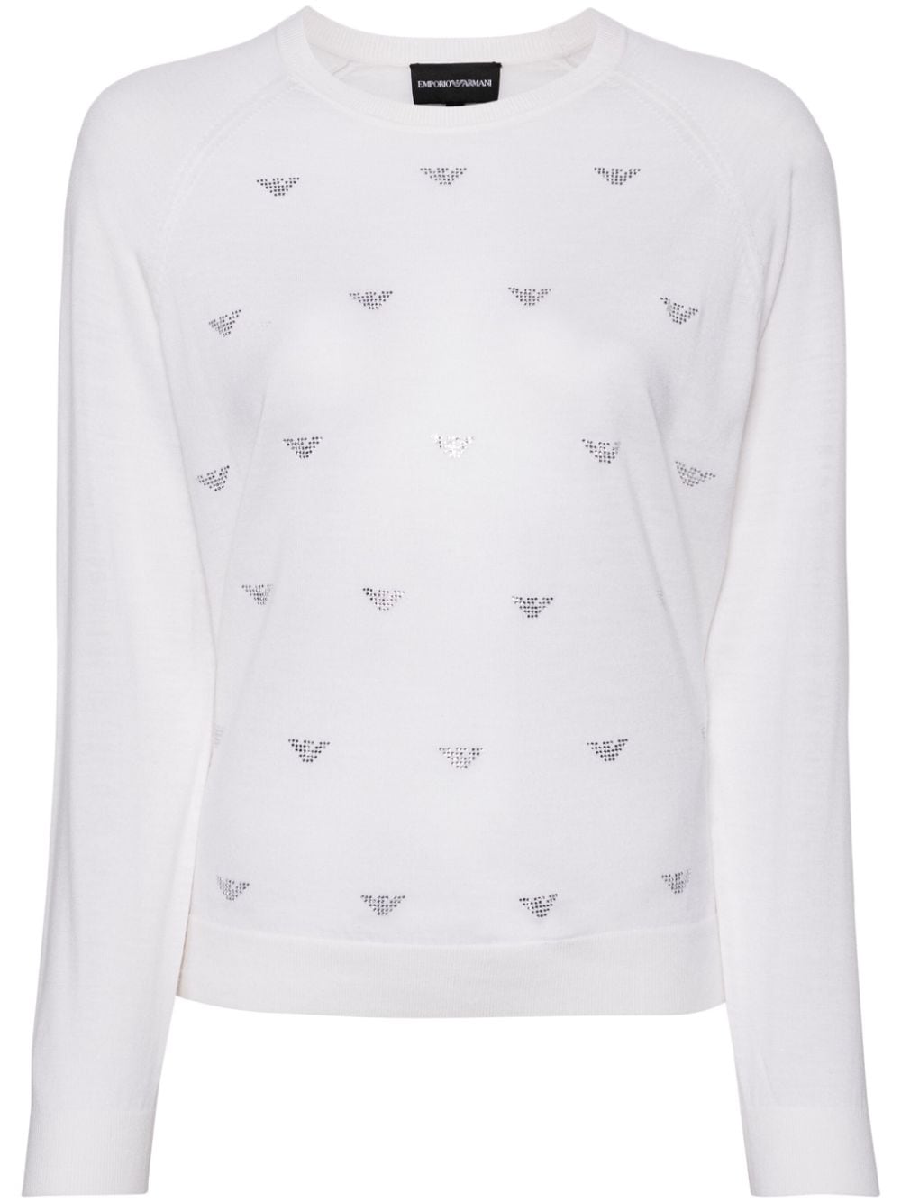 white virgin wool fine knit rhinestone logo appliqués to the front crew neck long raglan sleeves ribbed cuffs and hem Size and Fit - This piece fits true to size. We recommend you get your regular size. Model is 1,75m / 5ft 8in wearing size S