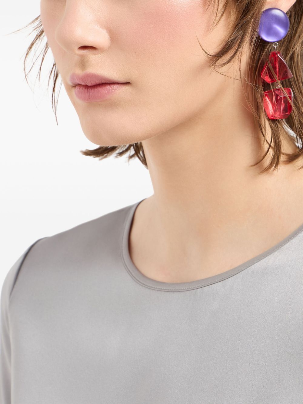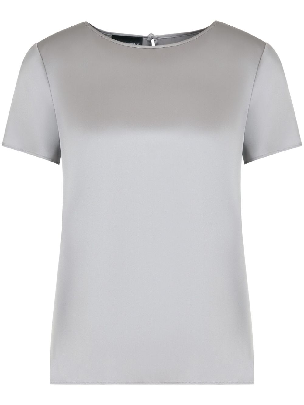 cool grey silk blend satin finish round neck single rear button fastening keyhole detail to the rear short sleeves straight hem Size and Fit - This piece fits true to size. We recommend you get your regular size. Model is 1,75m / 5ft 8in wearing size 40 (IT)
