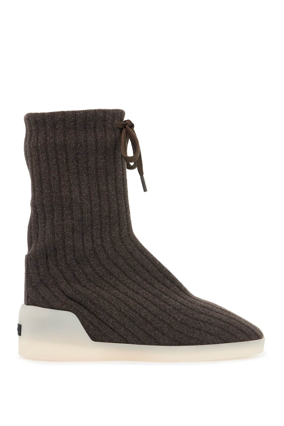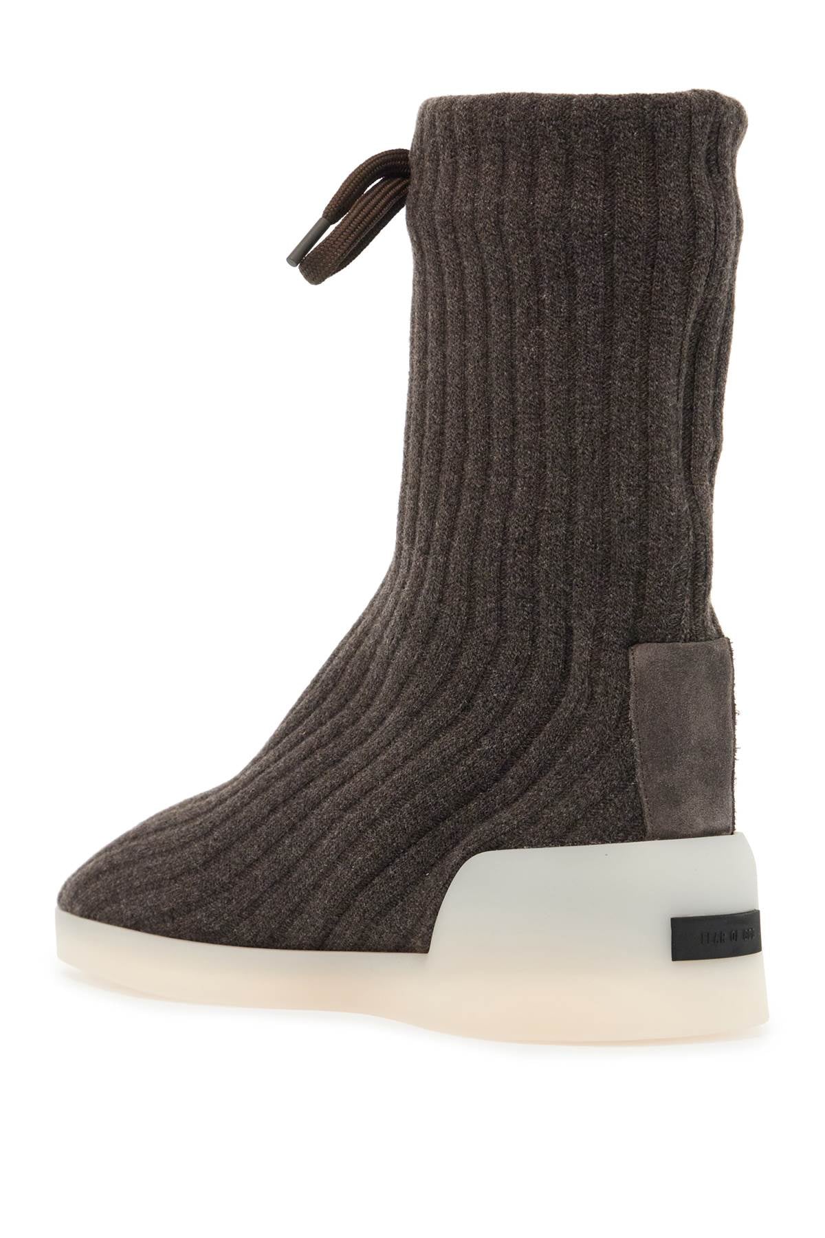 Fear Of God's Moc Hi boots are made of flat ribbed wool, with a design inspired by Native Americans and reinterpreted with a sneaker-style rubber sole. Lace-up closure on the top edge, suede leather insert on the heel, contrasting logo patch on the back. The model is fully lined in neoprene and the insole is removable. Size and Fit - Heel Height = 5 cm,
