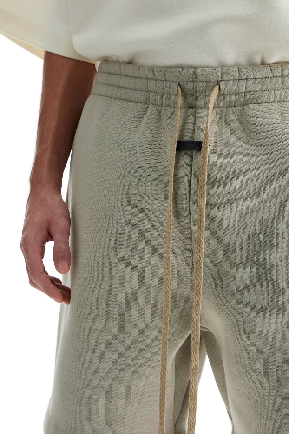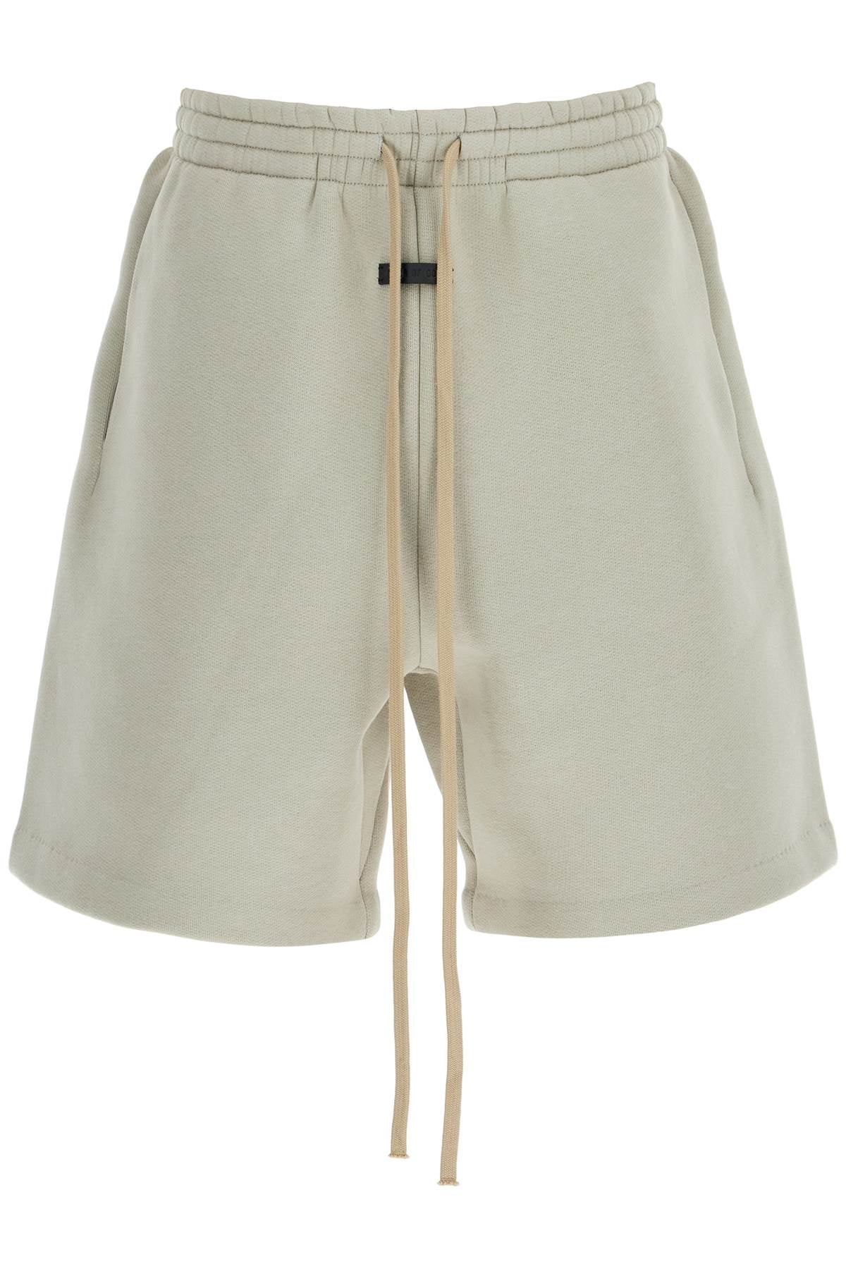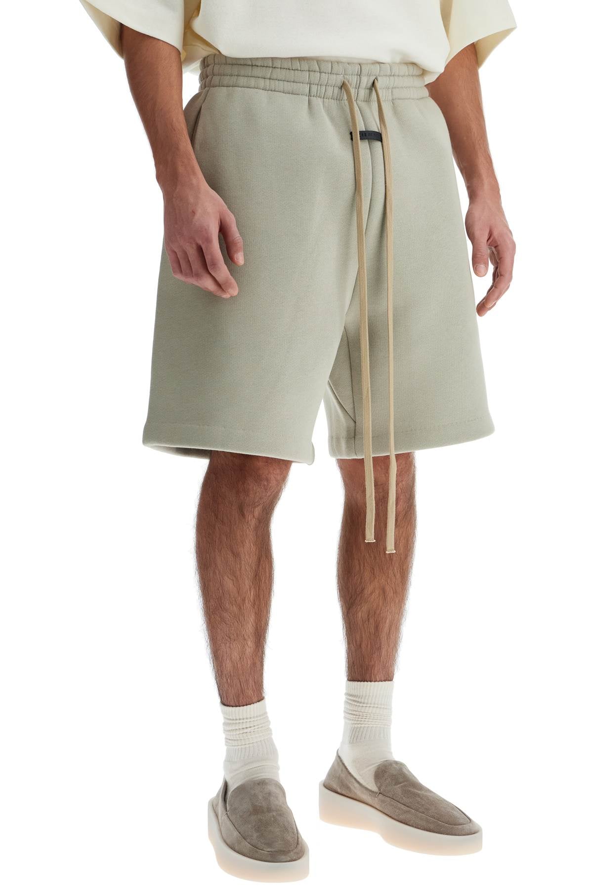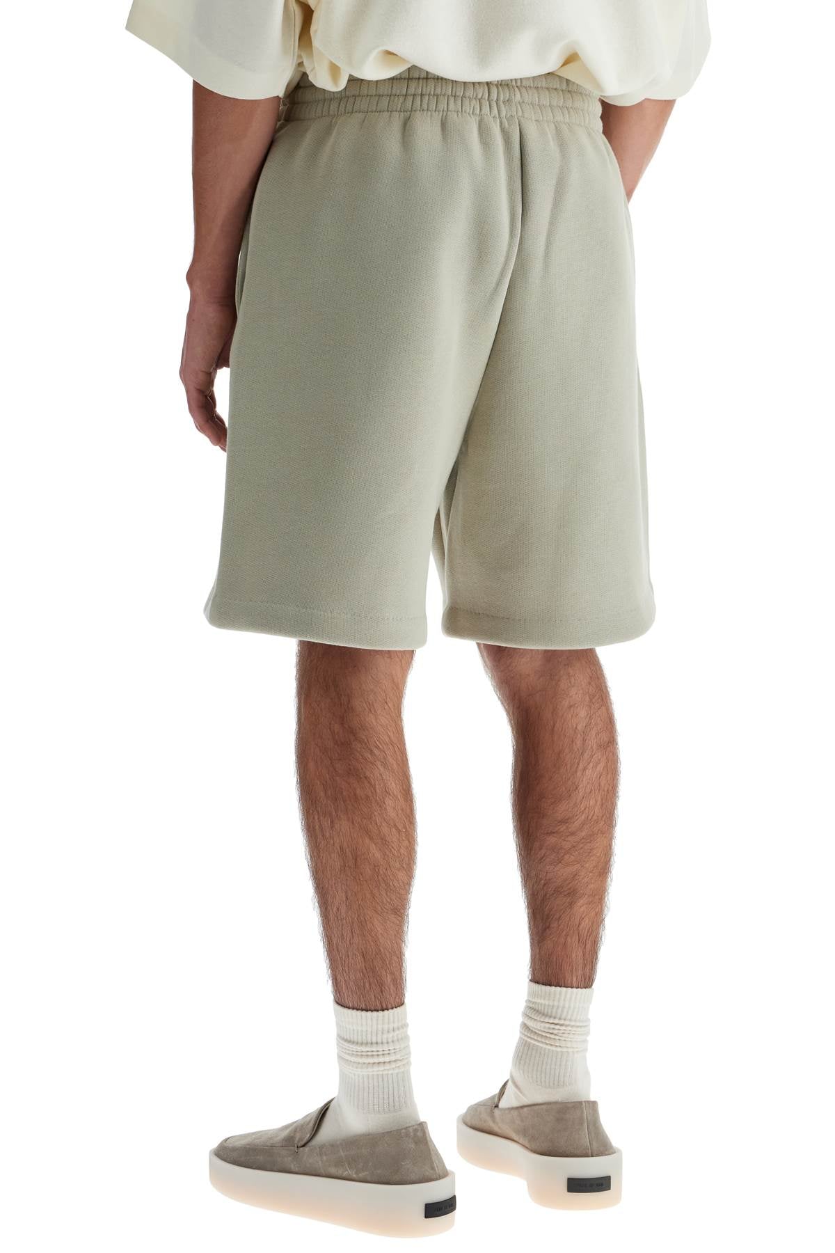 Fear of God's sporty Bermuda shorts are made from compact, technical cotton jersey with a soft fleece lining. They feature an elasticated waistband with a large drawstring and side pockets. The front is adorned with a leather logo patch. These shorts have a relaxed fit and the model is 182 cm tall and wears a size M.