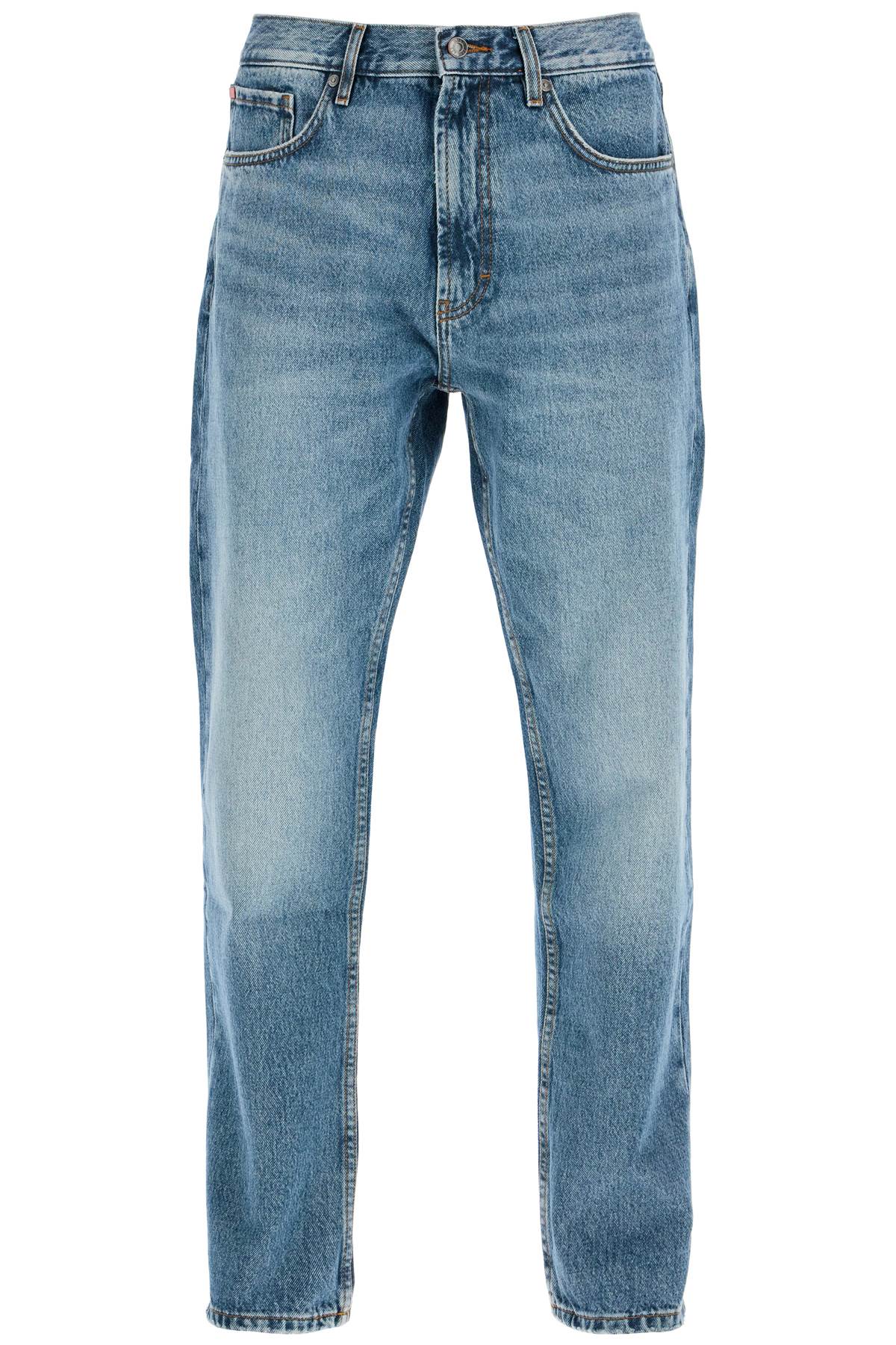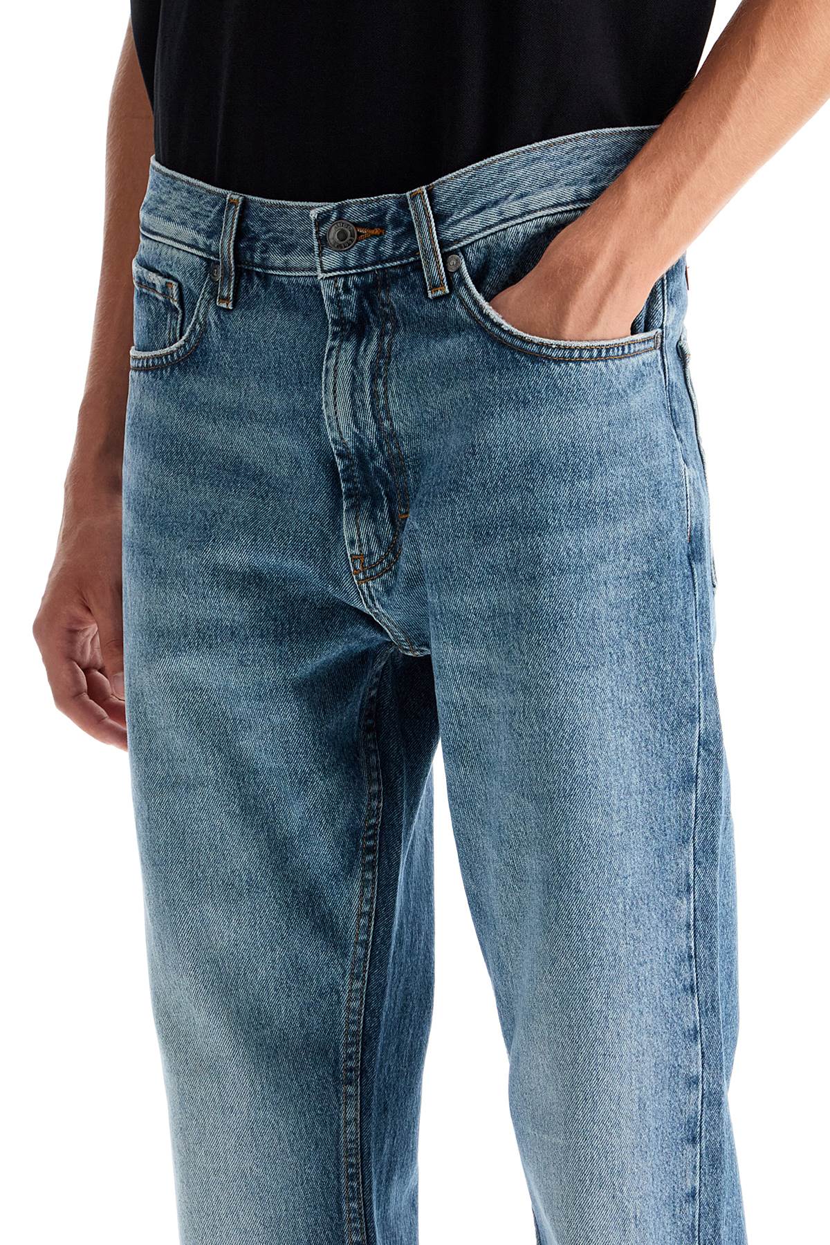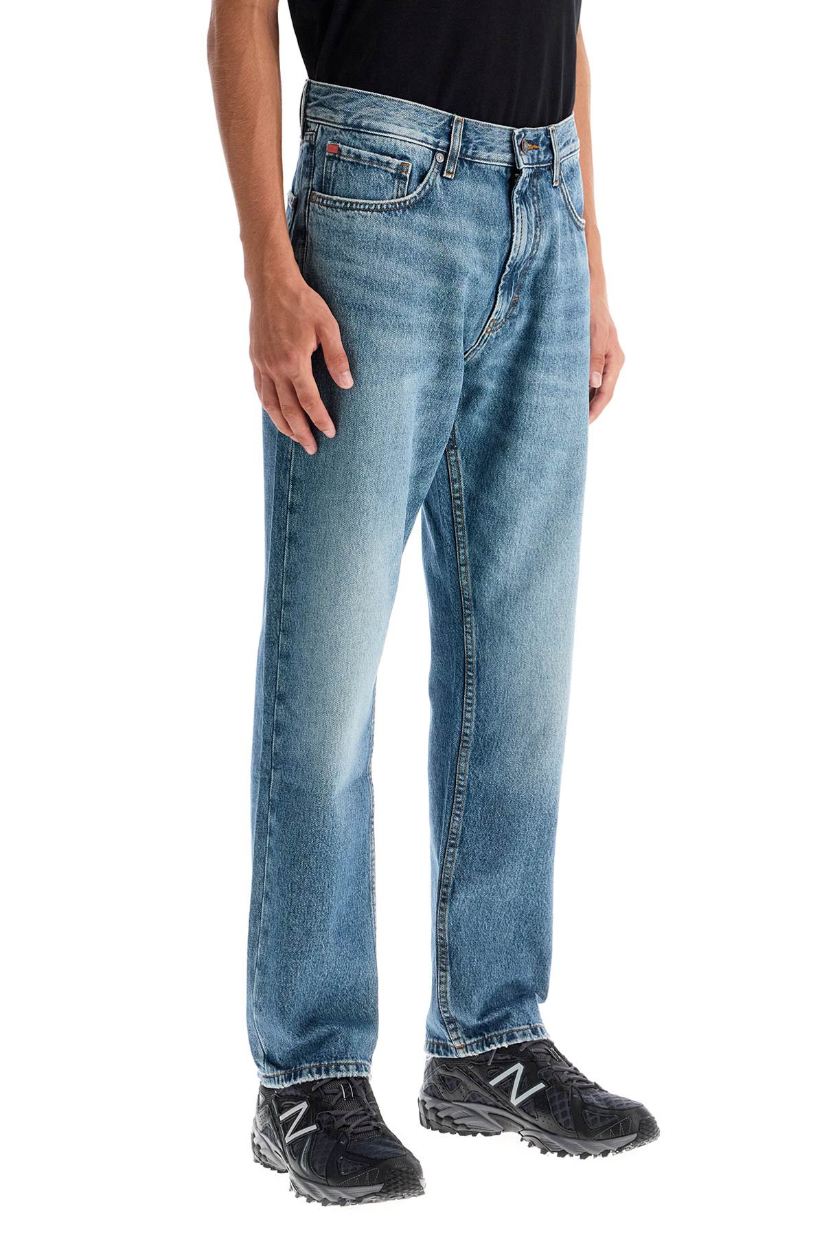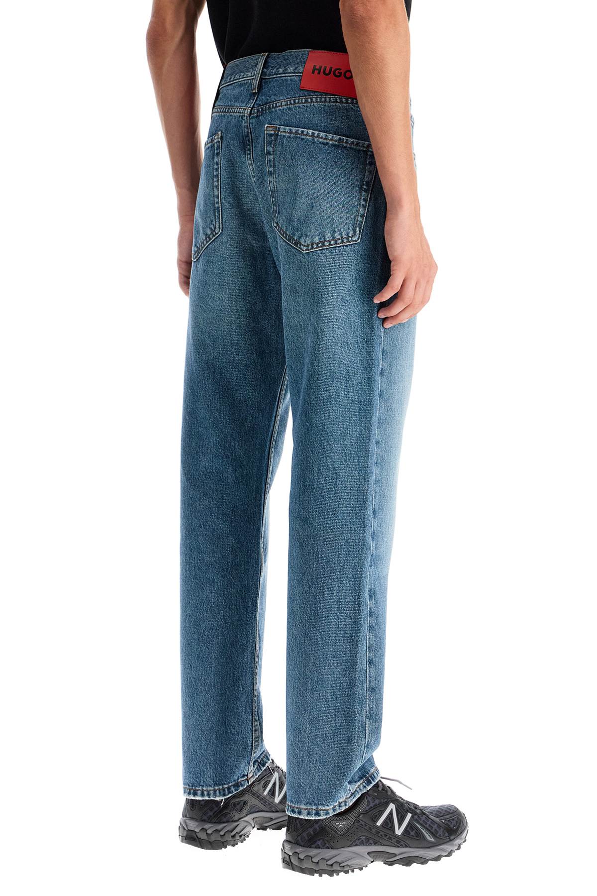 Hugo five-pocket jeans in distressed denim, featuring a regular fit with straight leg and low waist. Belt loops, zip and button closure. The model is 187 cm tall and wears size 31.