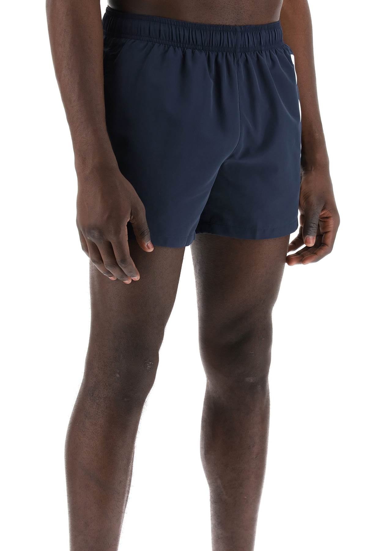 The Abas di Hugo women's Bermuda shorts are made from lightweight recycled polyester fabric with a large logo print on the side. They feature an elasticated waistband with internal drawstring, seam pockets, and a back patch pocket with velcro closure. The contrasting mesh lining adds a stylish touch. The model is 187 cm tall and wears a size M.