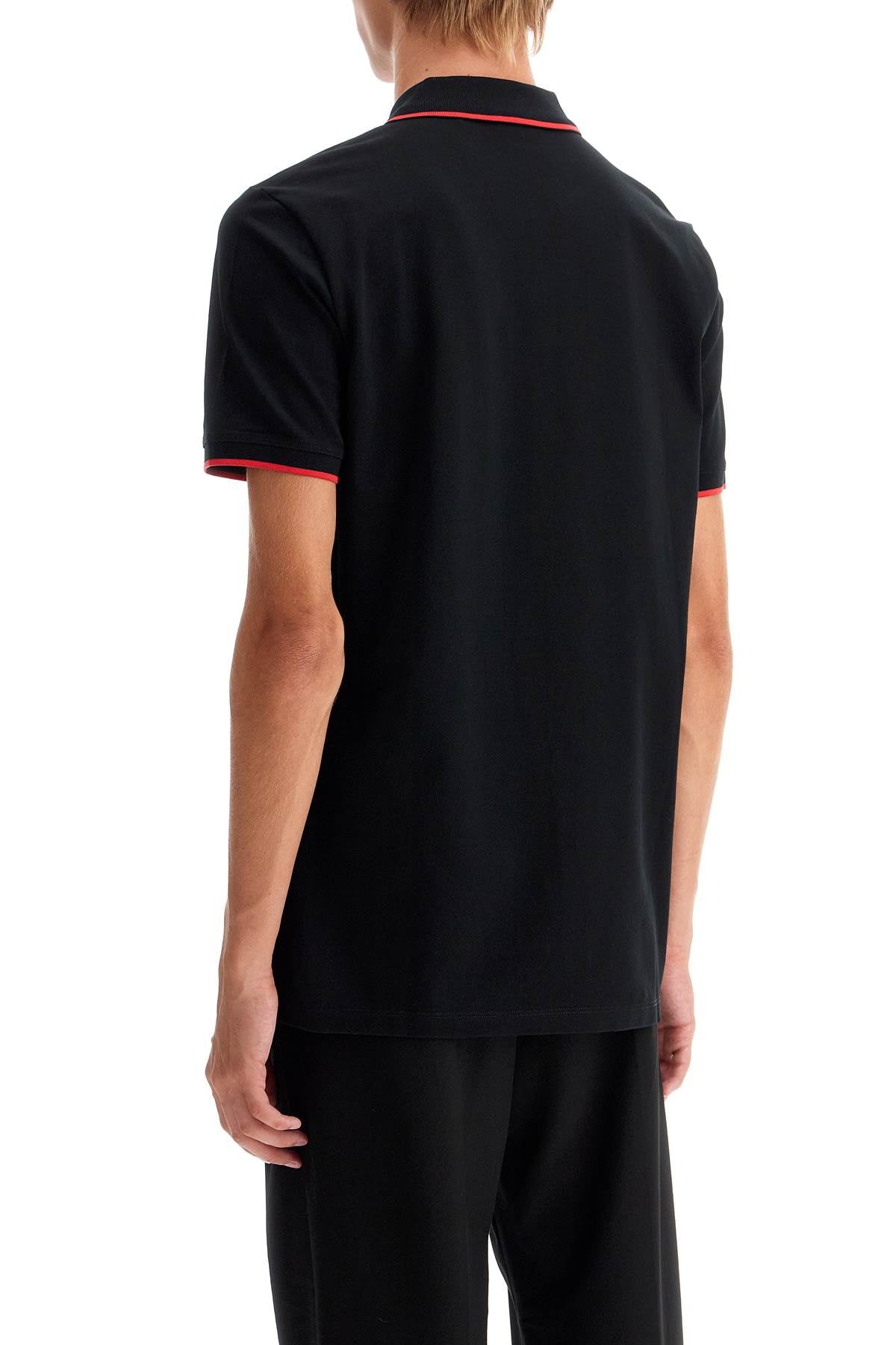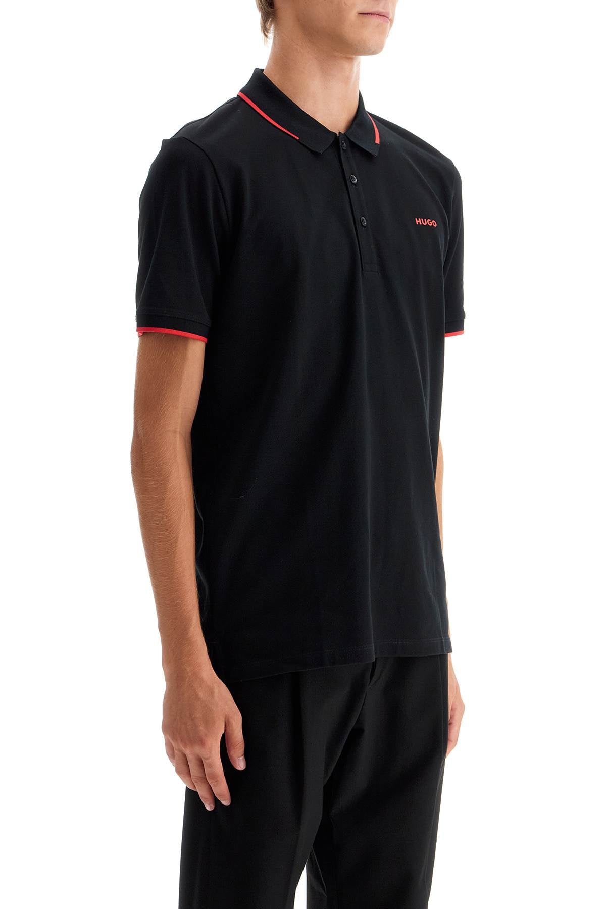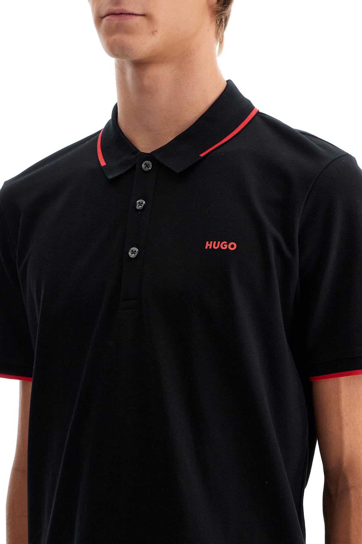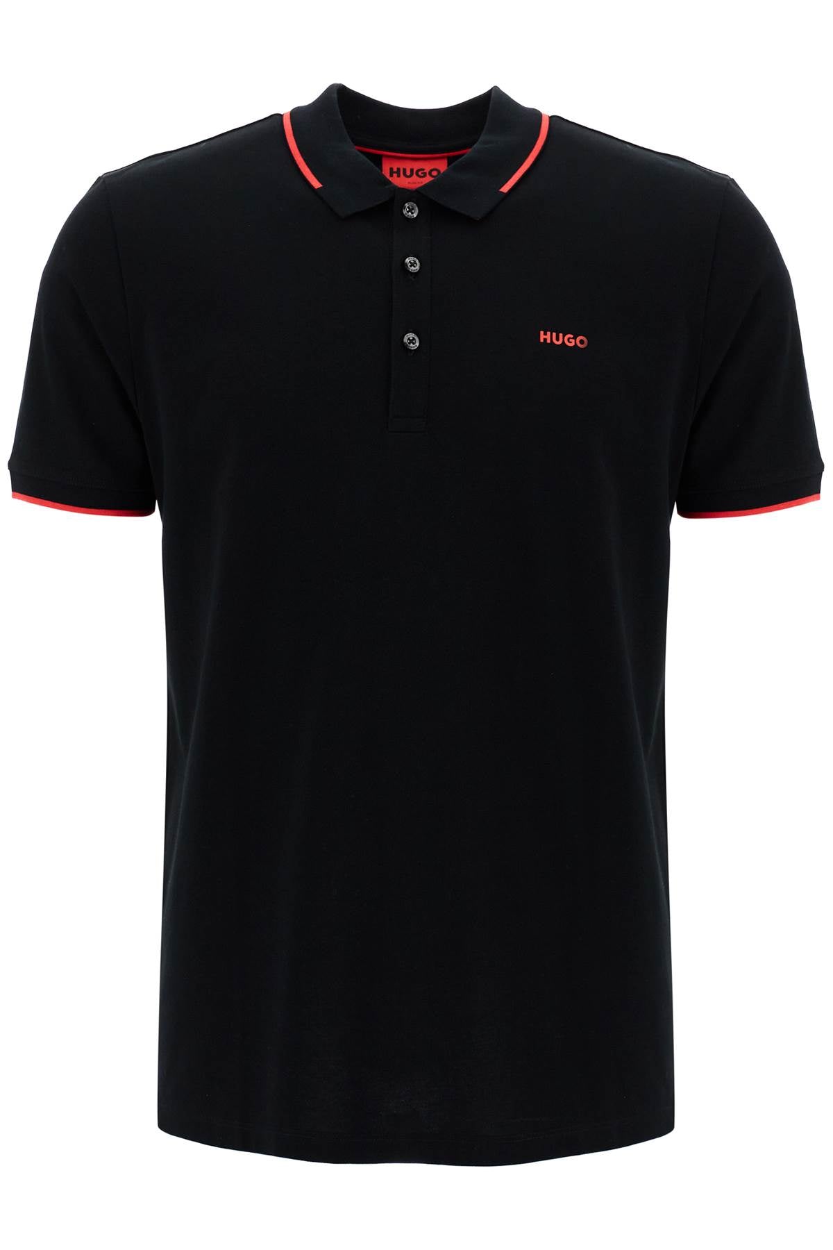 The Hugo slim fit polo is made of cotton piqué with a contrasting ribbed collar and sleeve cuffs. It features a small rubber logo on the chest, three-button closure, and side slits at the bottom. The model is 187 cm tall and wears size L.
