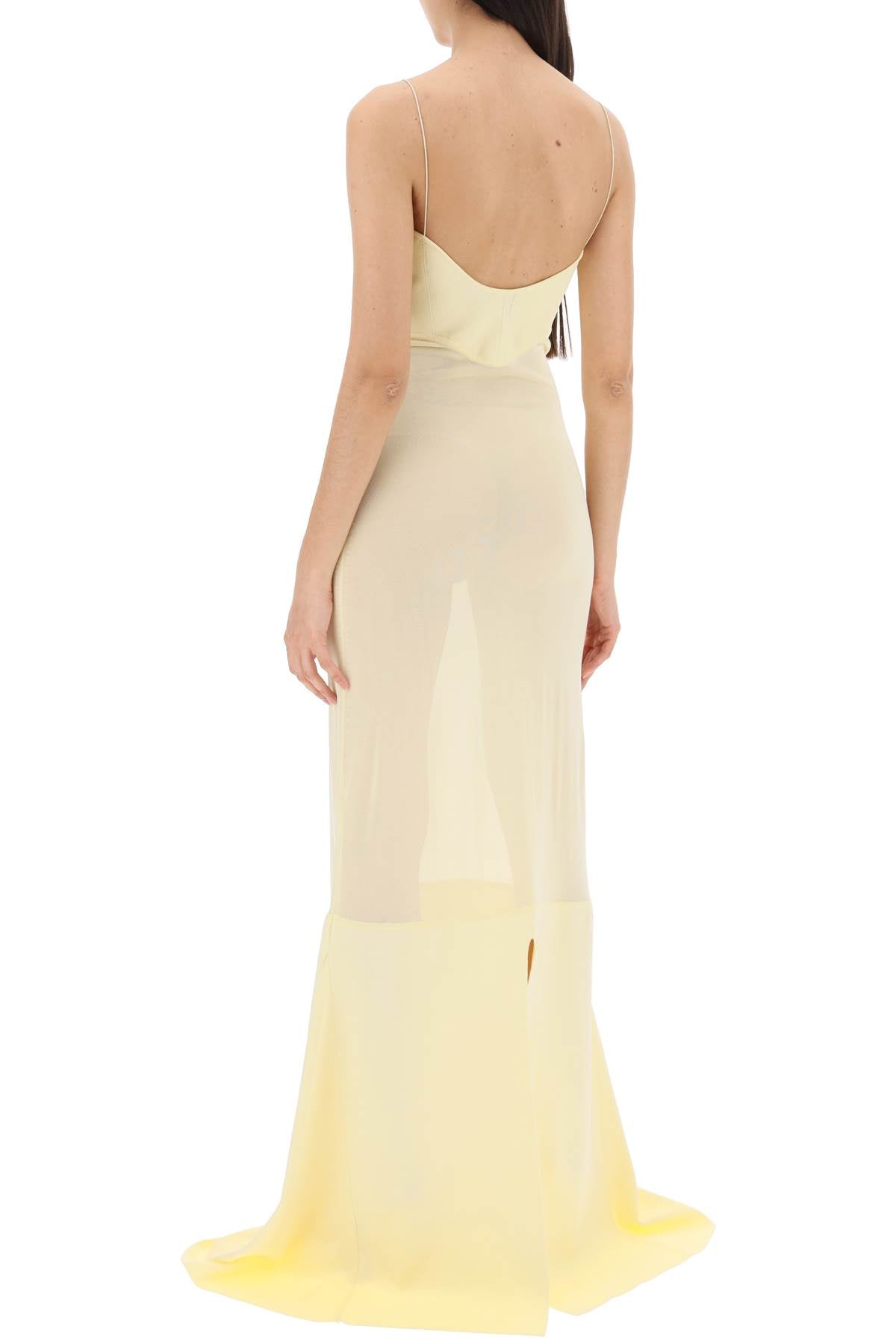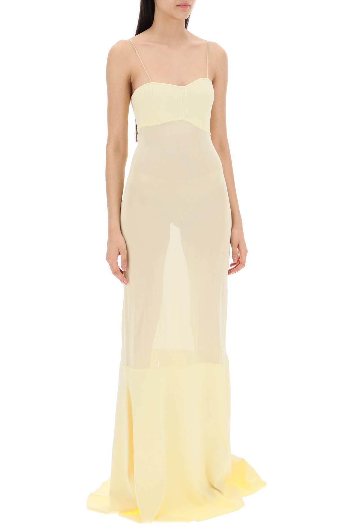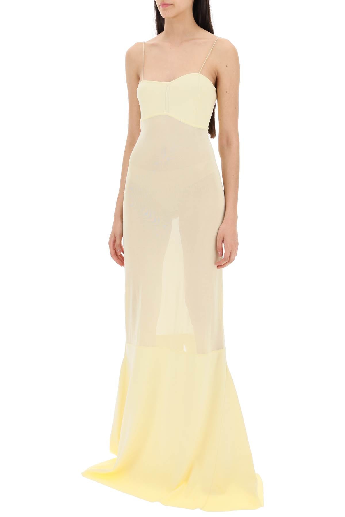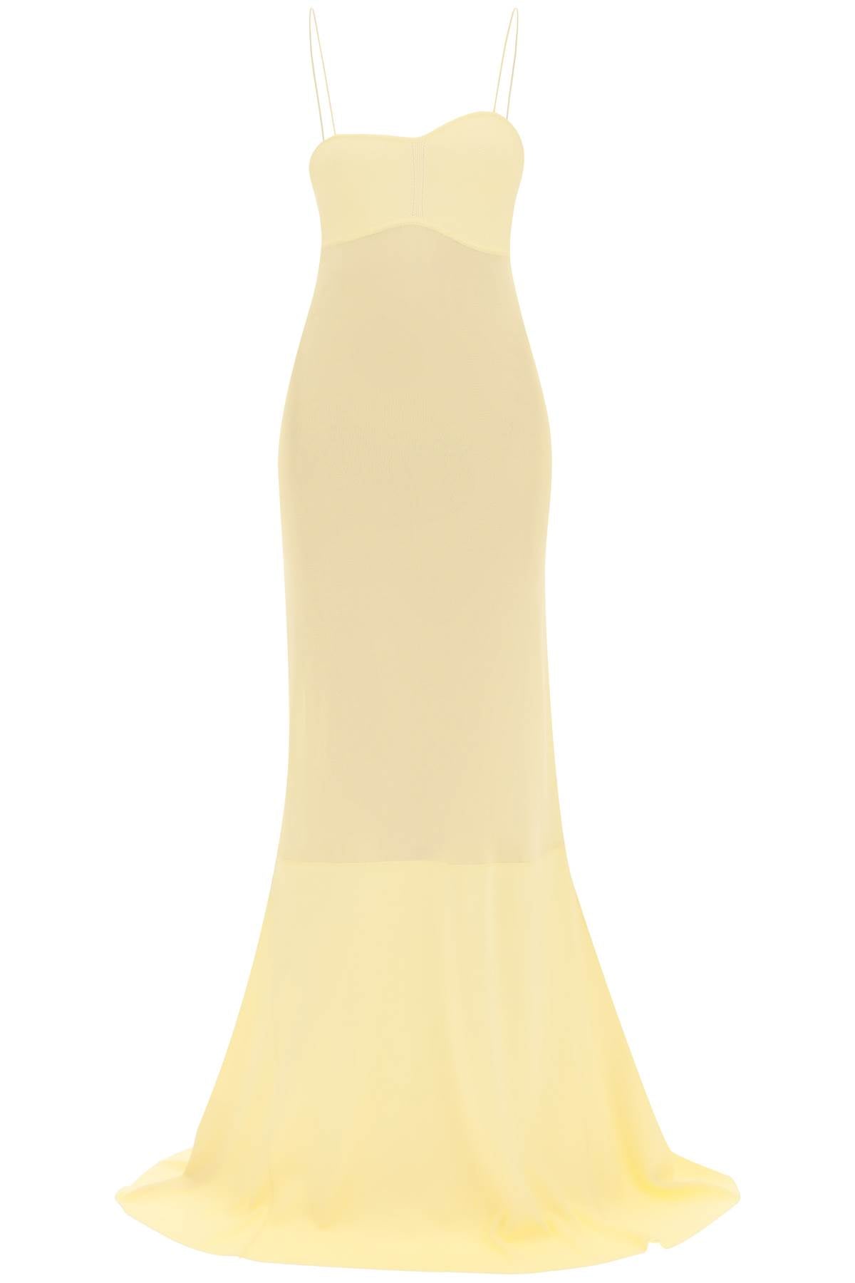 This fine Jacqemus dress is made of stretch viscose blend, with a veiled mermaid design and heavier knit on the chest and bottom. It features a sweetheart neckline, thin straps, and a slit at the back. The model is 177 cm tall and wears size FR 36.