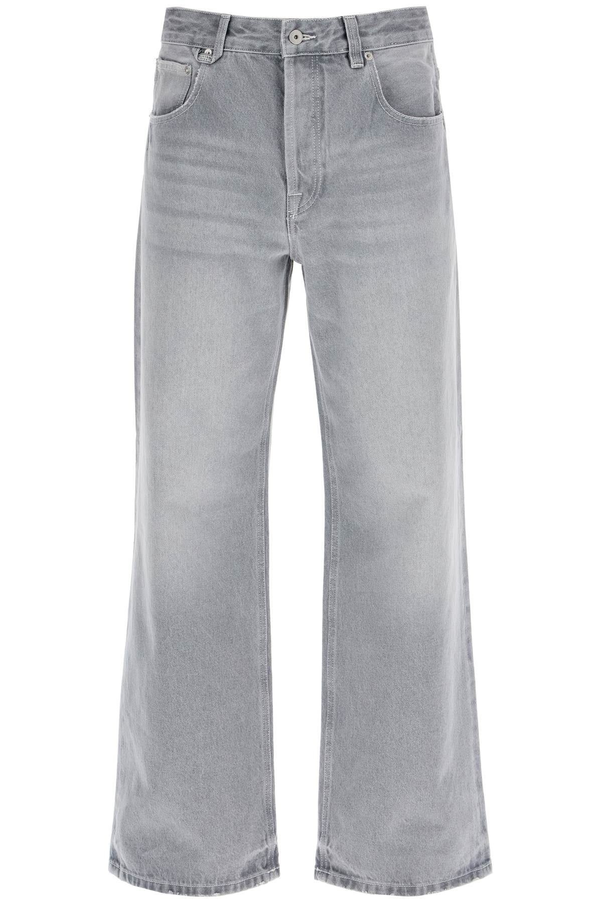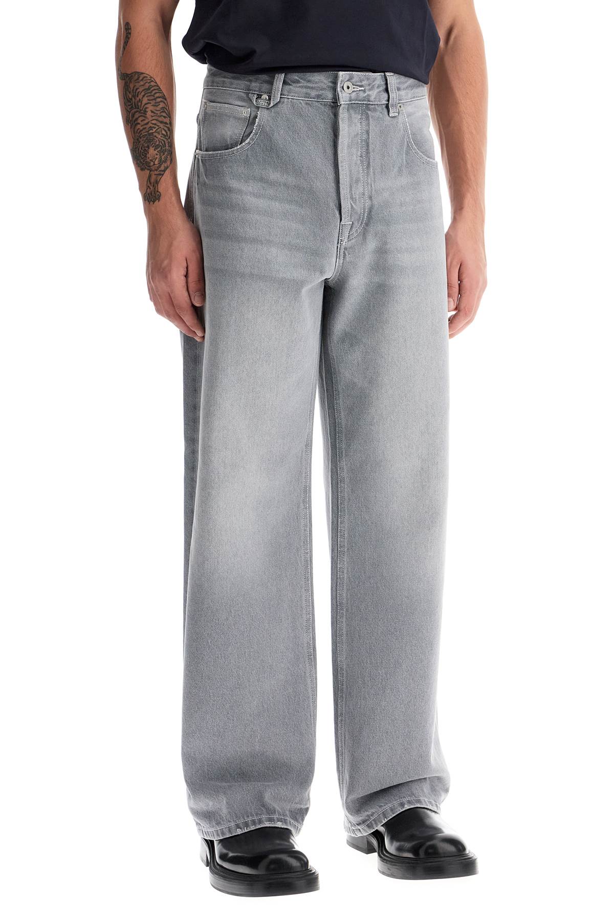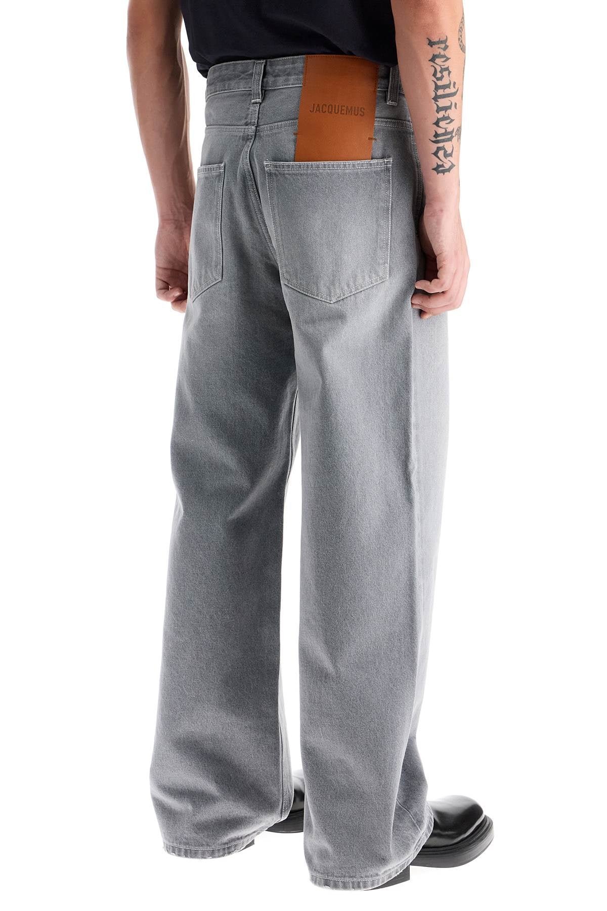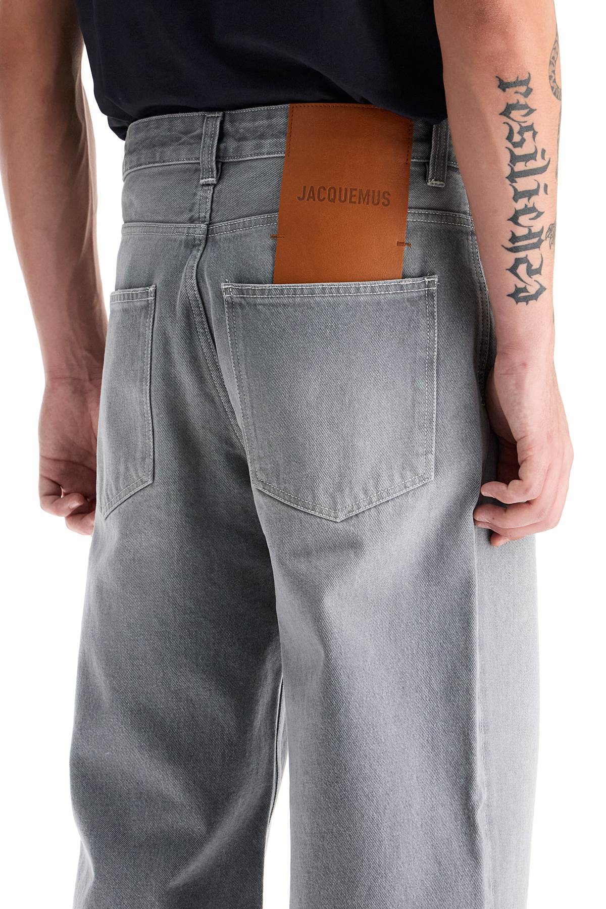 The Jacquemus baggy jeans in washed grey denim are finished with a J loop at the waist and a large branded leather patch on the back. The five-pocket style features a button closure with flap and distressed details on the hem. The model is 182 cm tall and wears size 30.