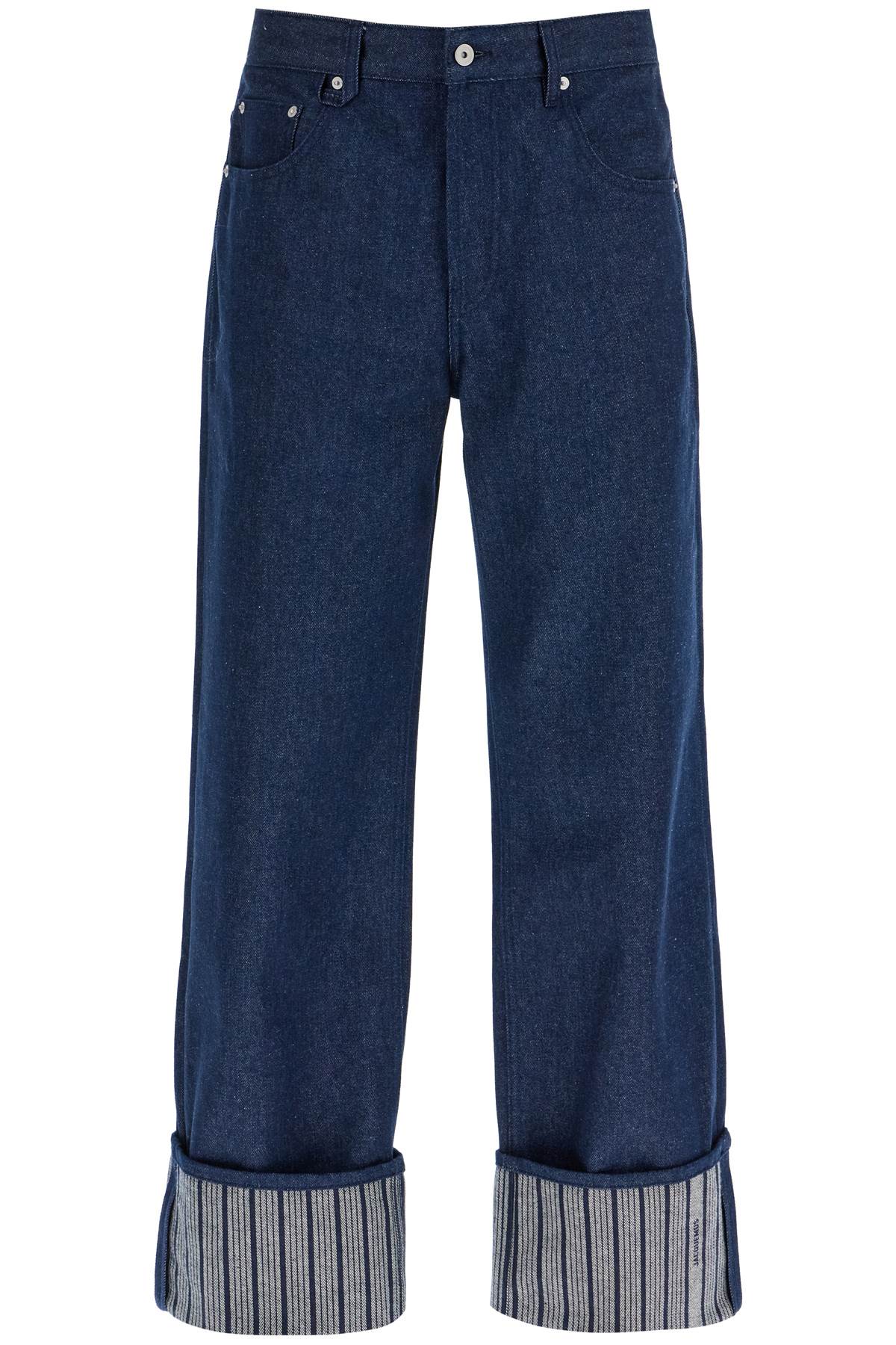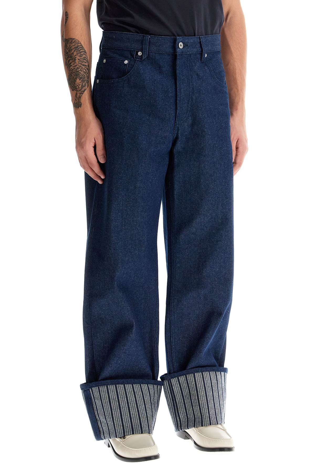 Jacquemus five-pocket jeans with a baggy fit, featuring a maxi cuff decorated with a striped pattern. They have a button and flap closure, iconic J loop at the waist, and a large leather jacron with logo on the back. The model is 182 cm tall and wears size 30.