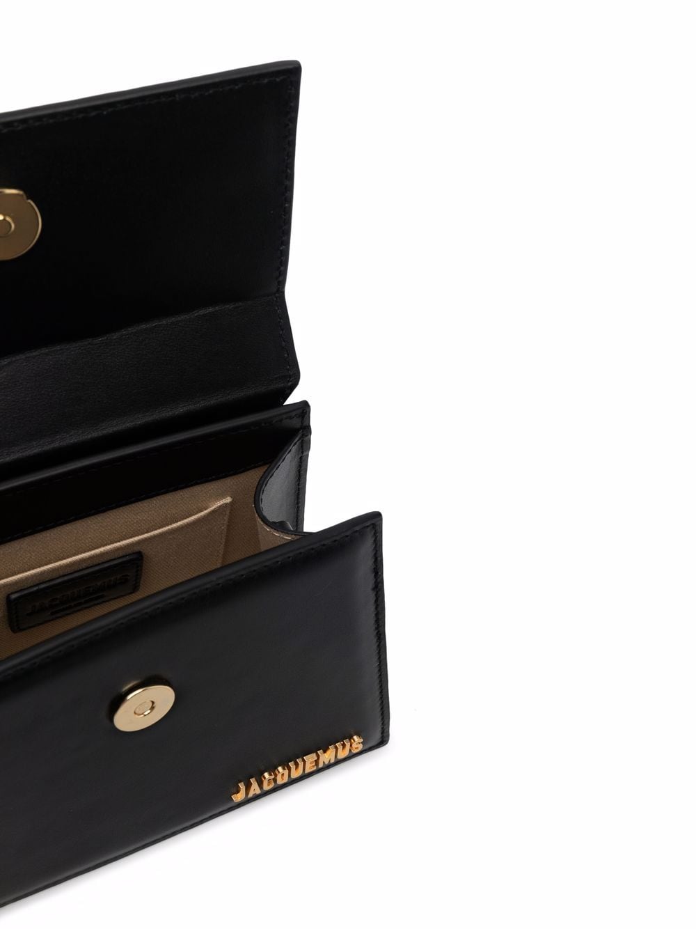 Black leather Le Chiquito Noeud mini bag from JACQUEMUS featuring gold-tone logo lettering, foldover top with magnetic fastening, detachable shoulder strap, single circular top handle and internal card slot. Size and Fit - Width 7,09 in / 18 cm Height 5,31 in / 13,5 cm Depth 3,15 in / 8 cm Handle 4,33 in / 11 cm Strap 23,23 in / 59 cm
