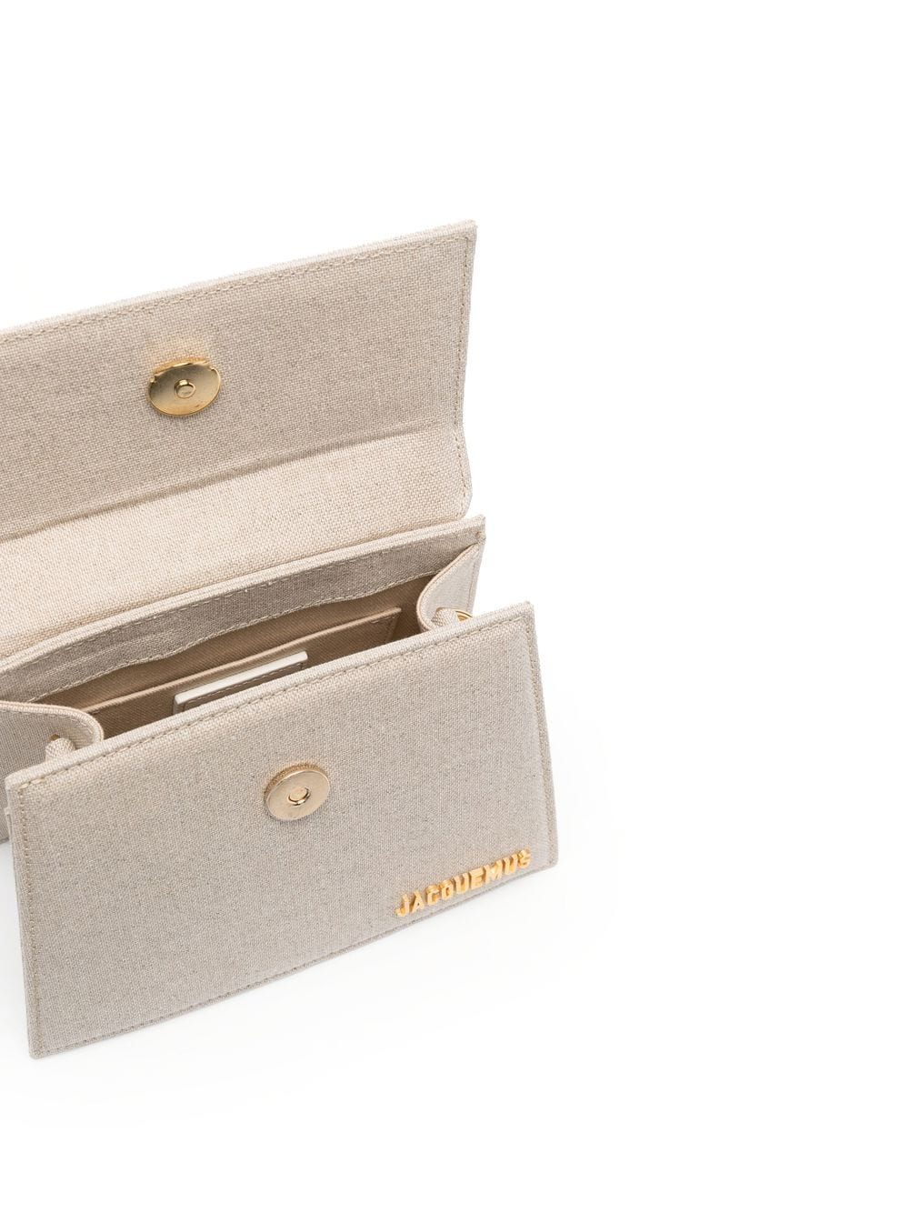 Le Chiquito Moyen cannvas tote bag from Jacquemus featuring light beige, cotton, canvas, gold-tone logo lettering, detachable shoulder strap, two rounded top handles, foldover top and main compartment. Size and Fit - Width 6,69 in / 17 cm Height 5,12 in / 13 cm Depth 3,15 in / 8 cm Handle 5,51 in / 14 cm Strap 23,23 in / 59 cm