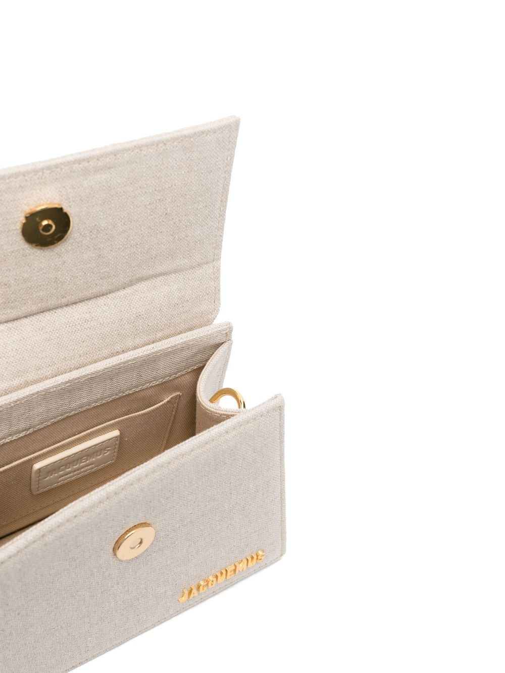 Le Chiquito Noeud canvas tote bag from Jacquemus featuring light grey, cotton, canvas, gold-tone logo lettering, foldover top with magnetic fastening, main compartment, internal slip pocket, adjustable detachable shoulder strap and coiled top handle. Size and Fit - Height 5,12 in / 13 cm Depth 2,76 in / 7 cm Handle 3,15 in / 8 cm Strap 21,65 in / 55 cm