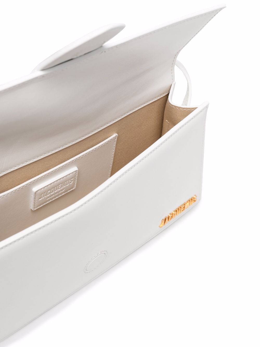 Bright-white leather Le Bambino Long tote bag from JACQUEMUS featuring gold-tone hardware, logo plaque, single shoulder strap and foldover top with magnetic fastening. Size and Fit - Width 11,02 in / 28 cm Height 5,31 in / 13,5 cm Handle 7,87 in / 20 cm