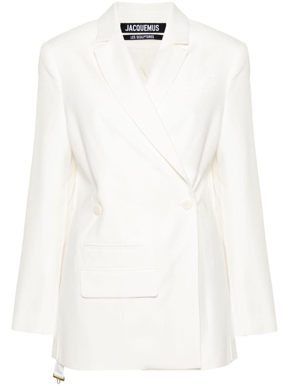 white crepe texture stretch-design notched lapels double-breasted button fastening shoulder pads long sleeves split cuffs chest welt pocket jetted pocket front flap pocket English rear vents full lining straight hem Size and Fit - This piece fits true to size. We recommend you get your regular size. Model is 1,75m / 5ft 8in wearing size 36 (FR)