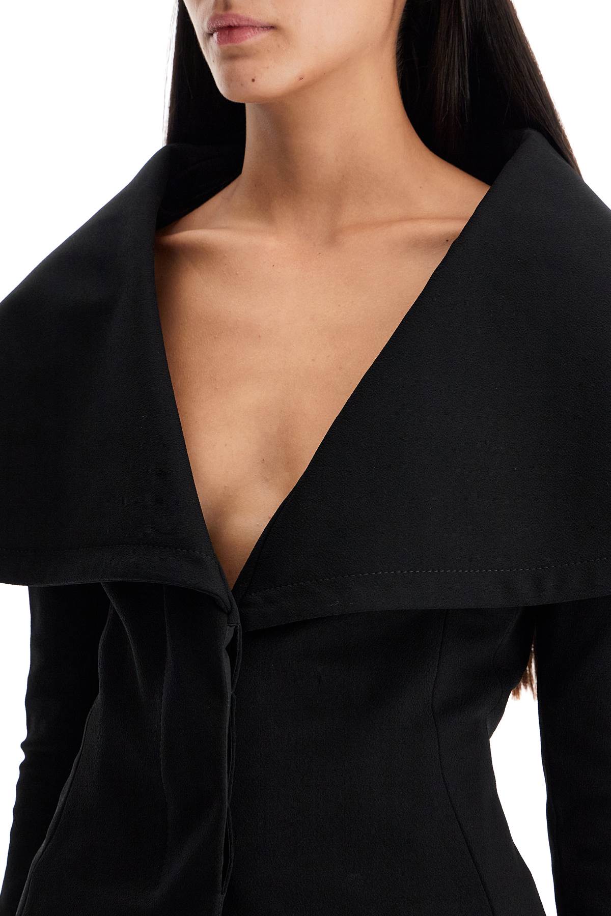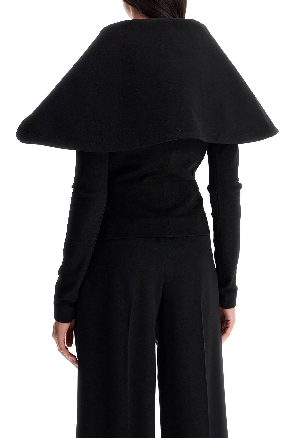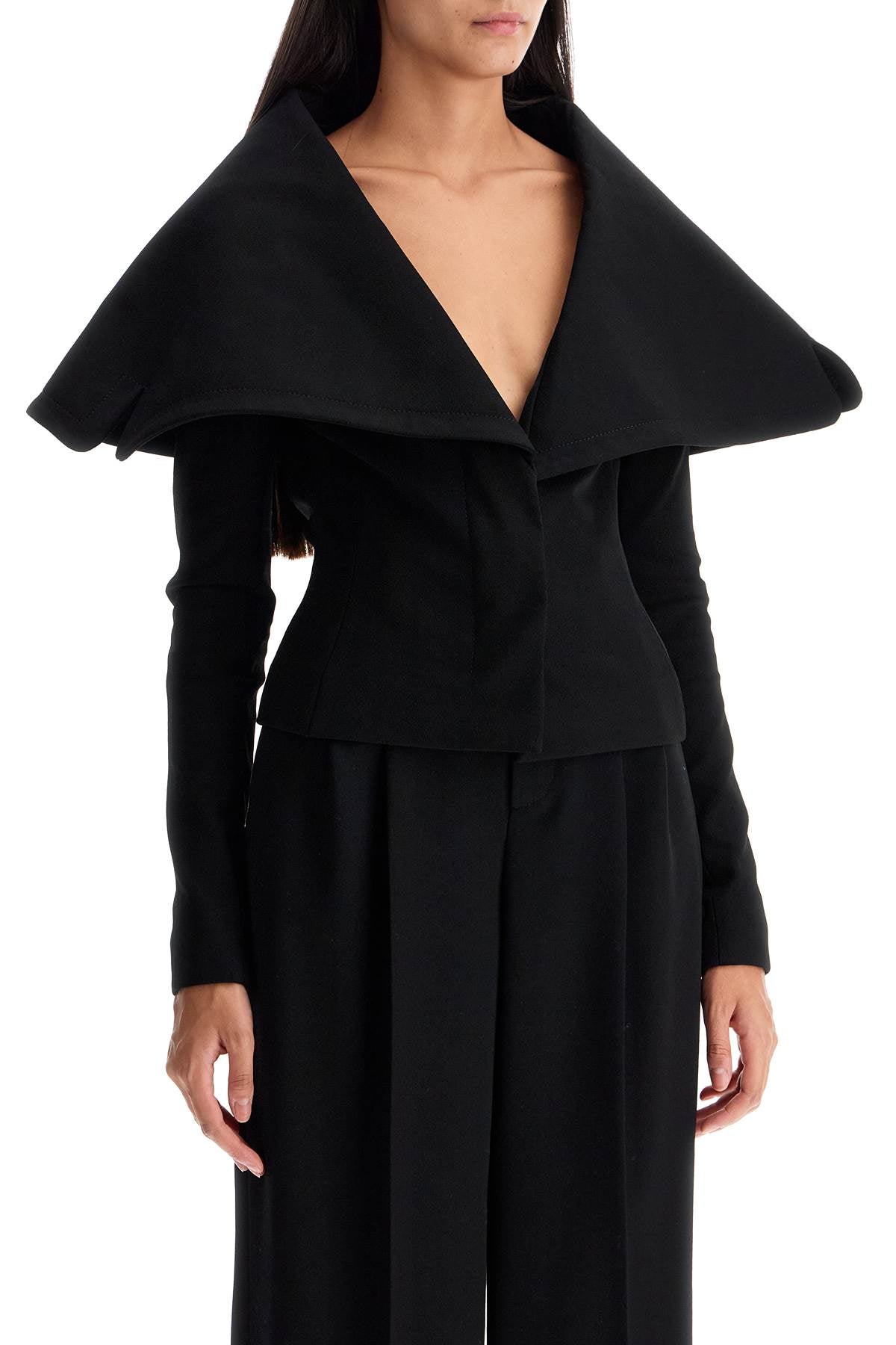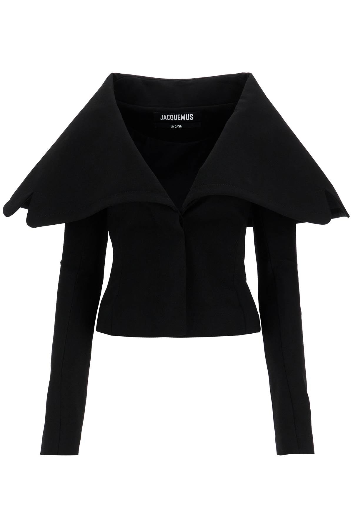 This Jacquemus single-breasted blazer is characterized by a fitted silhouette with a maxi folded collar and embellished with scalloped side details. Made of stretch jersey crêpe, the garment is closed with hidden buttons and fully lined. The model is 177 cm tall and wears size FR 36.