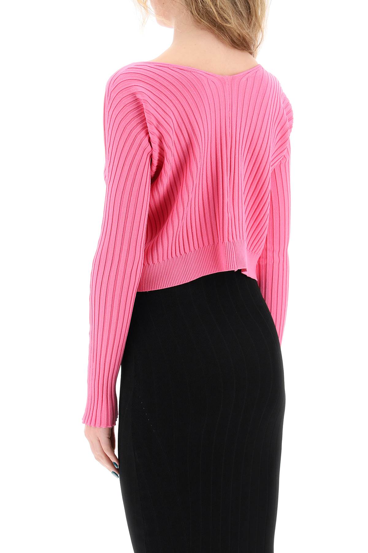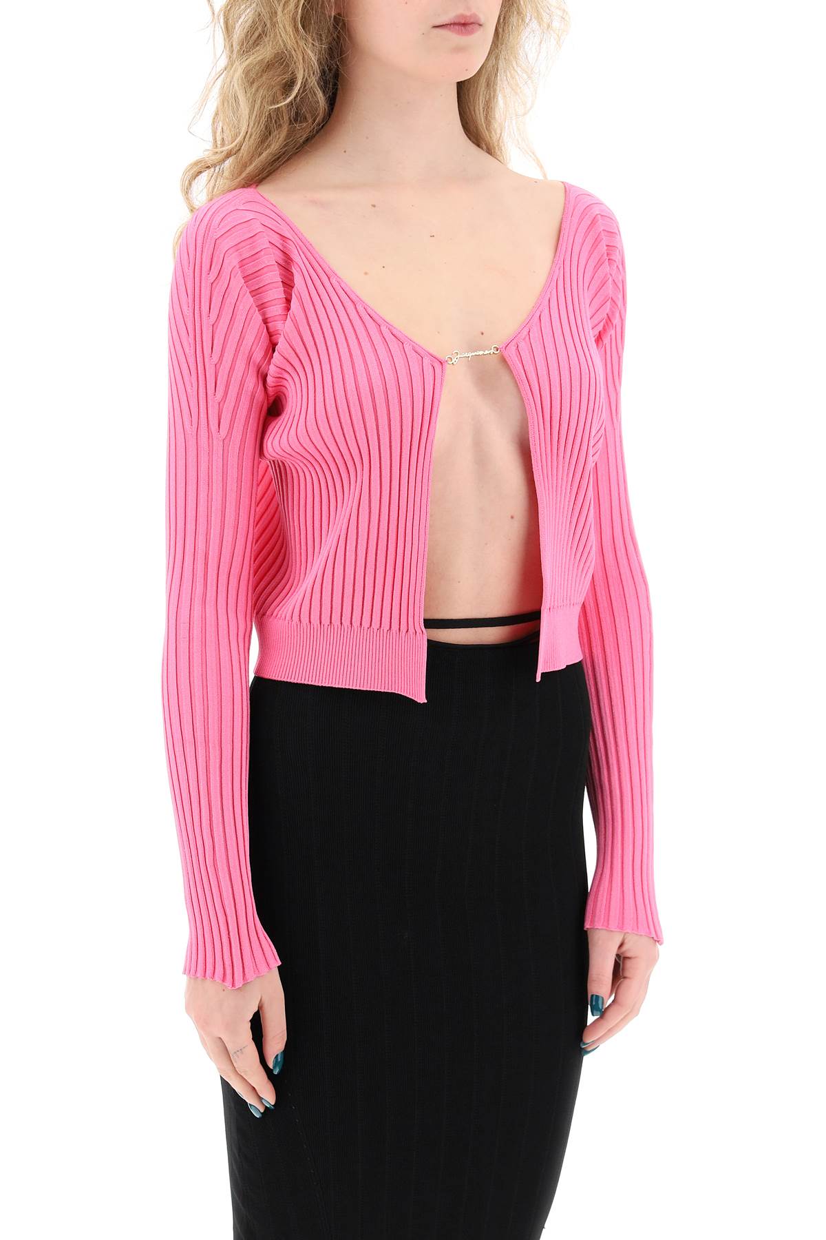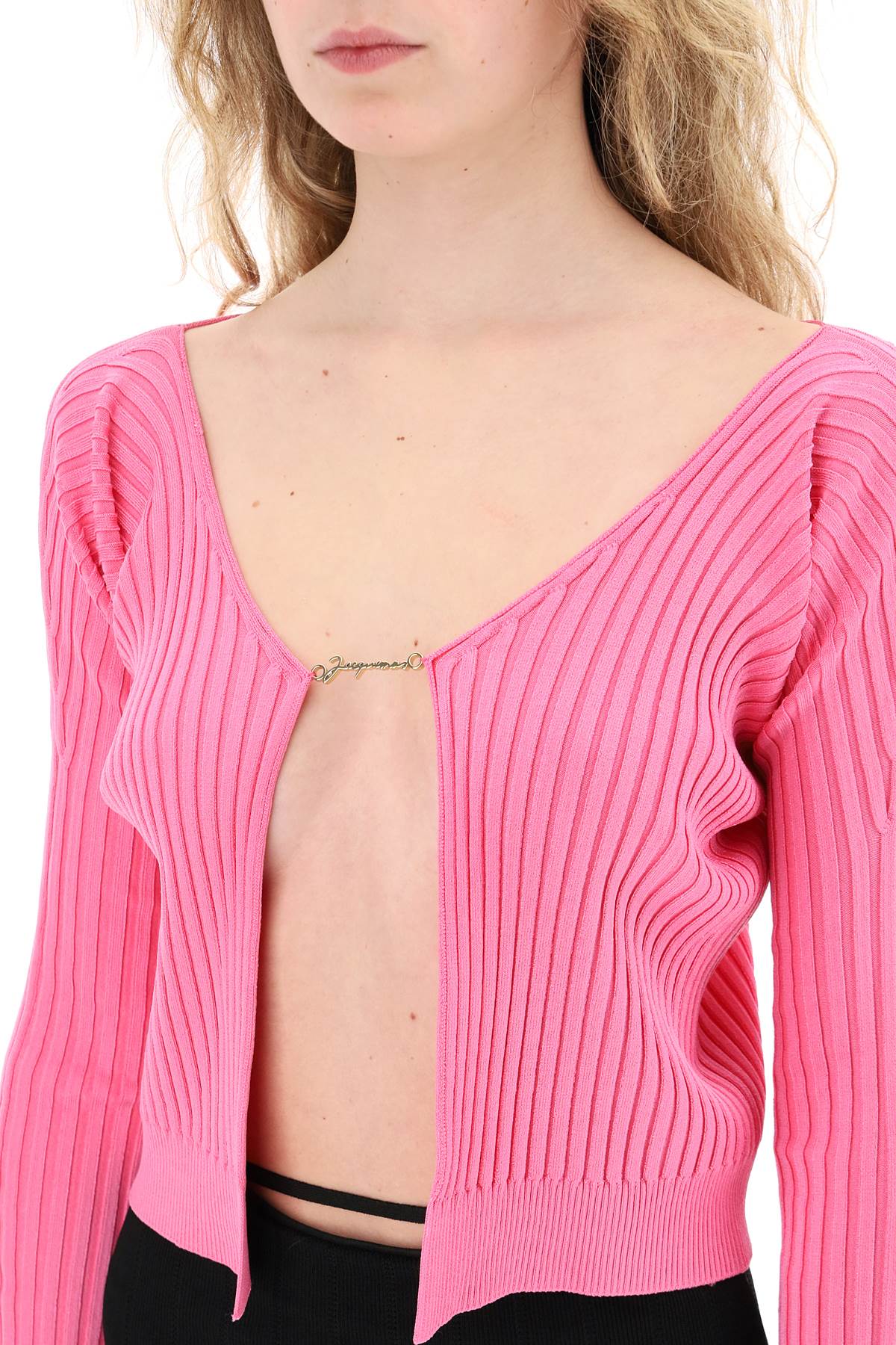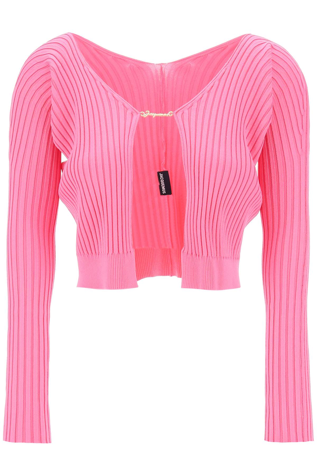 Jacquemus long-sleeved fitted cardigan made from ribbed viscose blend knit with a seamless design. It features a fixed gold-tone metal logo element at the center chest. Ribbed hem. The model is 177 cm tall and wears a size FR 36.