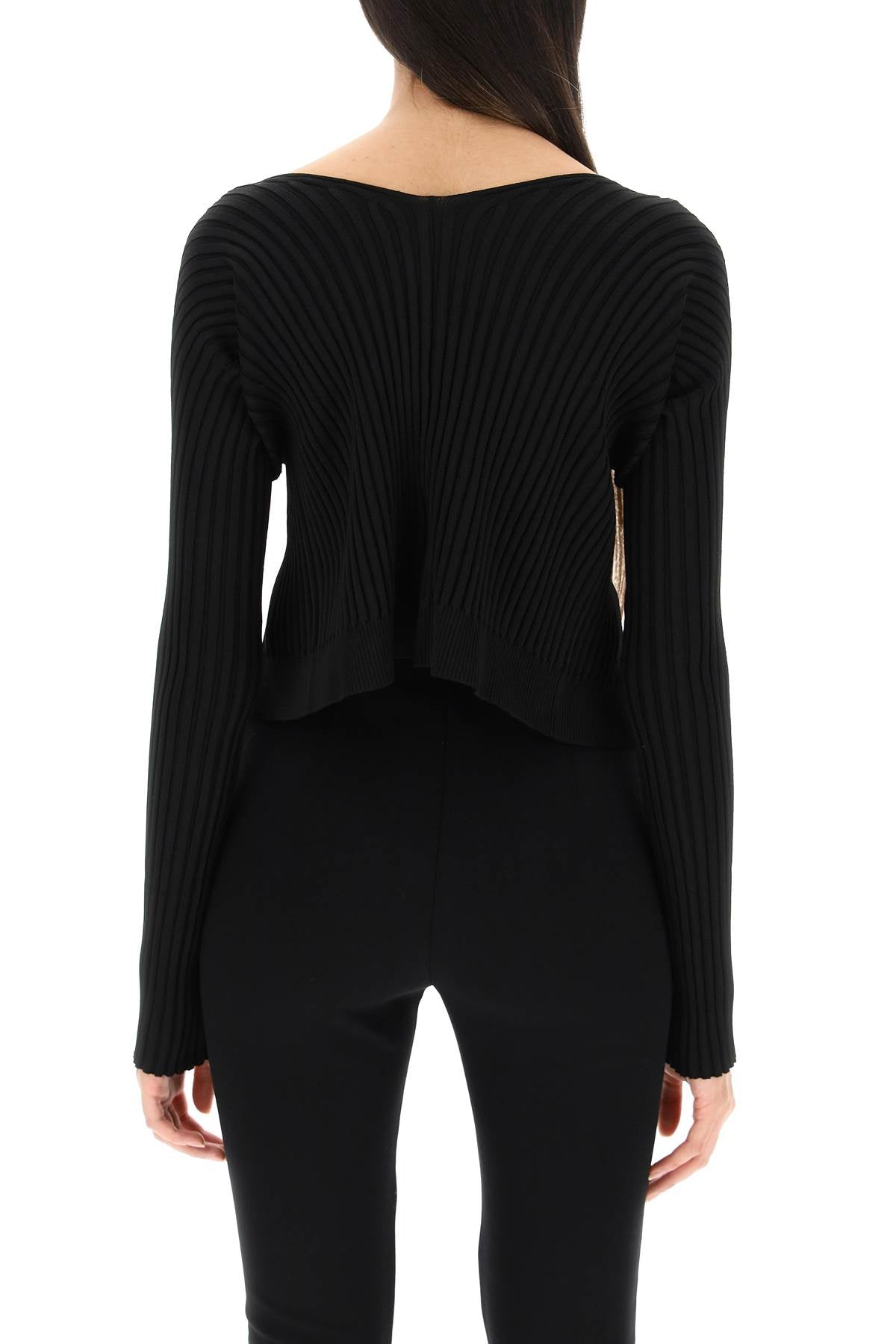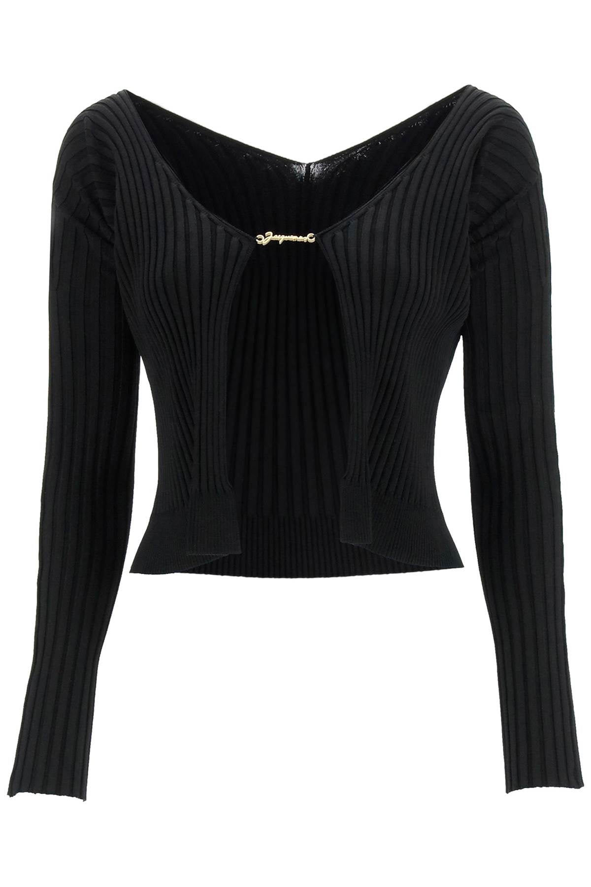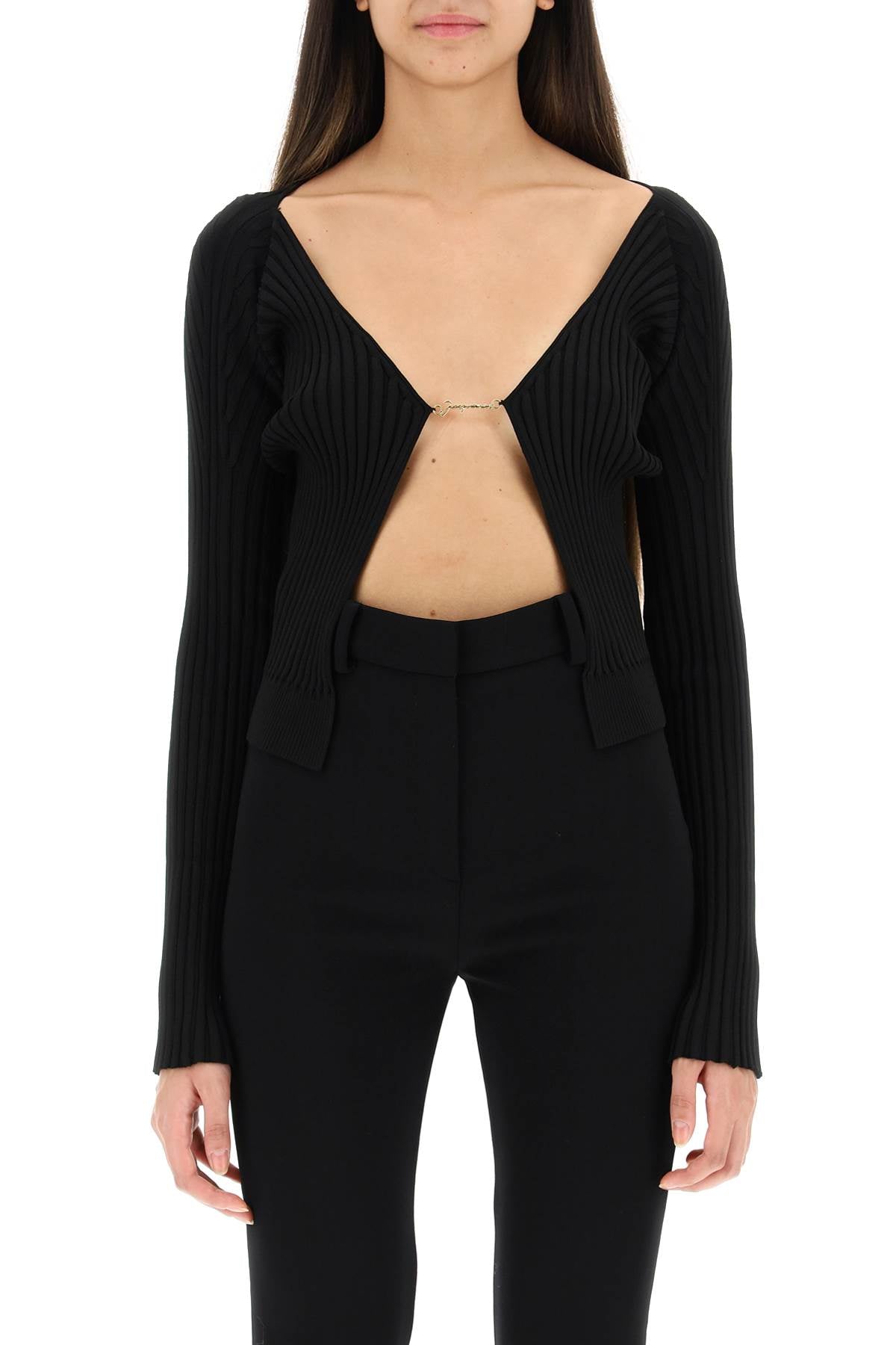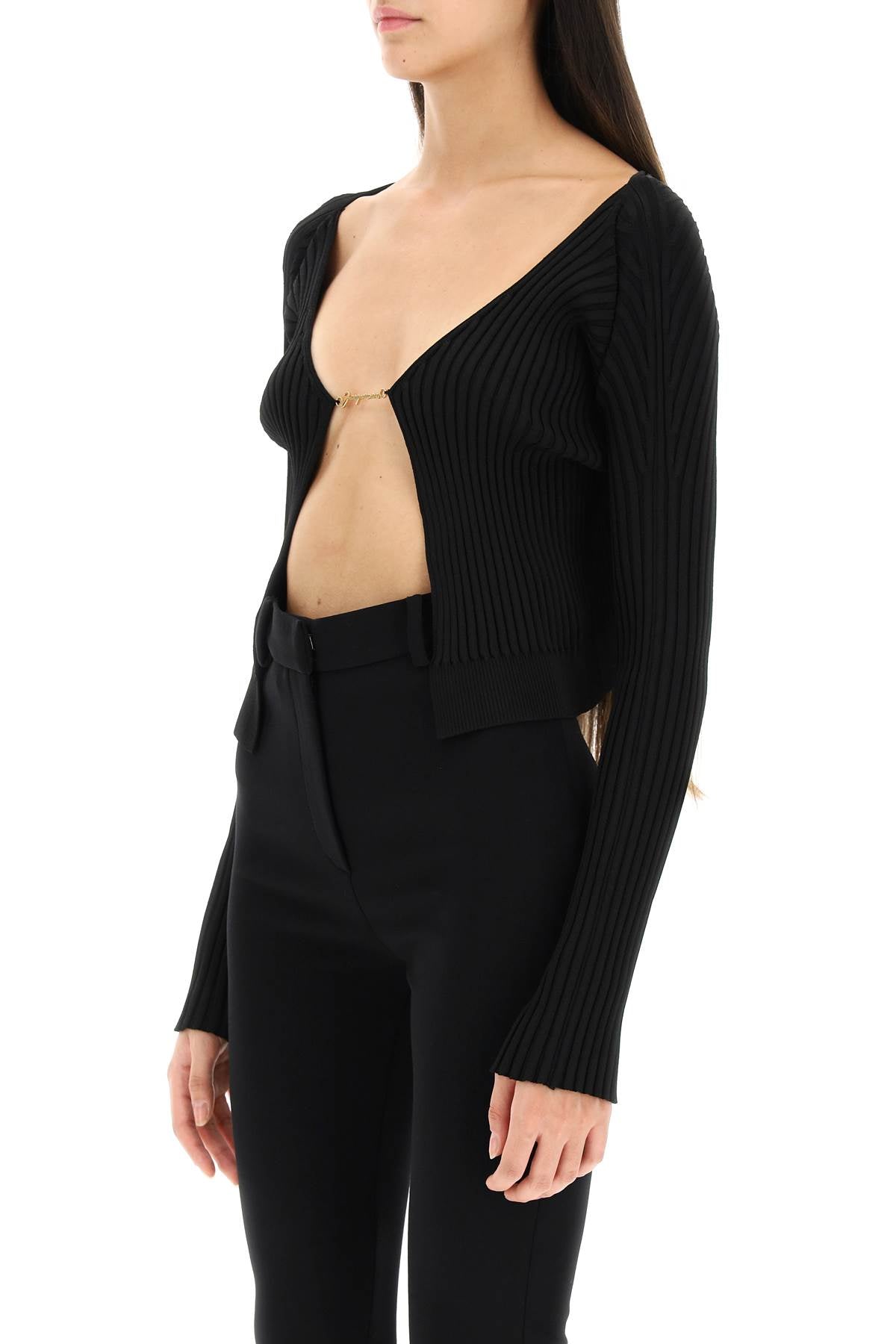 Jacquemus long-sleeved fitted cardigan made from ribbed viscose blend knit with a seamless design. It features a fixed gold-tone metal logo element at the center chest. Ribbed hem. The model is 177 cm tall and wears a size FR 36.