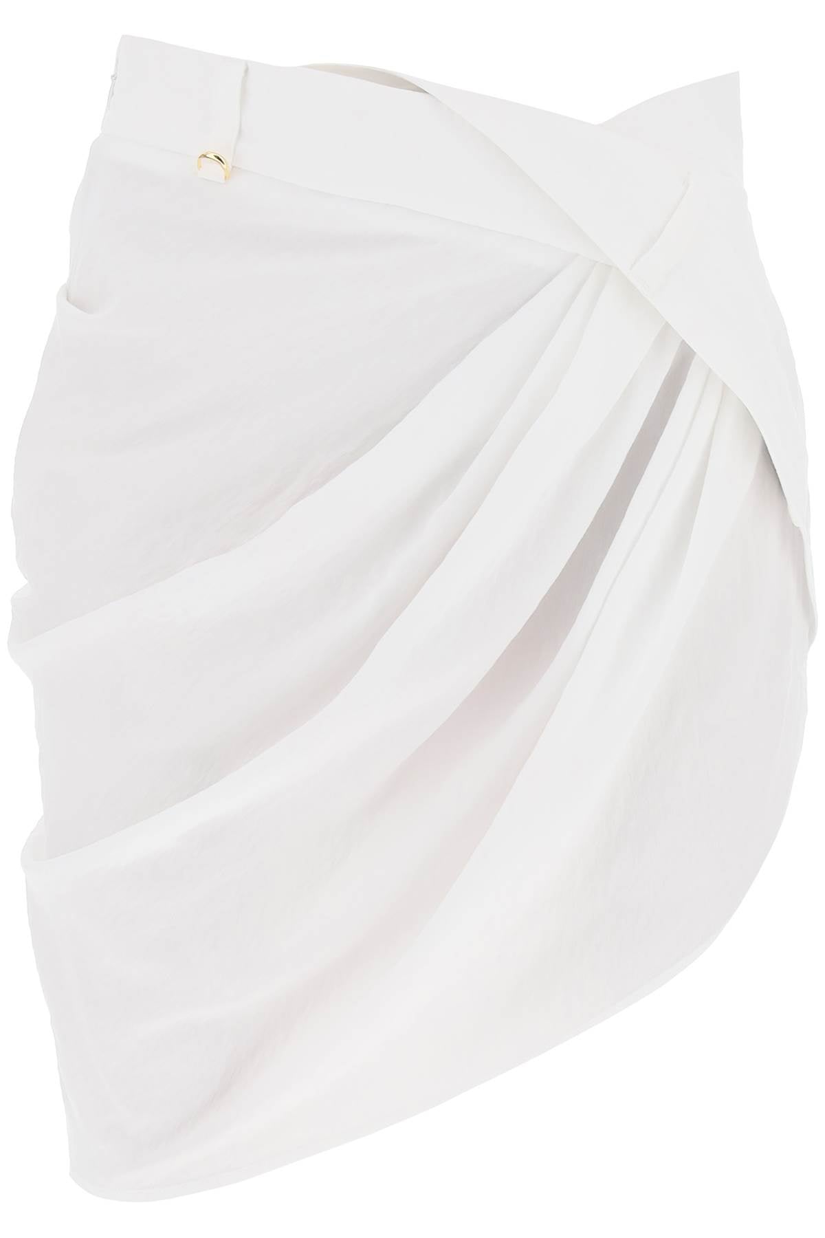 Draped mini skirt by Jacquemus made of textured viscose blend with twisted waist at front. Concealed side zip closure, belt loops featuring gold-finished metal D-ring at front and asymmetrical hem. High waist, slim fit. The model is 177 cm tall and wears a size FR 36.