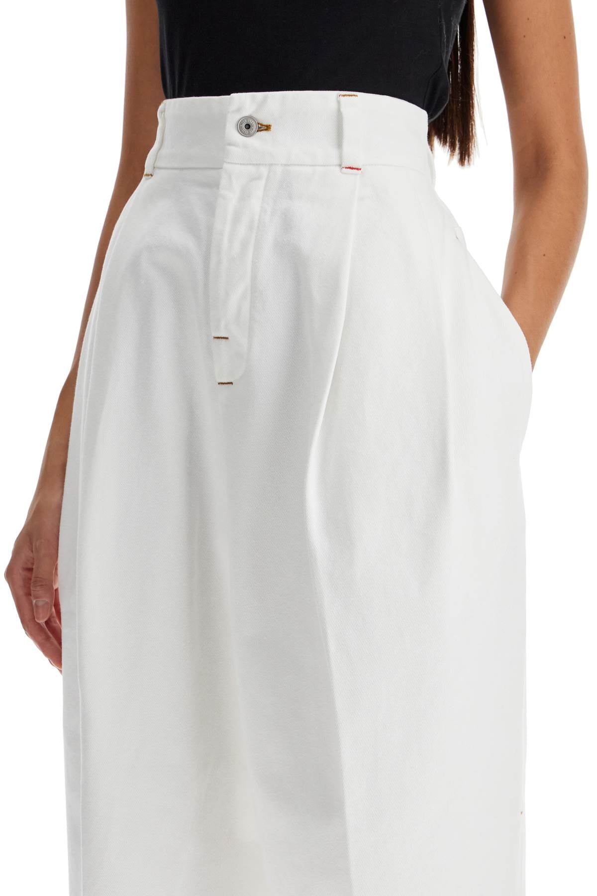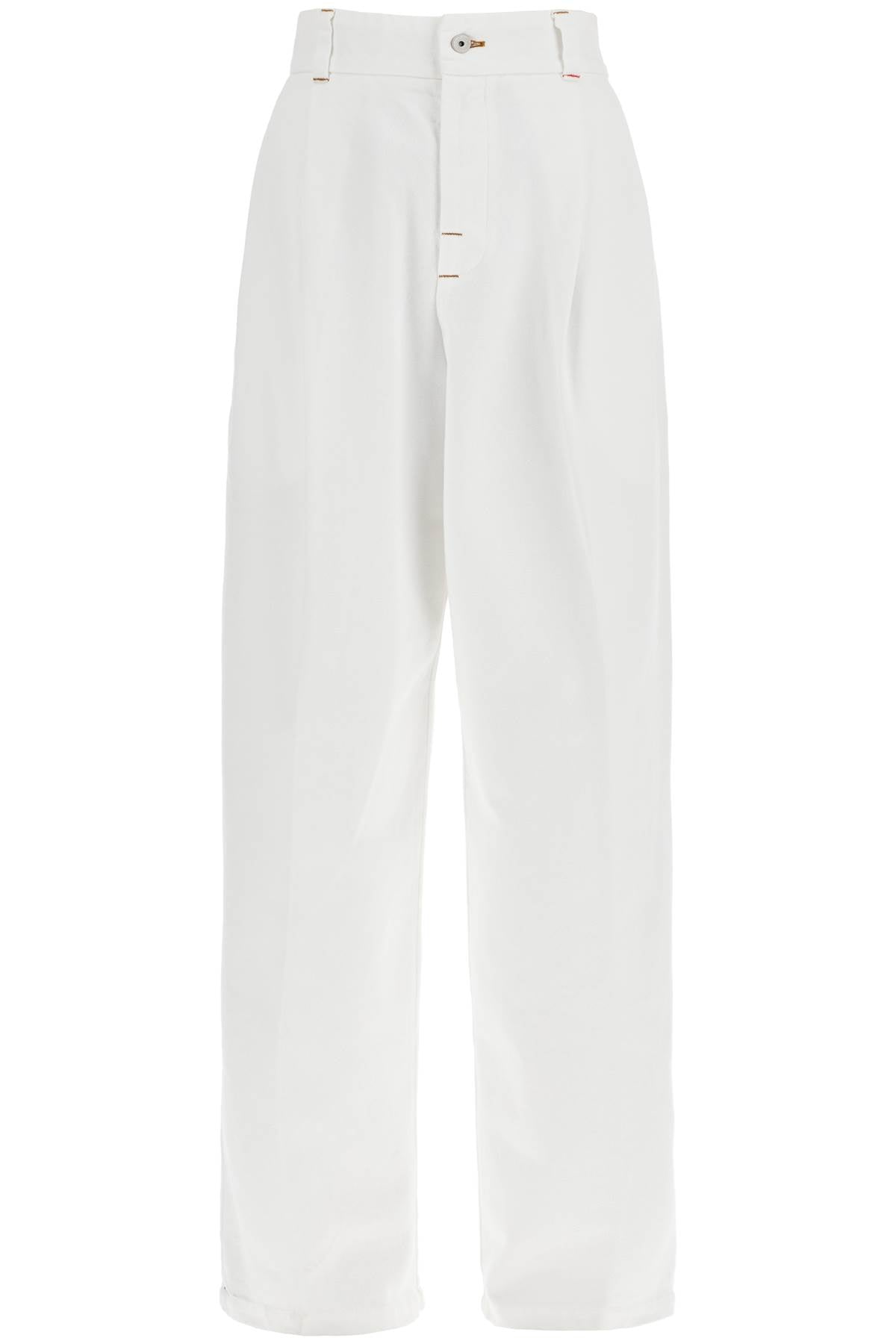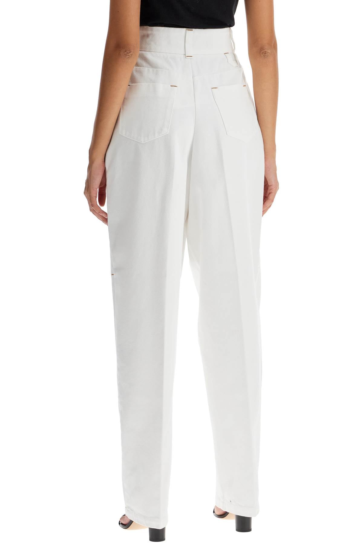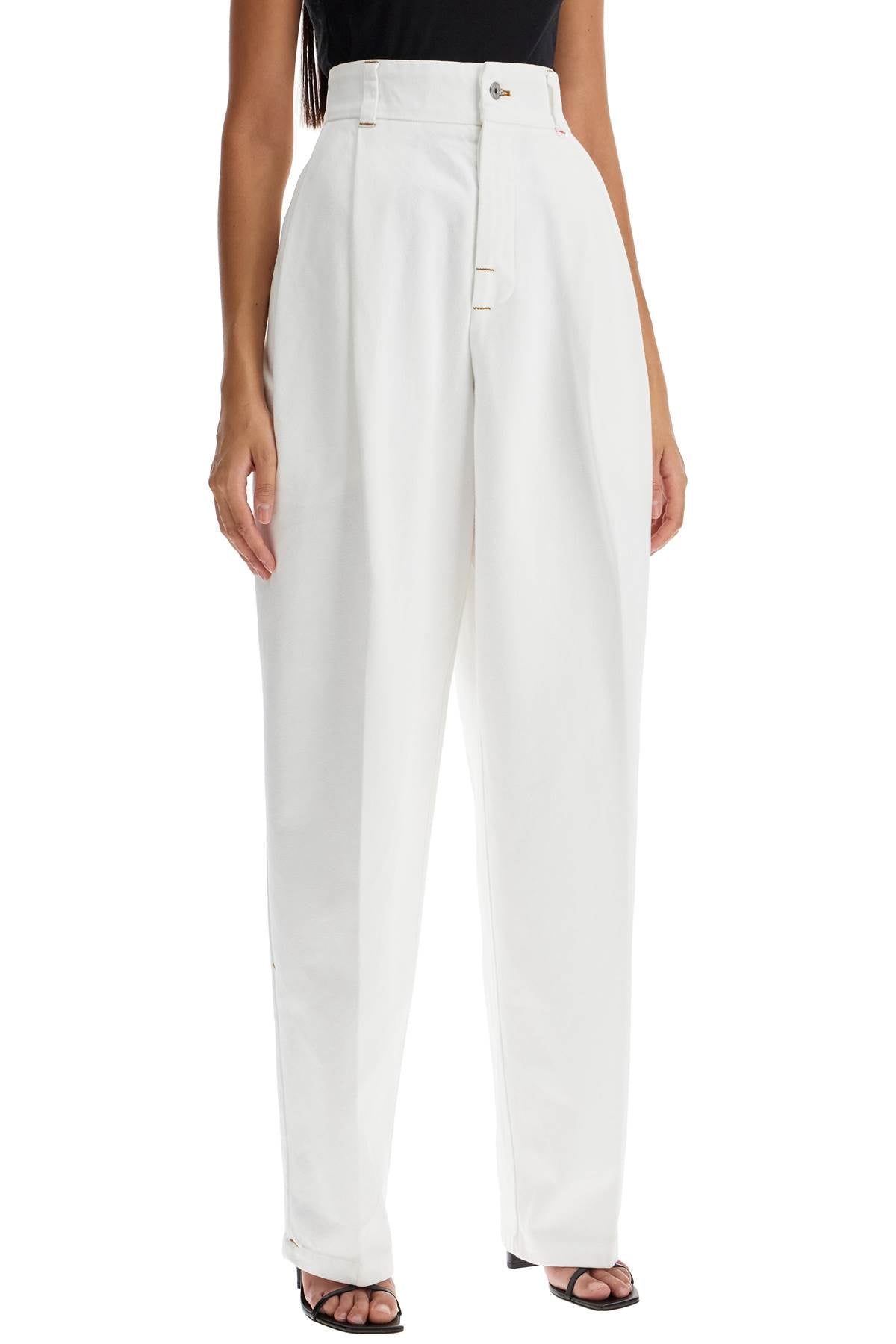 These Jacquemus high-waisted pants are made of white denim and feature a wide double-pleated cut with a tapered leg. They have side seam pockets, patch back pockets, belt loops, and a front button closure. The model is 177 cm tall and wears size 26.