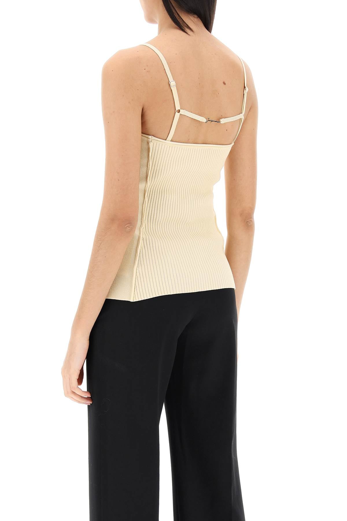 Jacquemus tank top crafted in ribbed viscose-blend knit, with a back string enriched by gold-tone metal logo charm. It features roll-up straight neckline and adjustable straps. Fitted. The model is 177 cm tall and wears size FR 36.