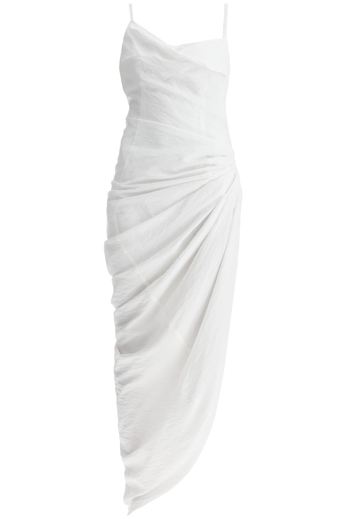 This long Jacquemus dress features an asymmetrical design with draped detailing on the side, made from a crinkled viscose blend twill fabric. Framed by delicate draping at the neckline, it has a backless design enhanced by adjustable straps and a strap across the back. It fastens with an invisible zip and hook closure on the side. The model is 177 cm tall and wears a FR 36 size.