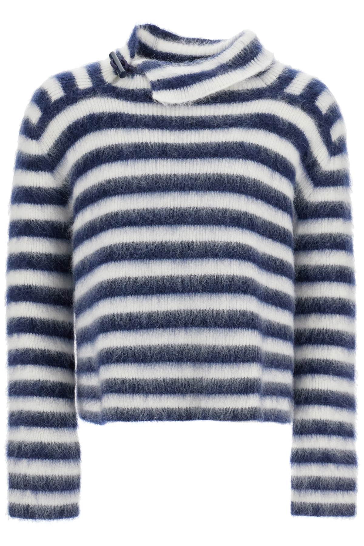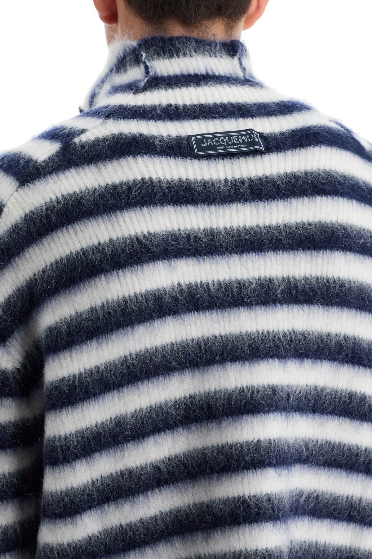 Featuring a nautical-inspired striped pattern, this Jacquemus sweater has a relaxed fit and an asymmetrical high collar with a side button closure. The garment is made of soft ribbed knit fabric in a blend of mohair and merino wool, with a brushed finish on the outside. The model is 182 cm tall and wears size M.