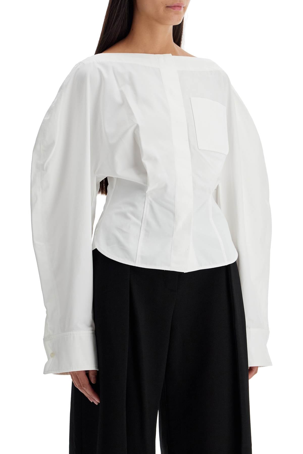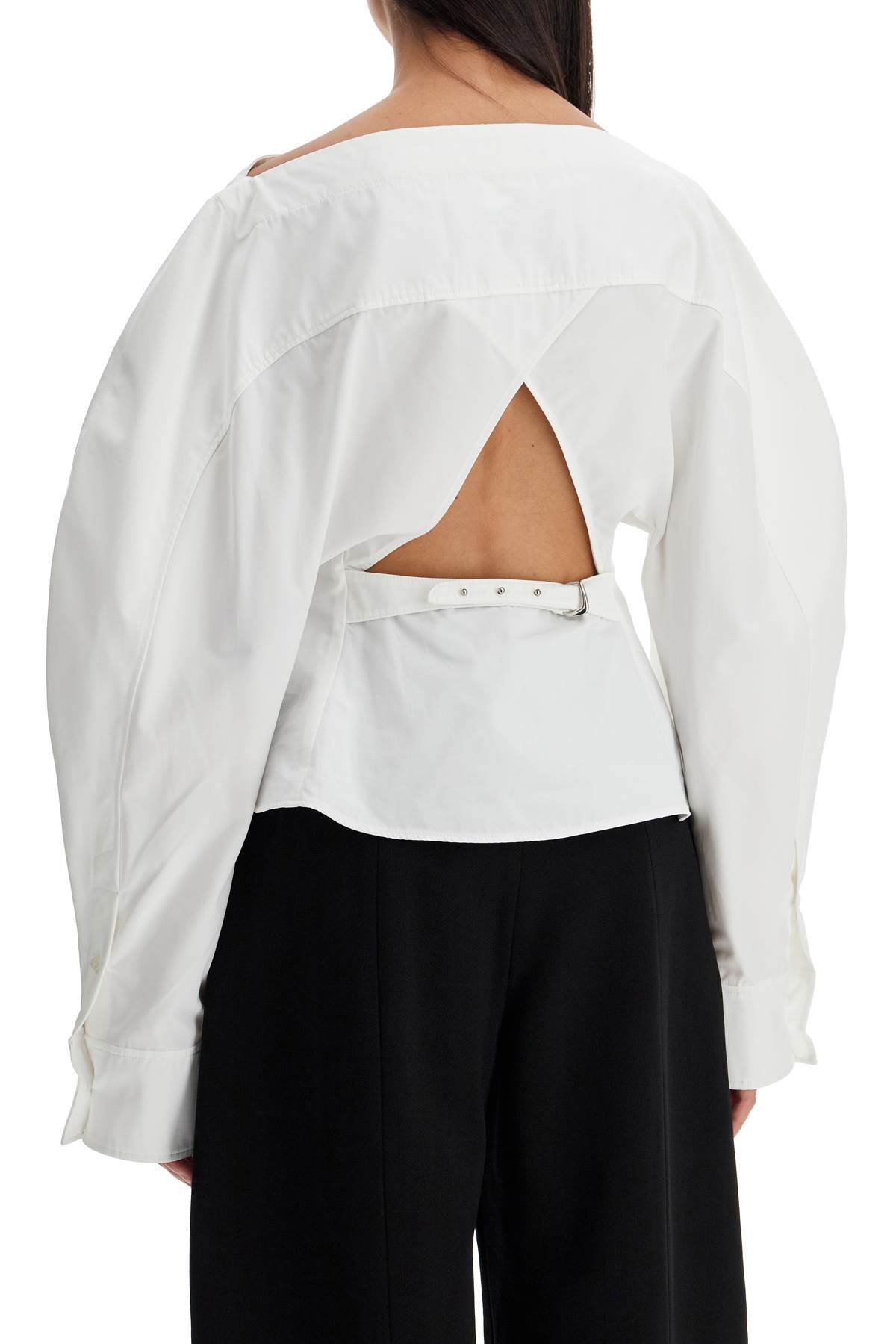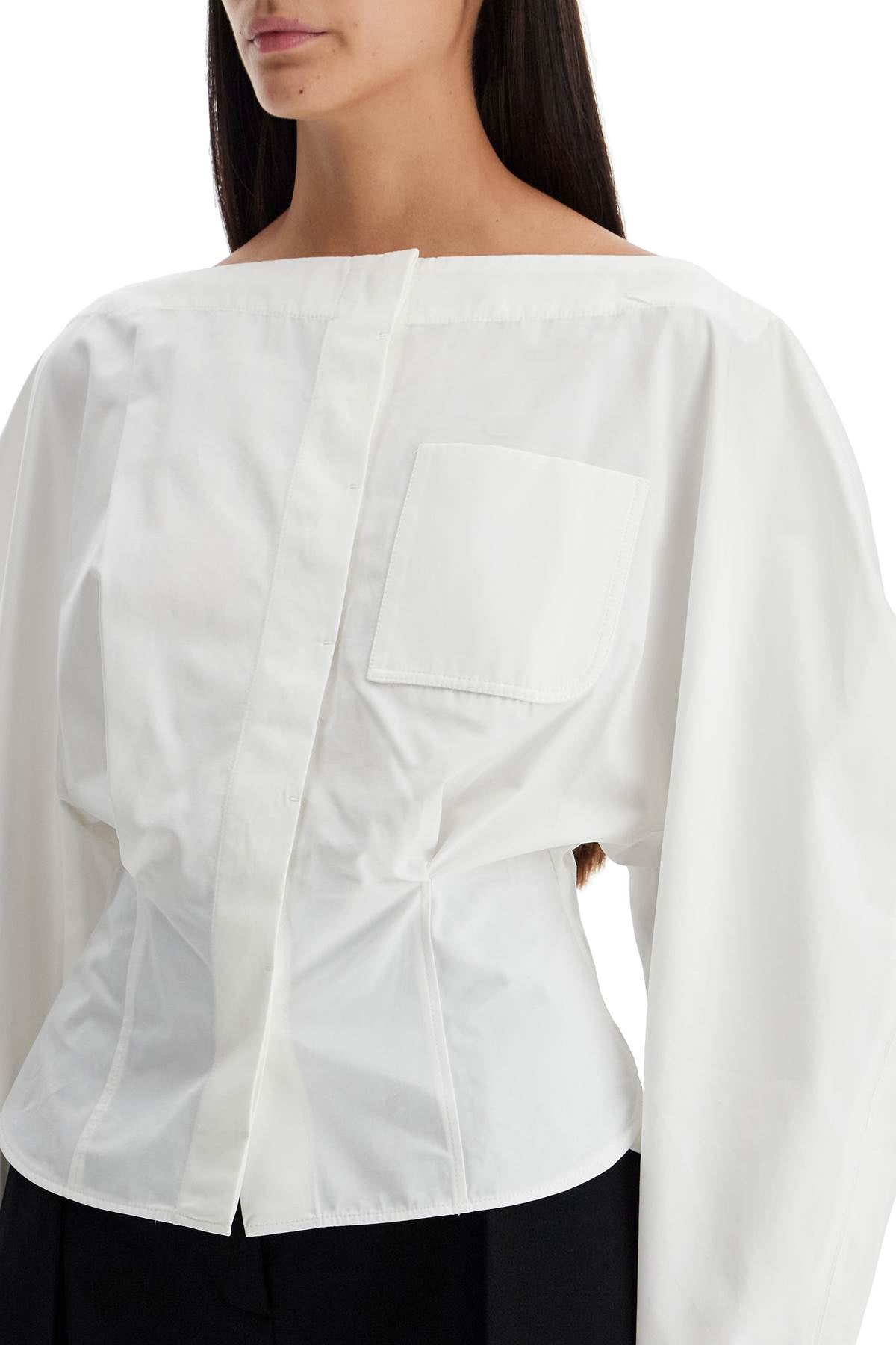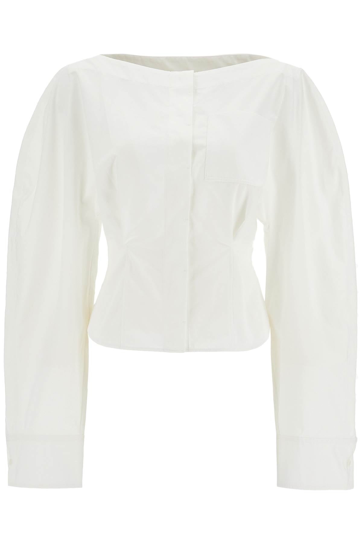 Crafted in cotton poplin, this Jacquemus shirt stands out for its soft silhouette on the bust and fitted waist, with a wide boat neckline and cut-out detail on the back with a strap. It features a chest pocket and hidden front button closure. The model is 177 cm tall and wears size FR 36.