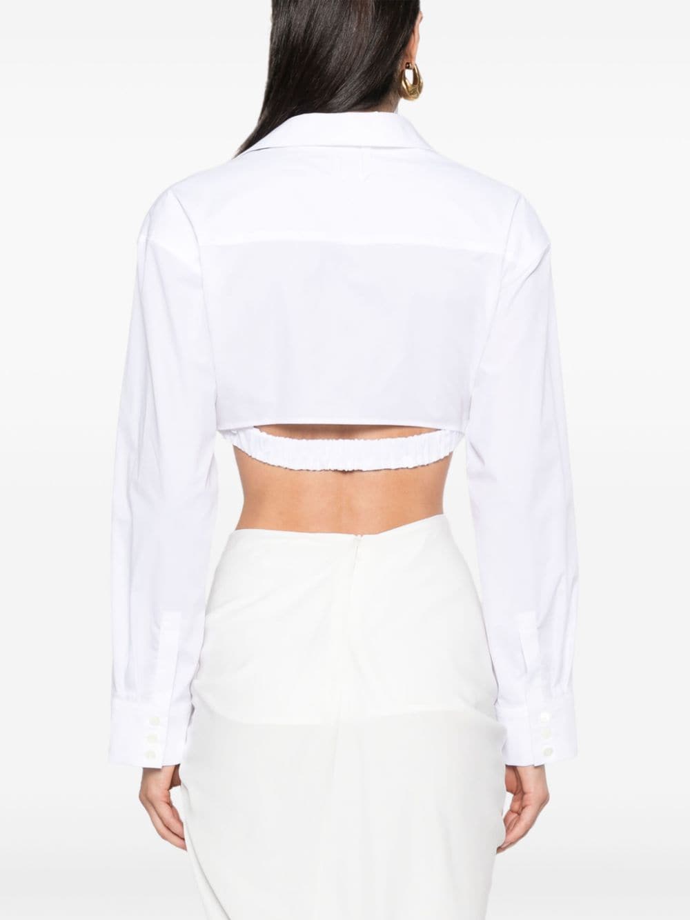 white cotton blend poplin texture cut-out detailing pleat detailing front button fastening front press-stud fastening long sleeves with buttoned cuffs internal adjustable straps rear elasticated strap cropped Size and Fit - This piece fits true to size. We recommend you get your regular size. Model is 1,75m / 5ft 8in wearing size 36 (FR)