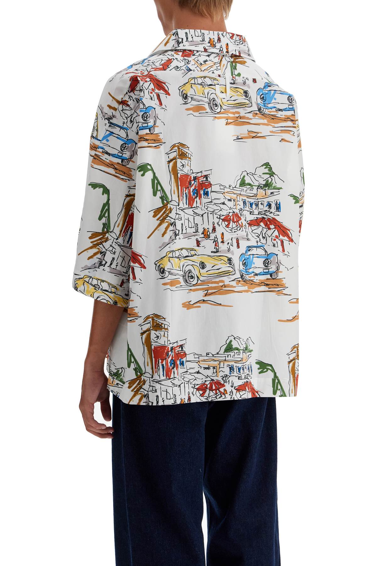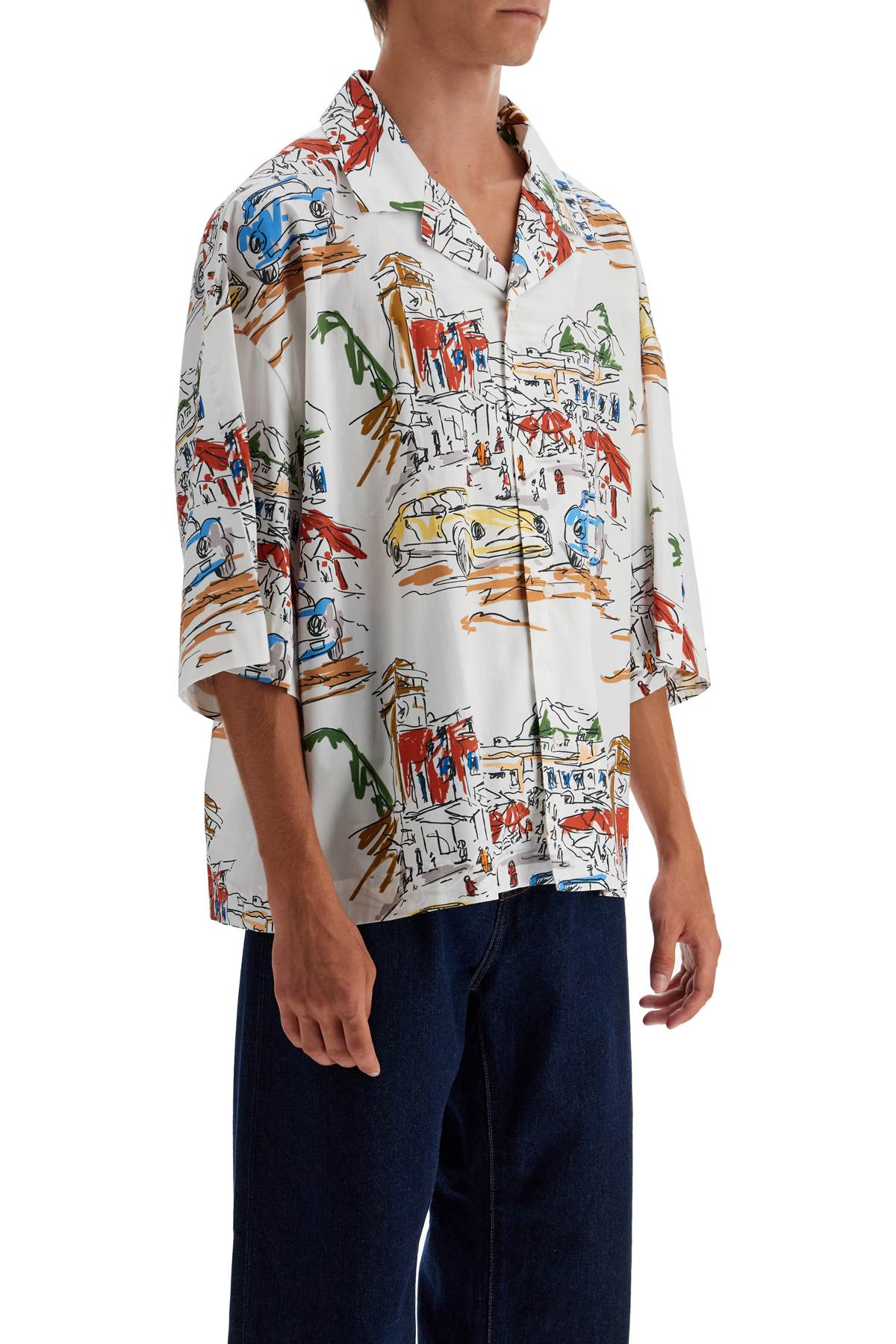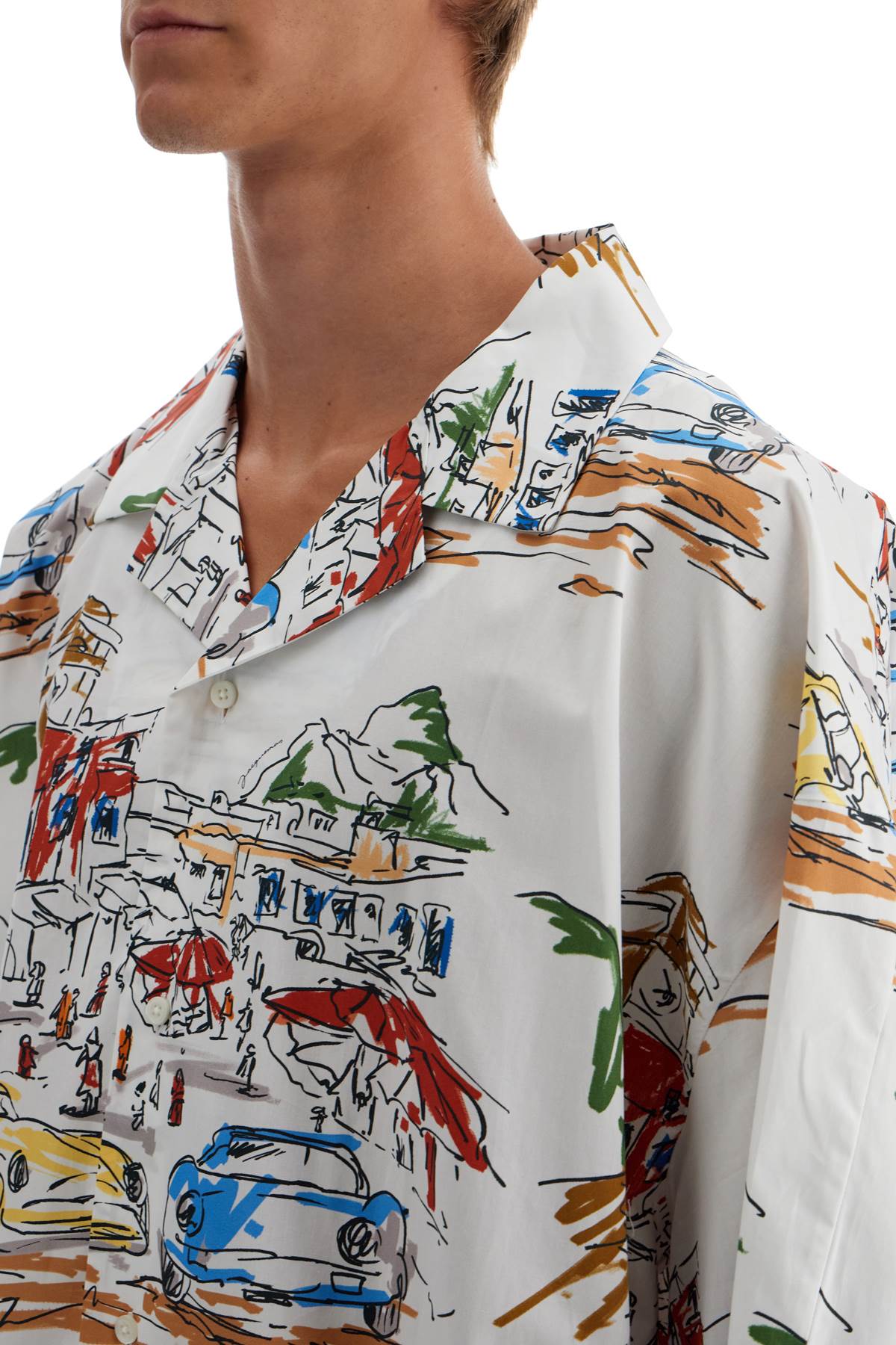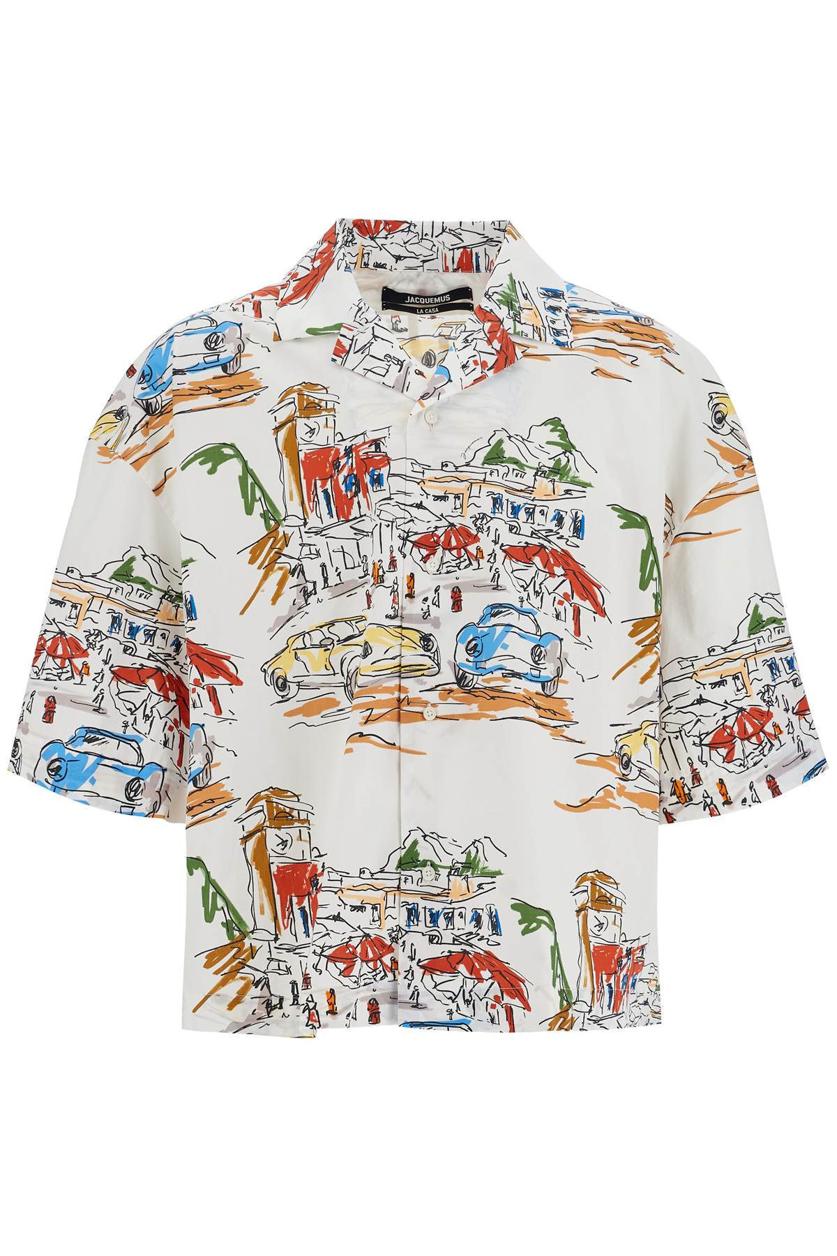 Made of pure cotton with an all-over graphic print, this Jacquemus oversized shirt features a short-sleeved design with an open collar and French button closure. Straight hemline. The model is 187 cm tall and wears size 2.