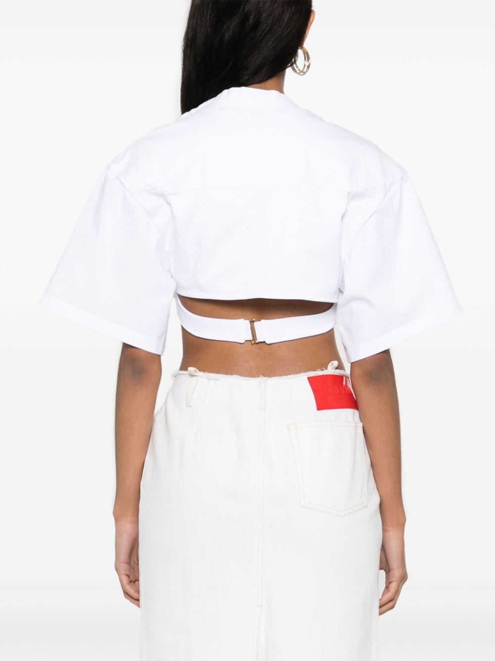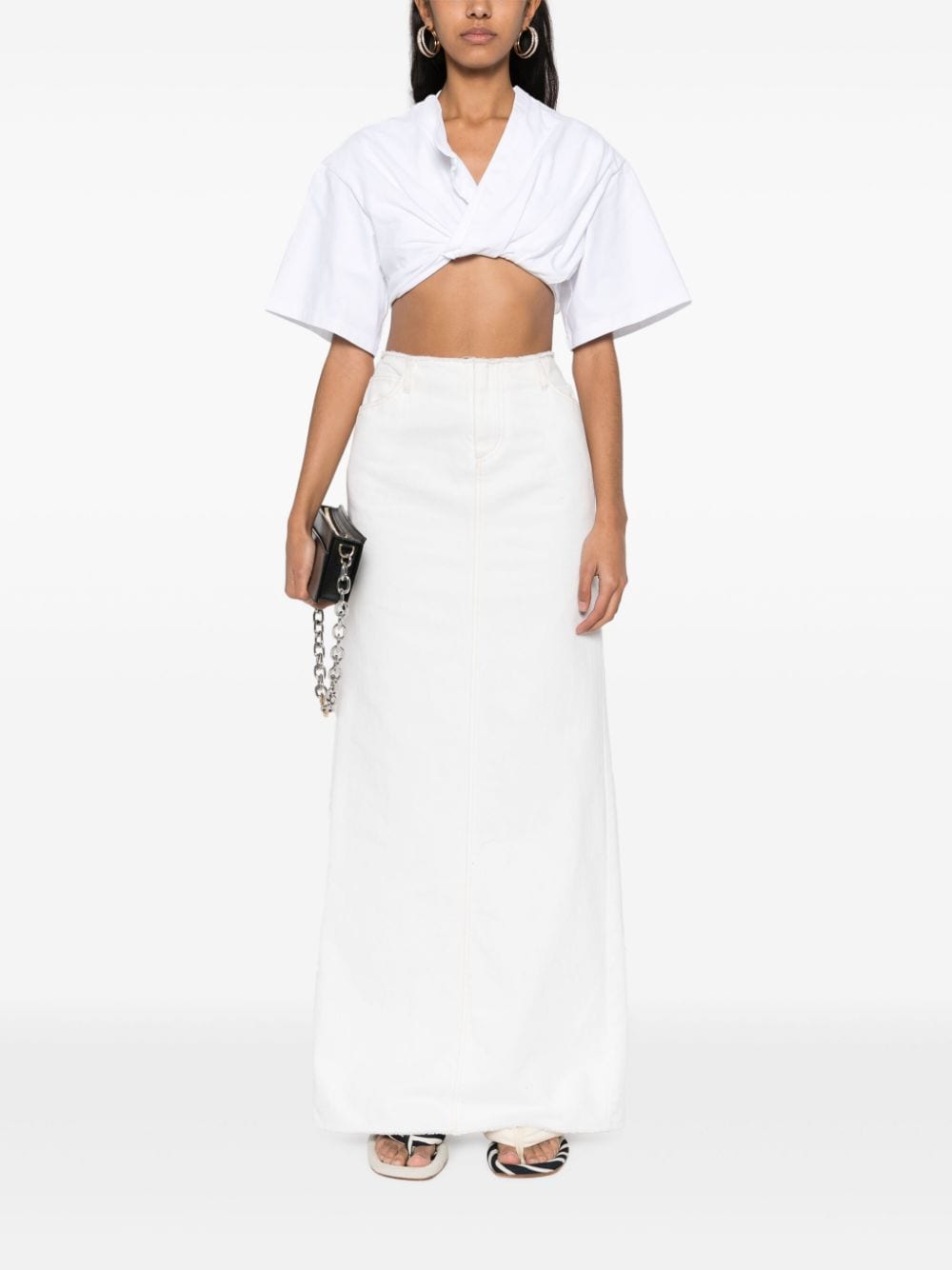 white cotton twist and draped detailing V-neck half-length sleeves cropped rear hook and eye fastening asymmetric hem Size and Fit - This piece fits true to size. We recommend you get your regular size. Model is 1,75m / 5ft 8in wearing size S