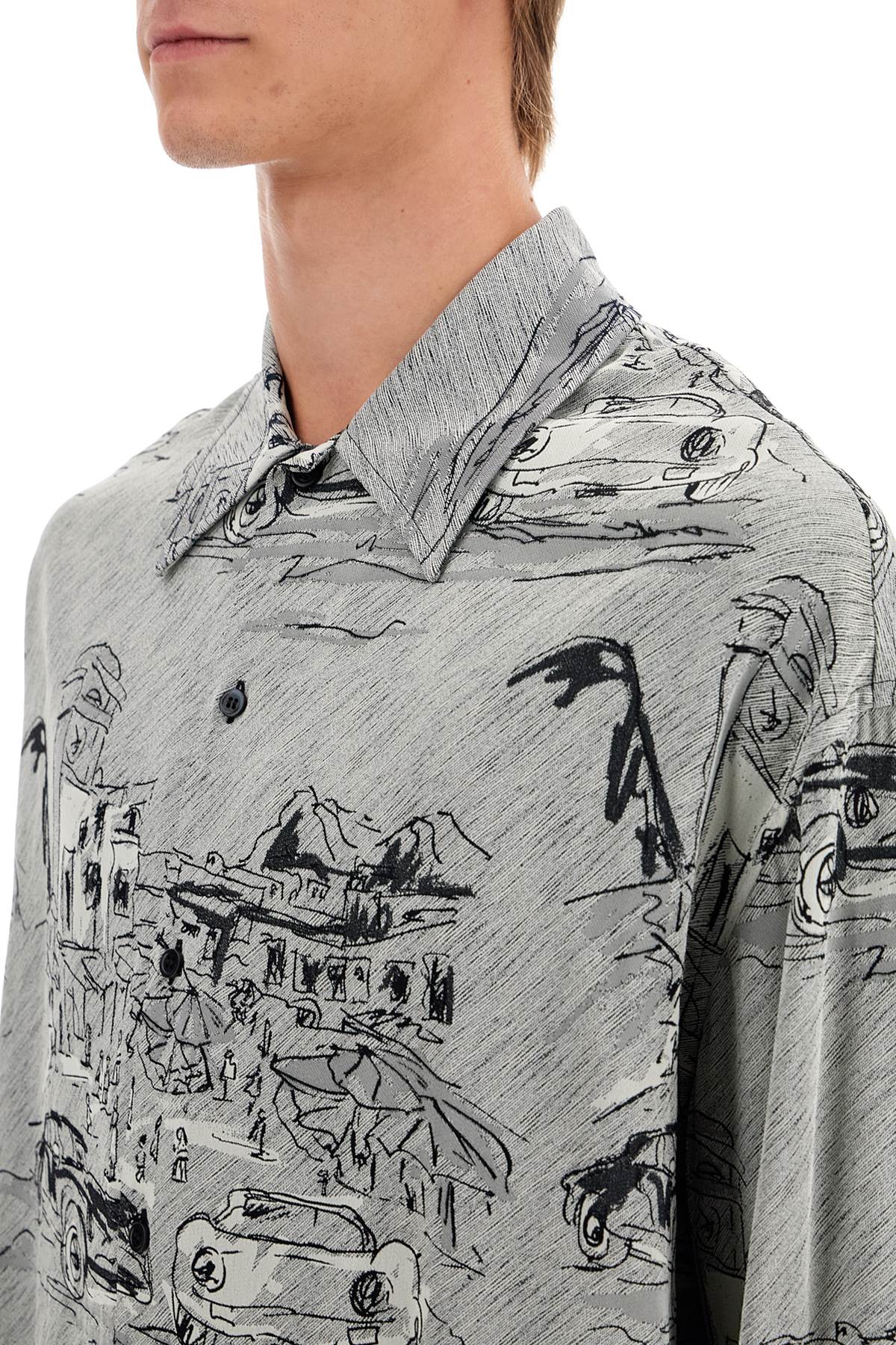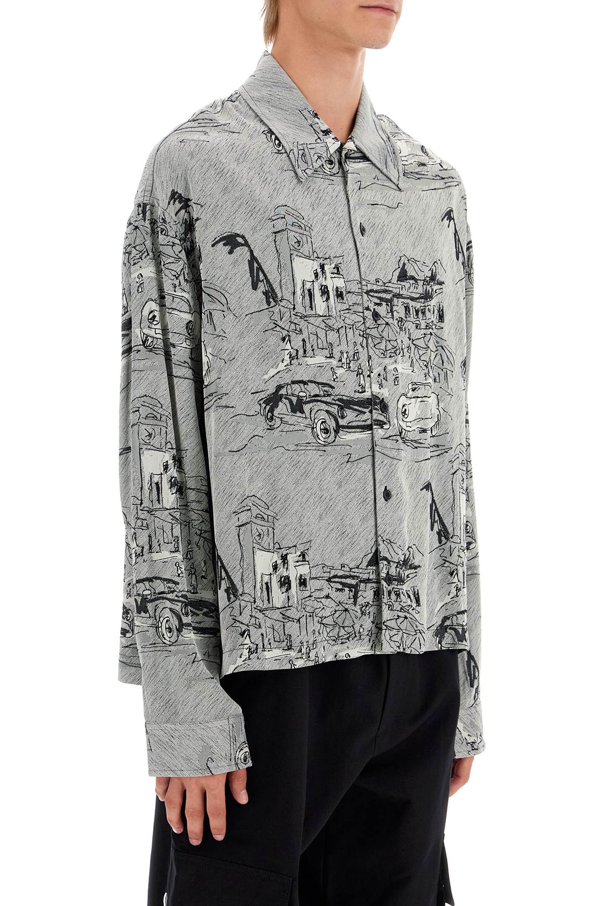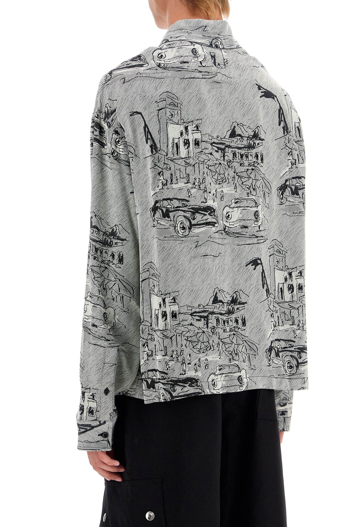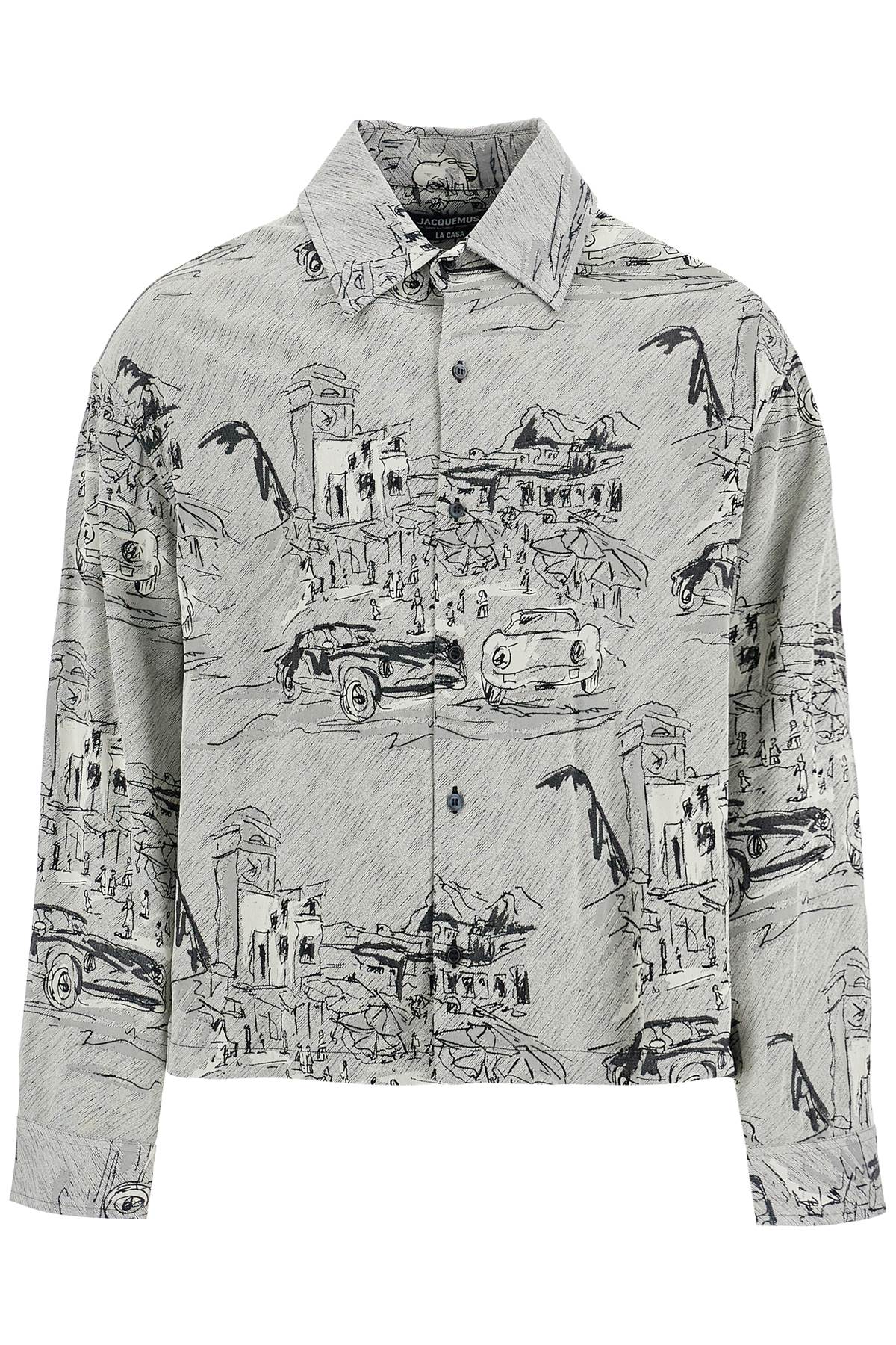 The La Chemise Corte long-sleeved shirt by Jacquemus has a short boxy cut and is made of jacquard viscose blend with an auto Capri pattern. It features a pointed collar, classic button closure, single-button cuffs, and a J loop on the back. The model is 187 cm tall and wears size IT 48.