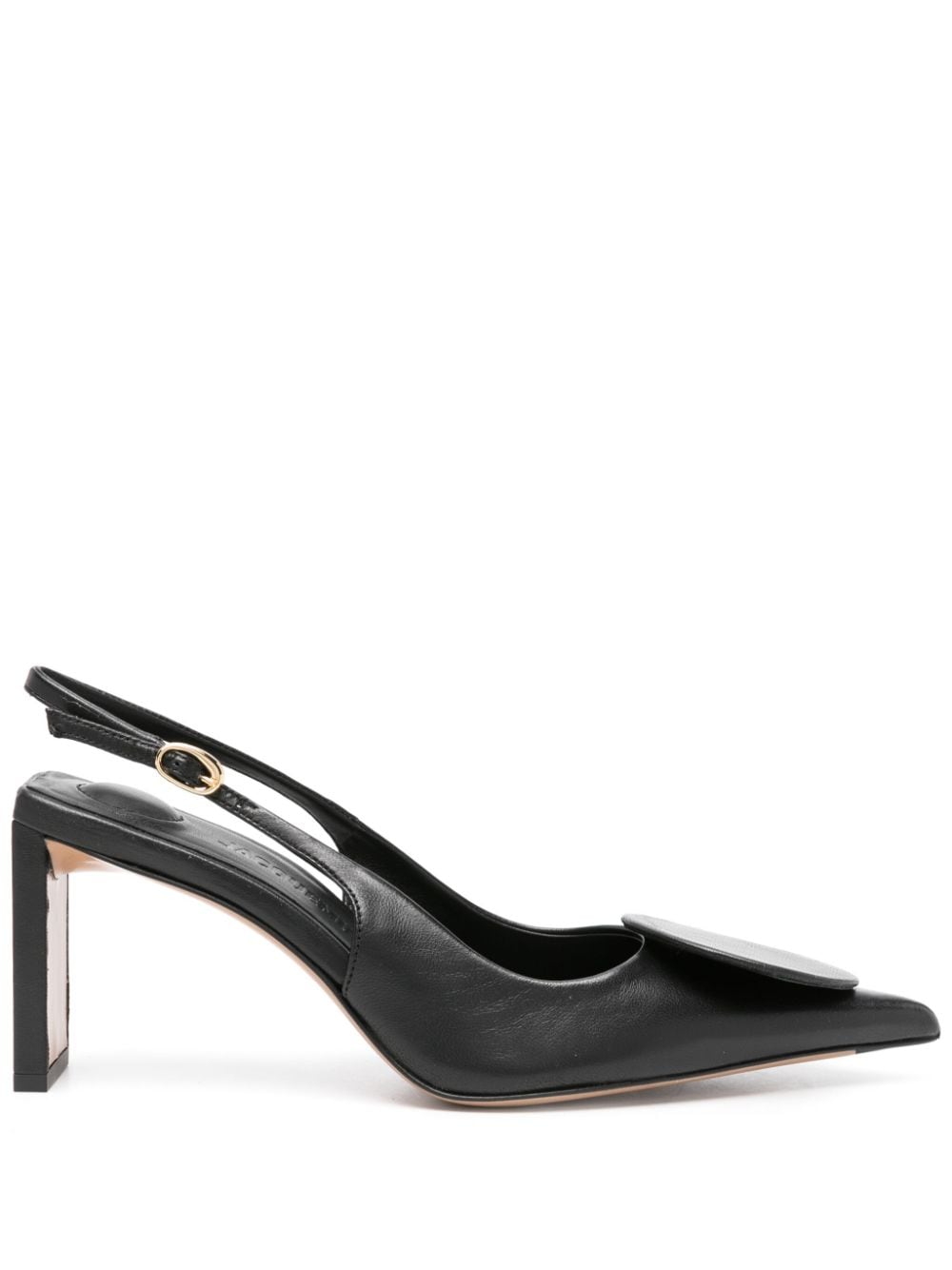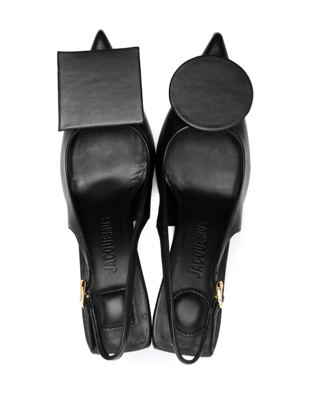 black calf leather square-shaped patch detail logo-engraved gold-tone hardware pointed toe buckle-fastening slingback strap leather lining 80mm block heel Size and Fit - Heel 3,3 in / 8,5 cm