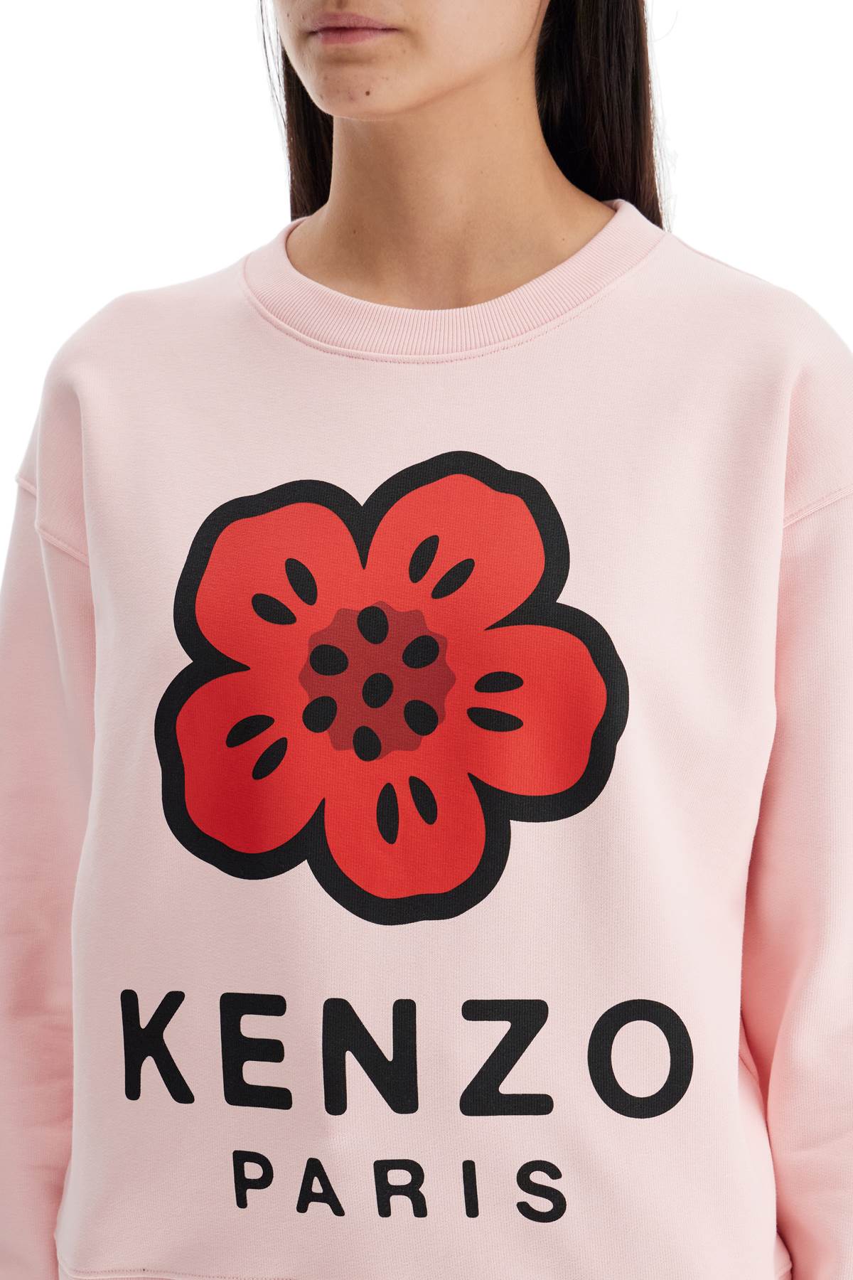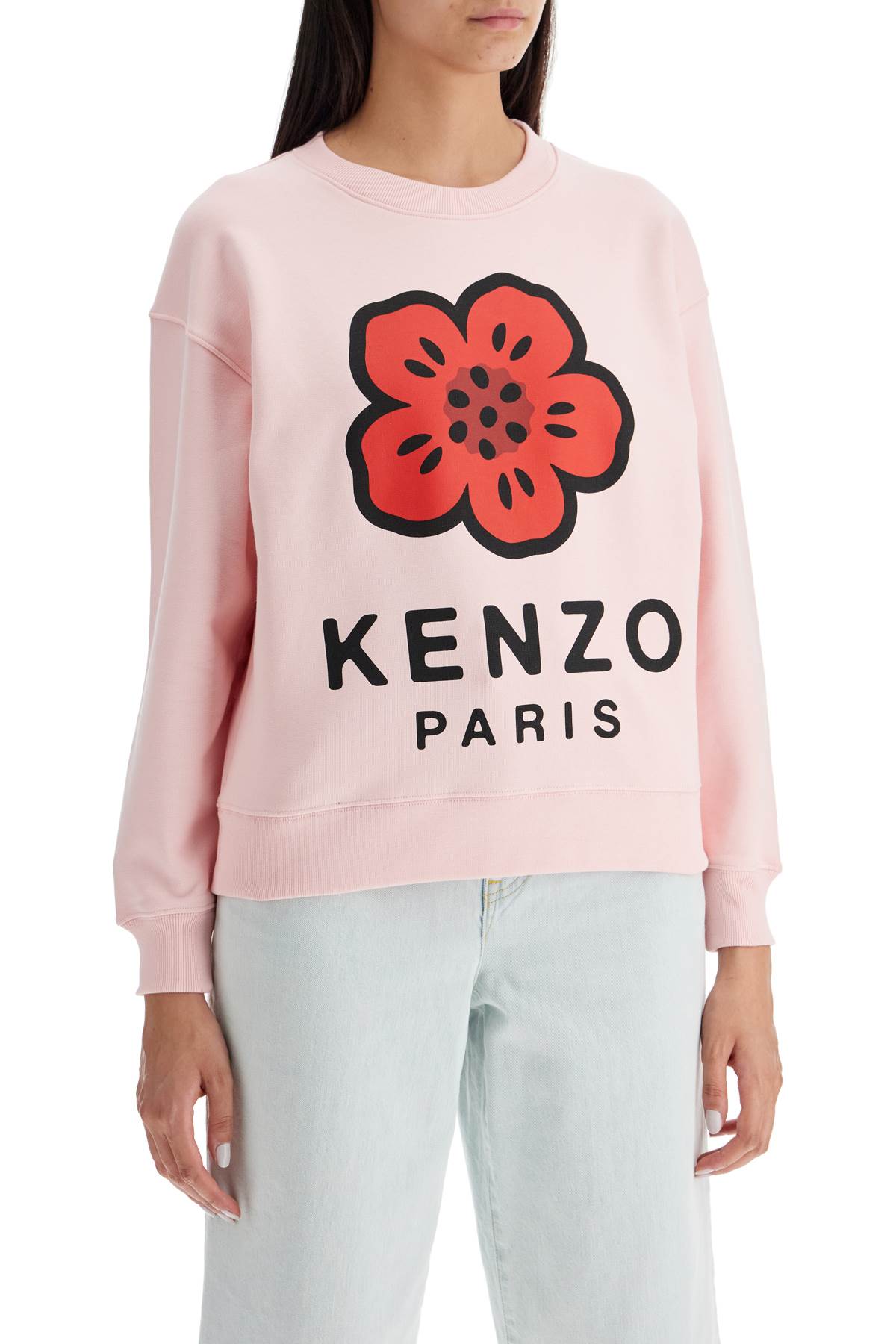 Kenzo crew neck sweatshirt with 'Boke Flower' front print. Made of stretch cotton slub jersey, it has a boxy cut with dropped shoulders and ribbed edges. The model is 177 cm tall and wears size XS.