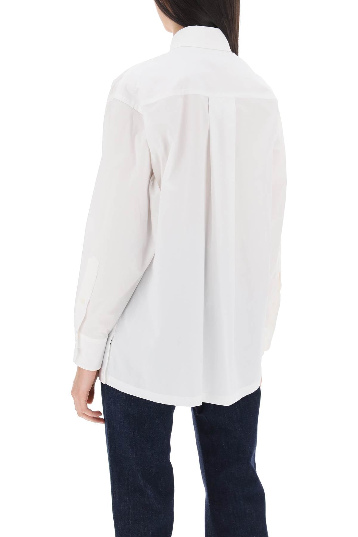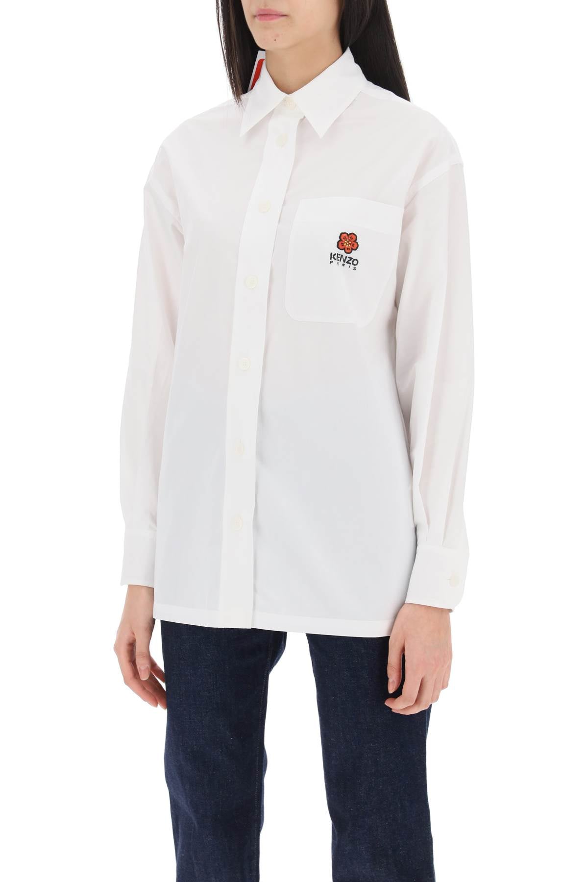 Kenzo shirt with a loose, realaxed cut, made from pure cotton poplin with a chest pocket enriched by the hallmark Bokè Flower embroidery. Italian collar, american button placket, single-button rounded cuffs with pleats, side slits on the hem and back yoke with box pleat. The model is 177 cm tall and wears size FR 34.