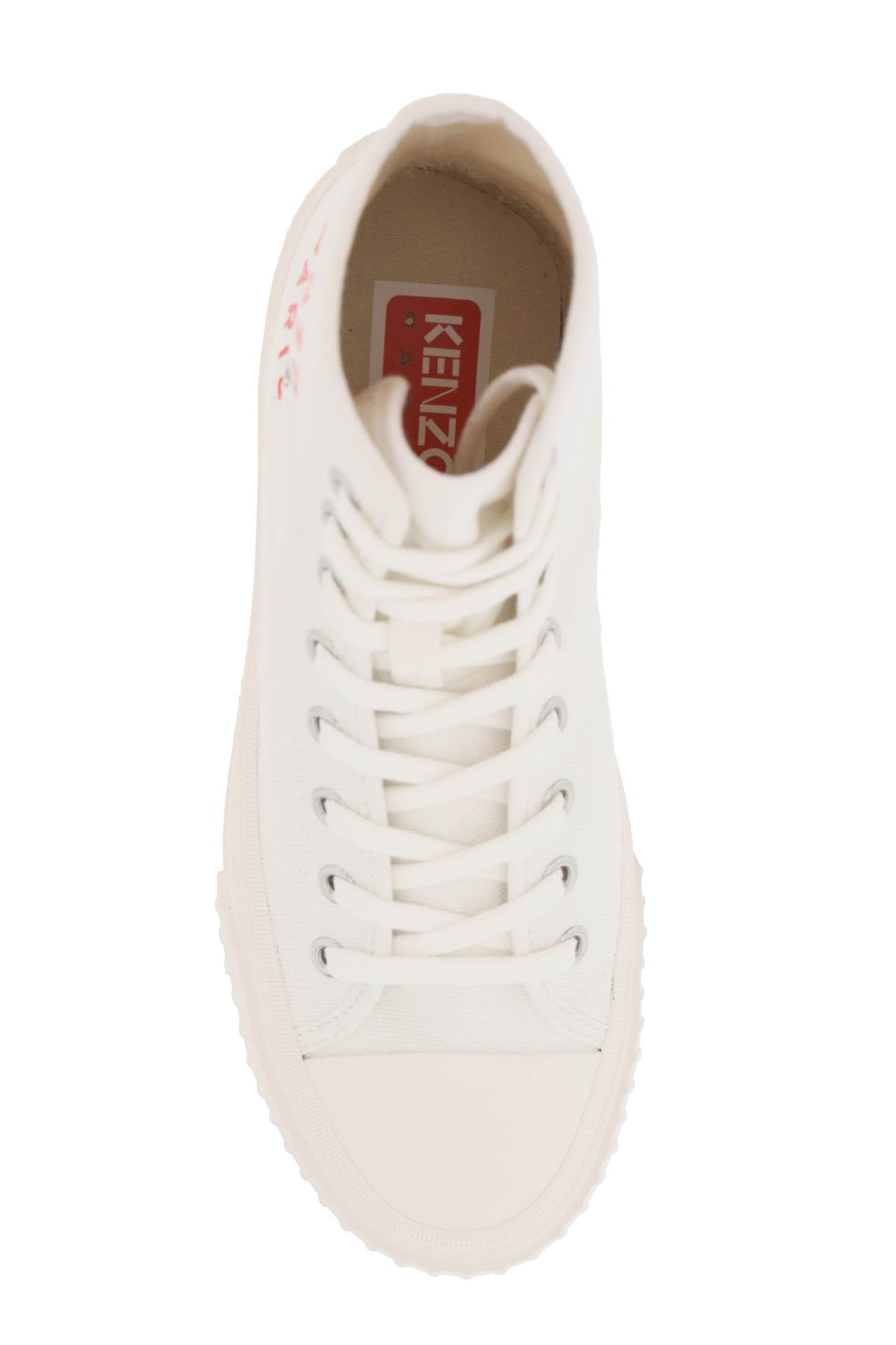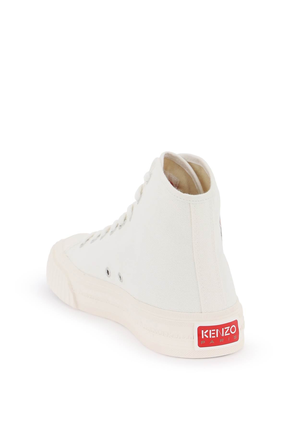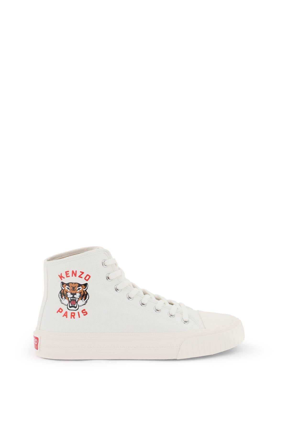 Kenzo high-top sneakers made of cotton canvas and decorated with Kenzo Lucky Tiger logo print on the outer side. Rubber toe, silver-tone metal eyelets. cotton interior with lightly padded insole and rubber sole featuring embossed signature along the sides and logo patch on back. Size and Fit - Heel Height = 3,5 cm,