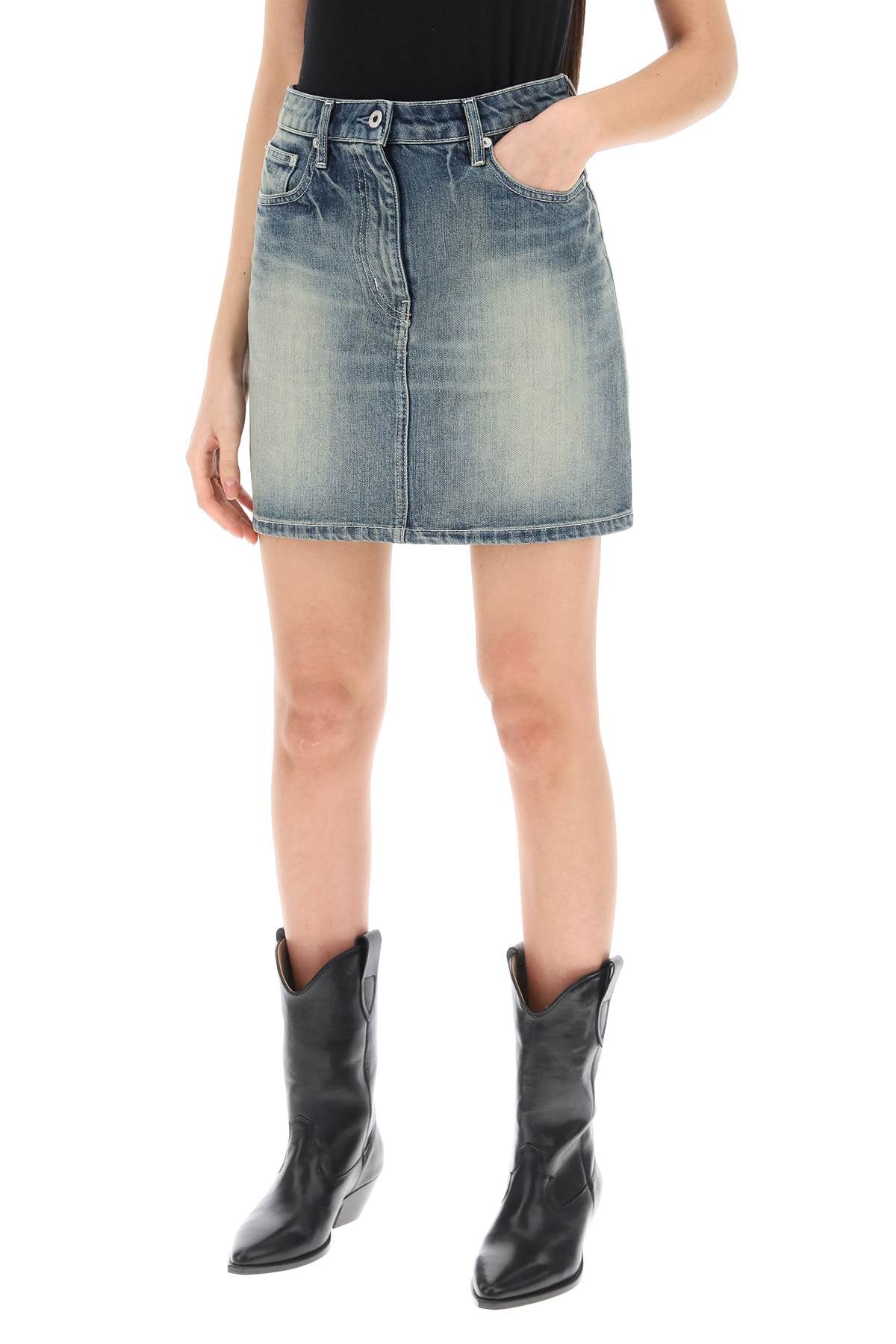 Kenzo mini skirt crafted in lived-in effect stone-washed japanese cotton denim, characterized by a five-pocket design enriched by Kenzo Paris embroidery on the back. Zipper-fly and logo-button closure, belt loops and jacron on the back of the waist. Fitted with trapeze cut. The model is 177 cm tall and wears size 26.