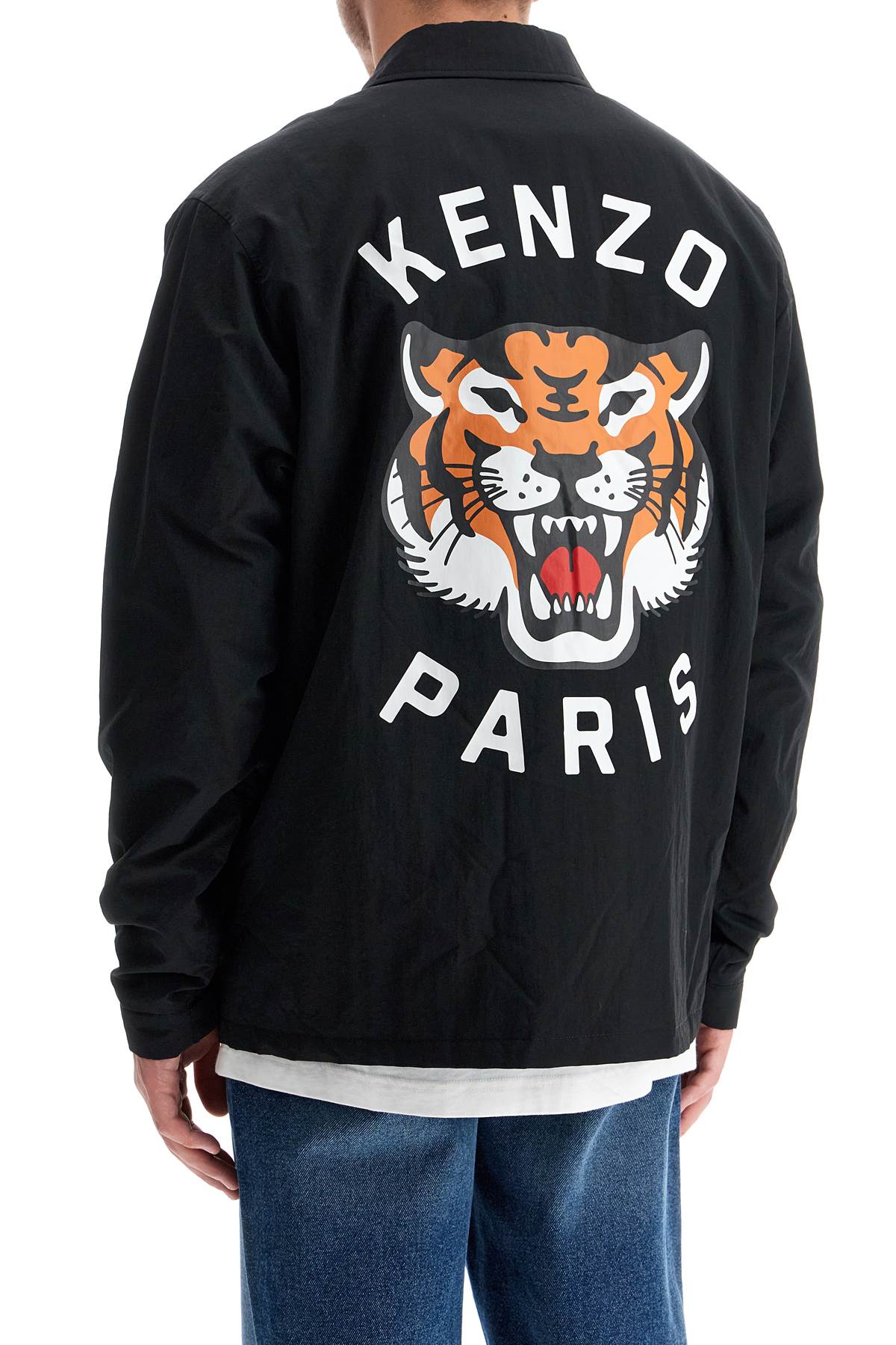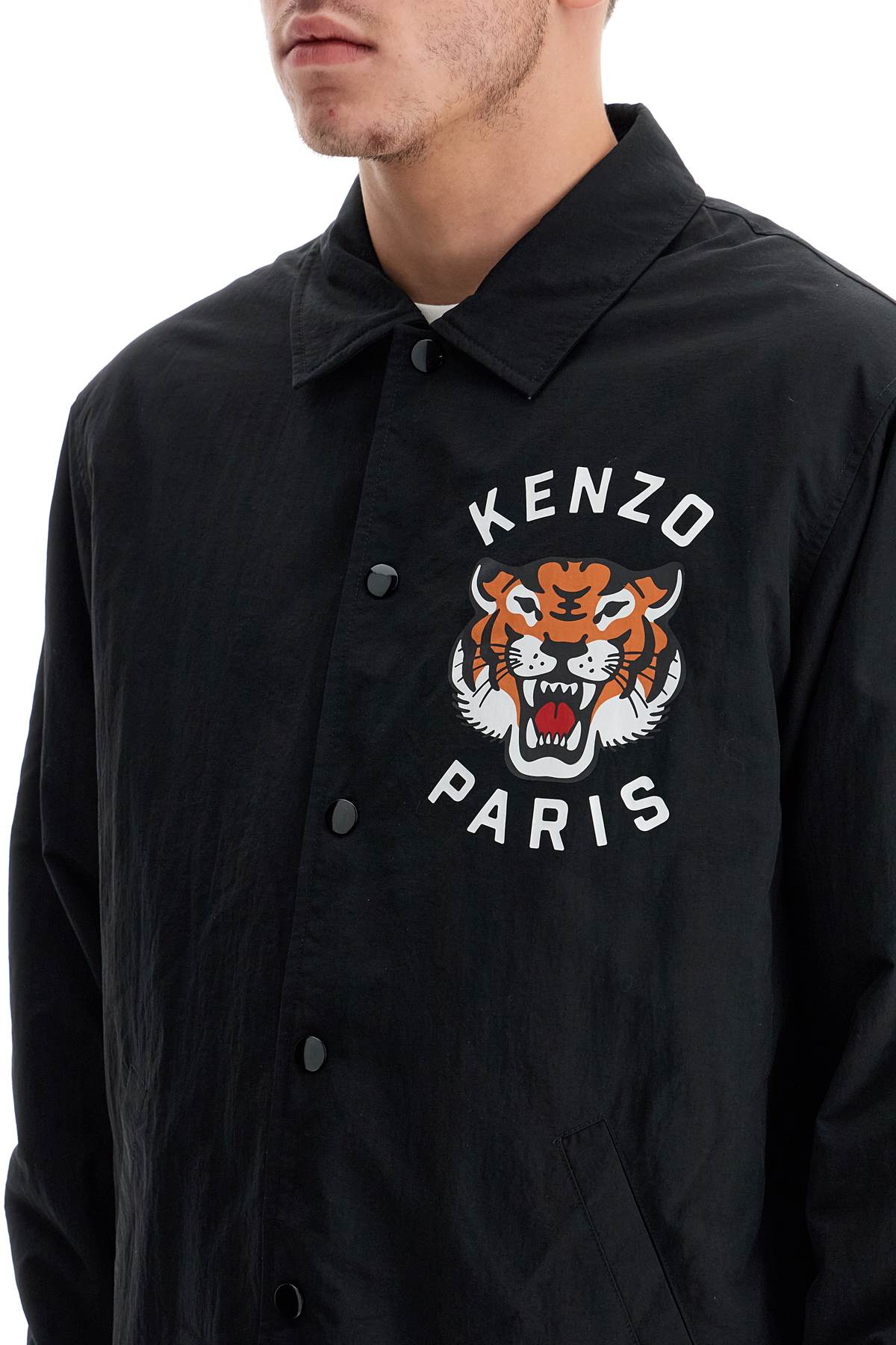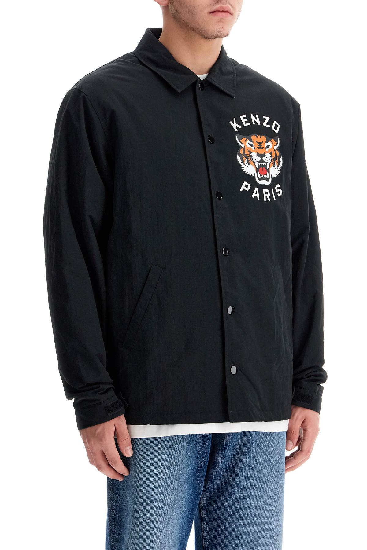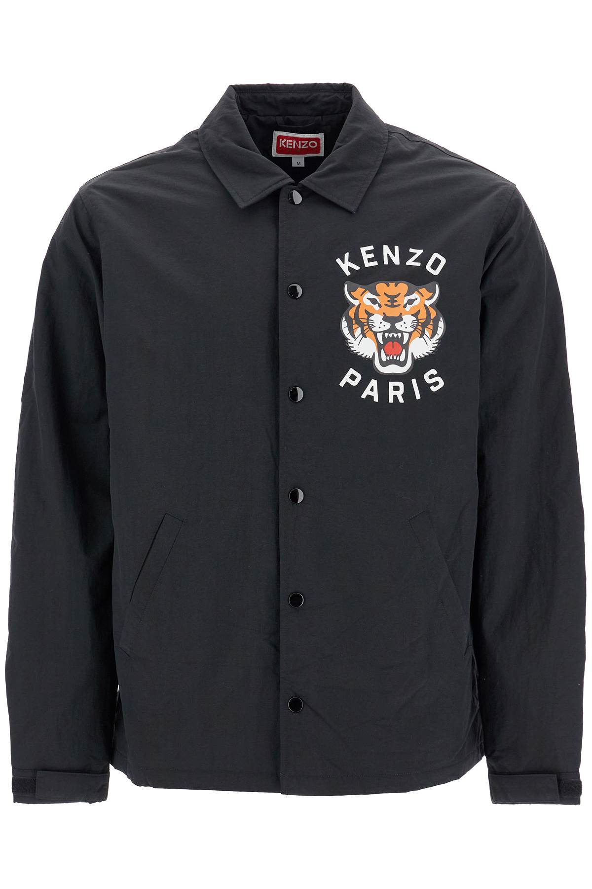 This nylon overshirt is characterized by the iconic Lucky Tiger graphic with Kenzo Paris logos printed on the chest and back. It features a straight cut with regular proportions, complete with a shirt collar, snap button closure, adjustable cuffs with velcro, and slanted flap pockets. The lightweight synthetic padding adds extra warmth. The model is 182 cm tall and wears size M.