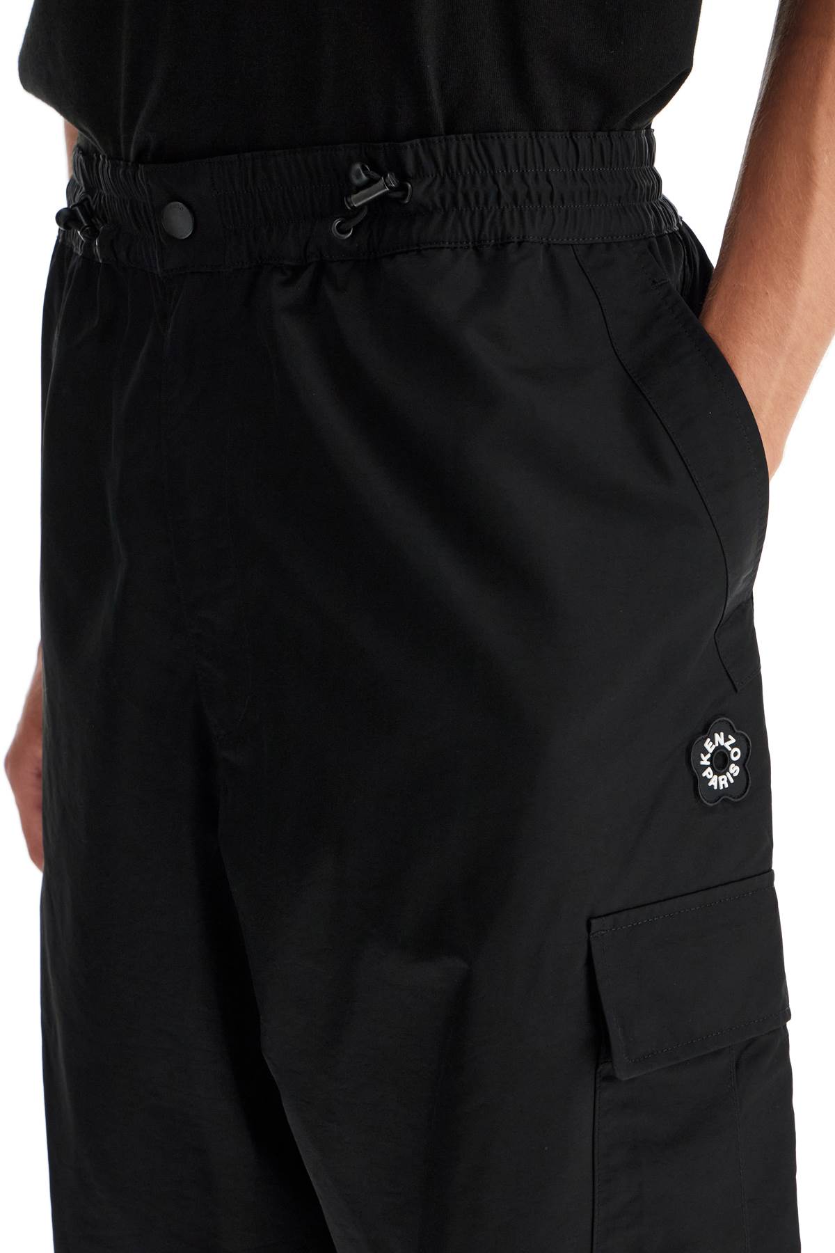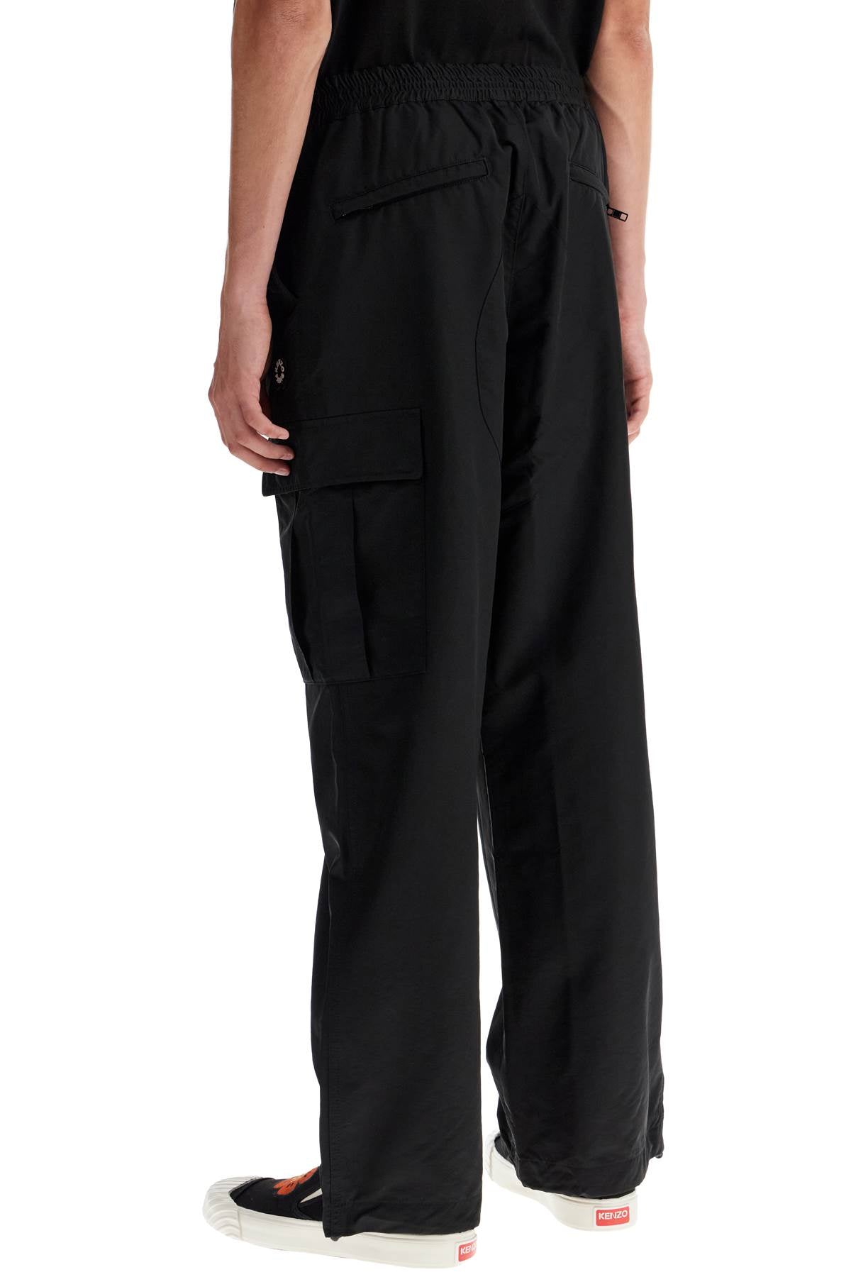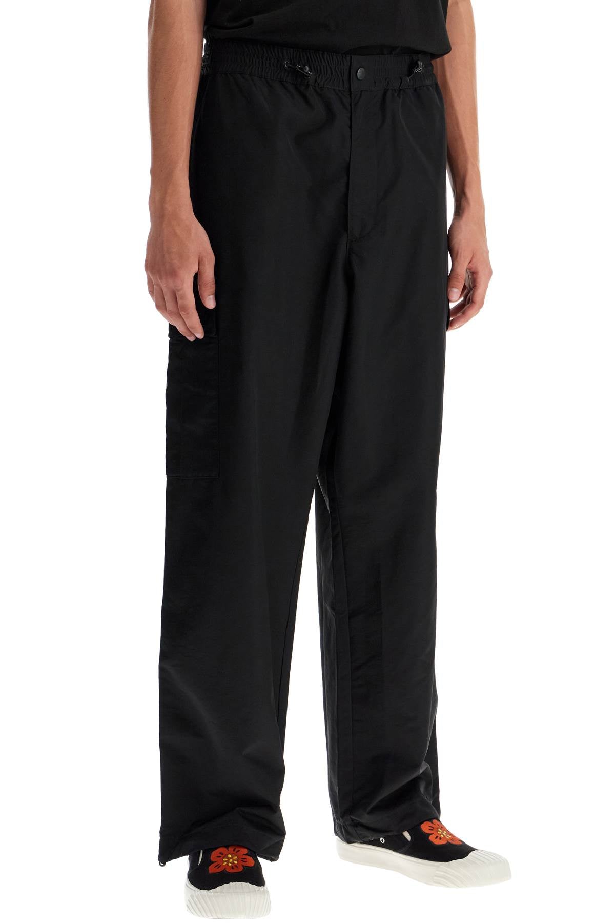 Kenzo cargo pants with a straight and wide fit, made of nylon with an elasticized waistband and 'Boke Flower 2.0' logo detail applied on the side. Closed with zip and snap button, they feature two side pockets, two back pockets, and two flap pockets on the legs. Elastic drawstring at the waist and bottom of the leg. The model is 187 cm tall and wears size L.