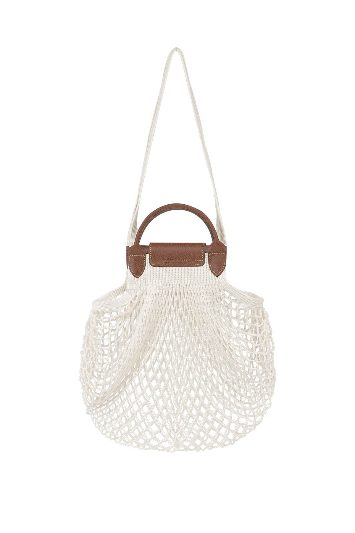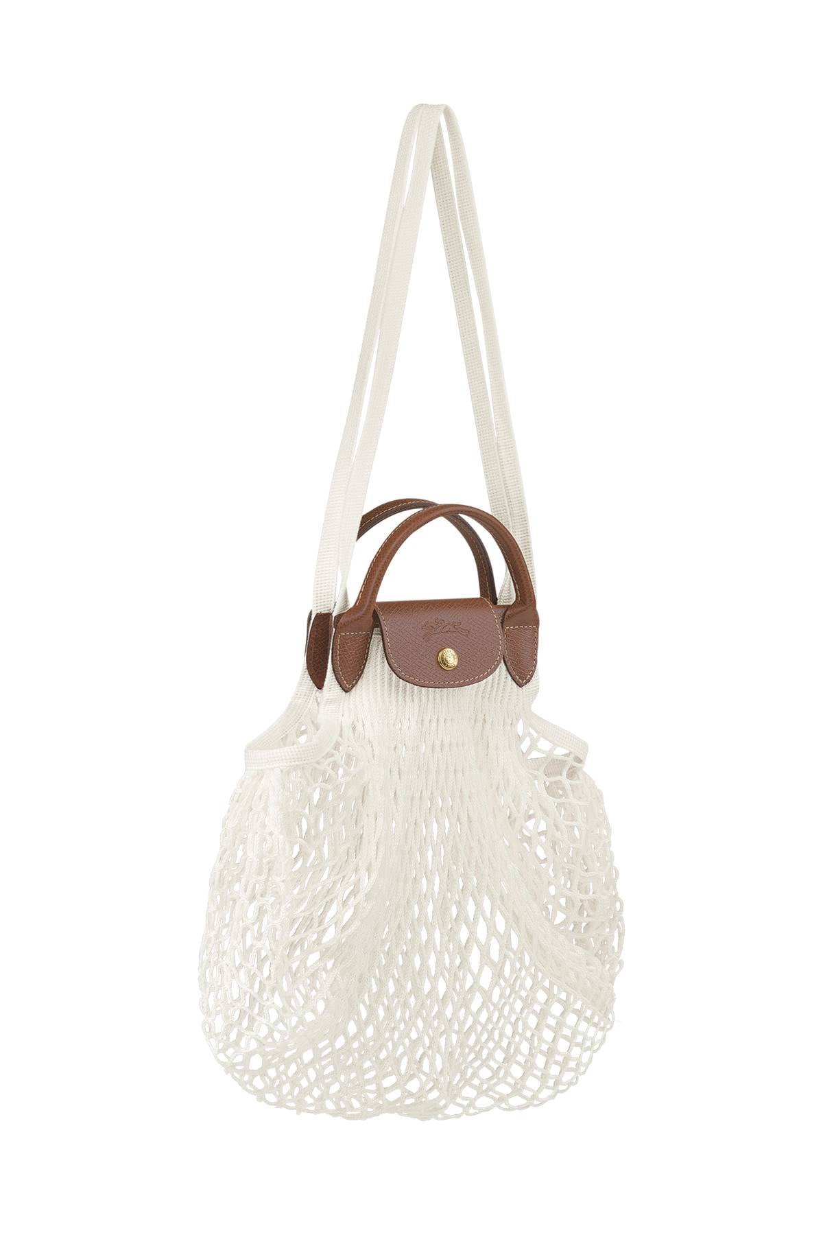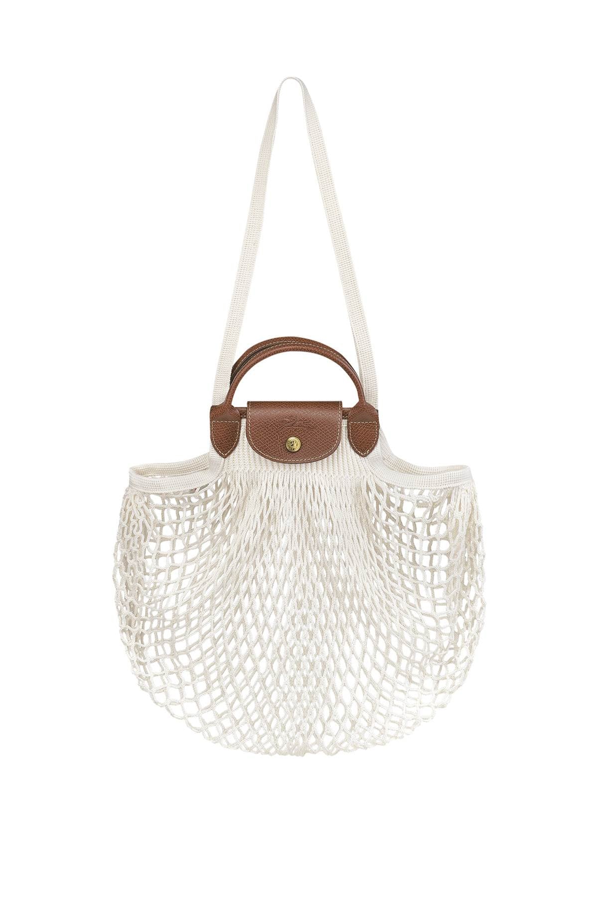 Le Pliage Filet tote bag by Longchamp, in collaboration with the French company FILT, famous for the production of mesh shopping bags, made from woven cotton with double handle in Russian leather and double shoulder handle in cotton. Leather flap with the iconic embossed logo and golden metal snap button. Unlined. Size and Fit - Bag Length = 38 cm, Bag Height = 31 cm, Bag Weight = 3 cm, Handle Height = 6 cm, Shoulder Bag Length = 29 cm,