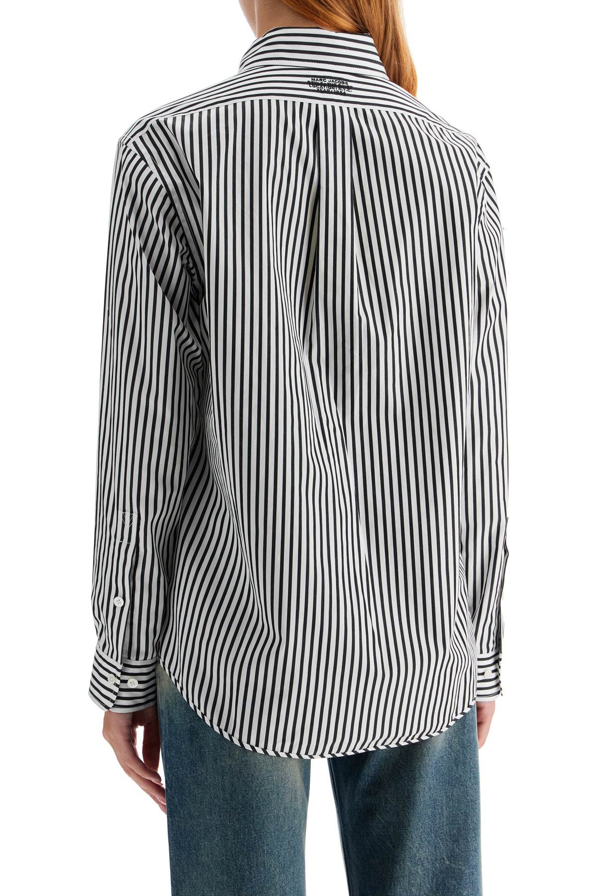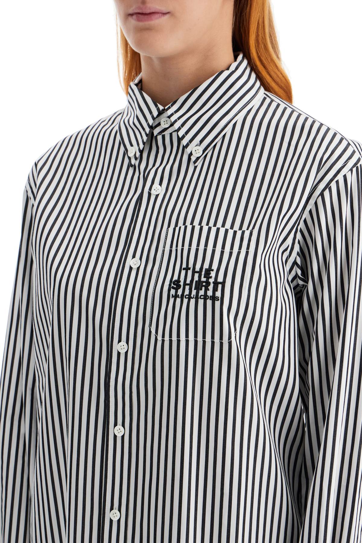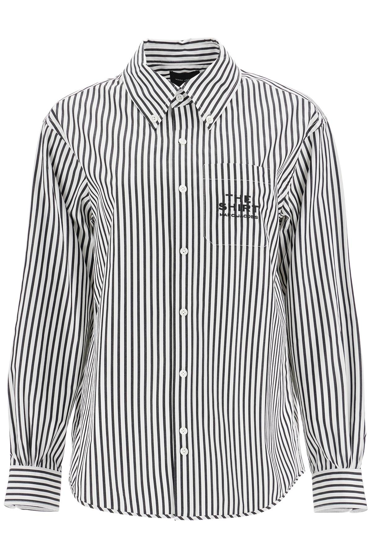 The Striped Shirt by Marc Jacobs is made of striped cotton poplin with a button-down collar and embroidery on the pocket. It features a rounded hem and a boxy cut. The model is 177 cm tall and wears size XS.