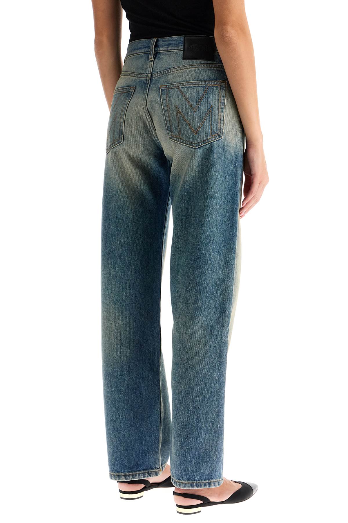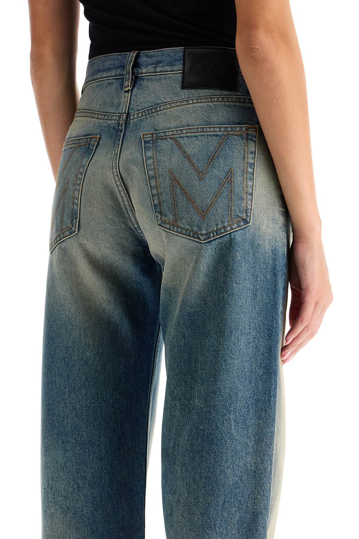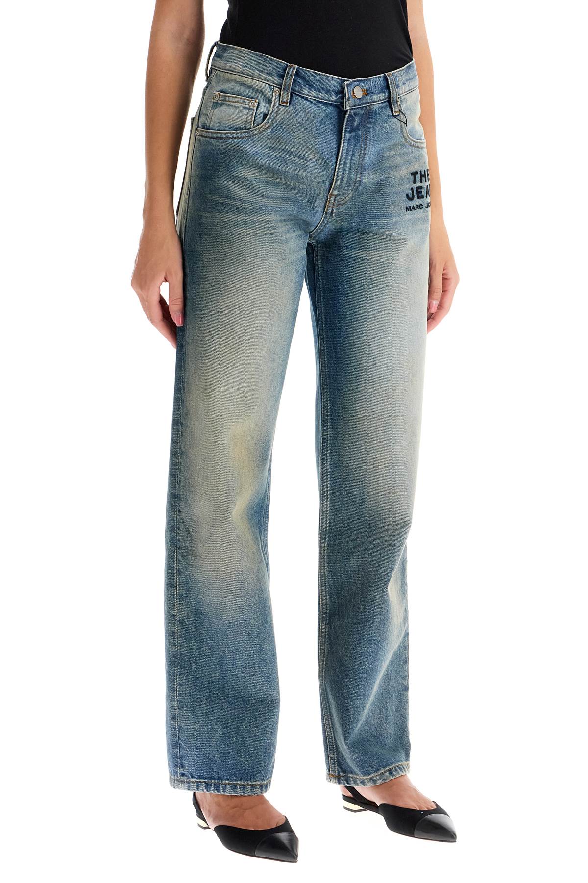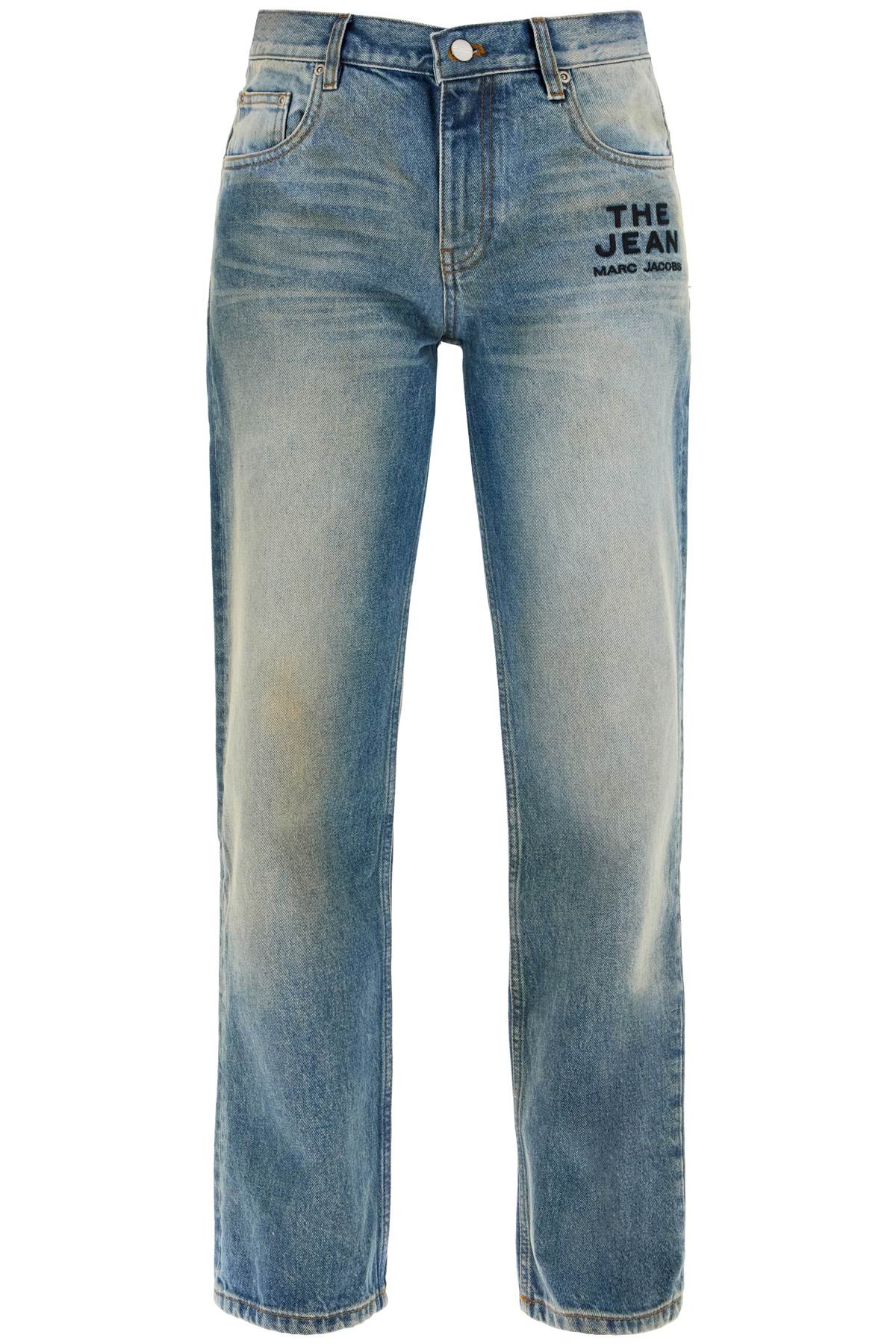 The Washed Jean by Marc Jacos are made of washed cotton denim with contrasting embroidery on the left leg. Featuring a five-pocket design and a straight but relaxed fit, it has a hidden zip and button closure, and back pockets decorated with M-shaped stitching. The model is 177 cm tall and wears size 26.
