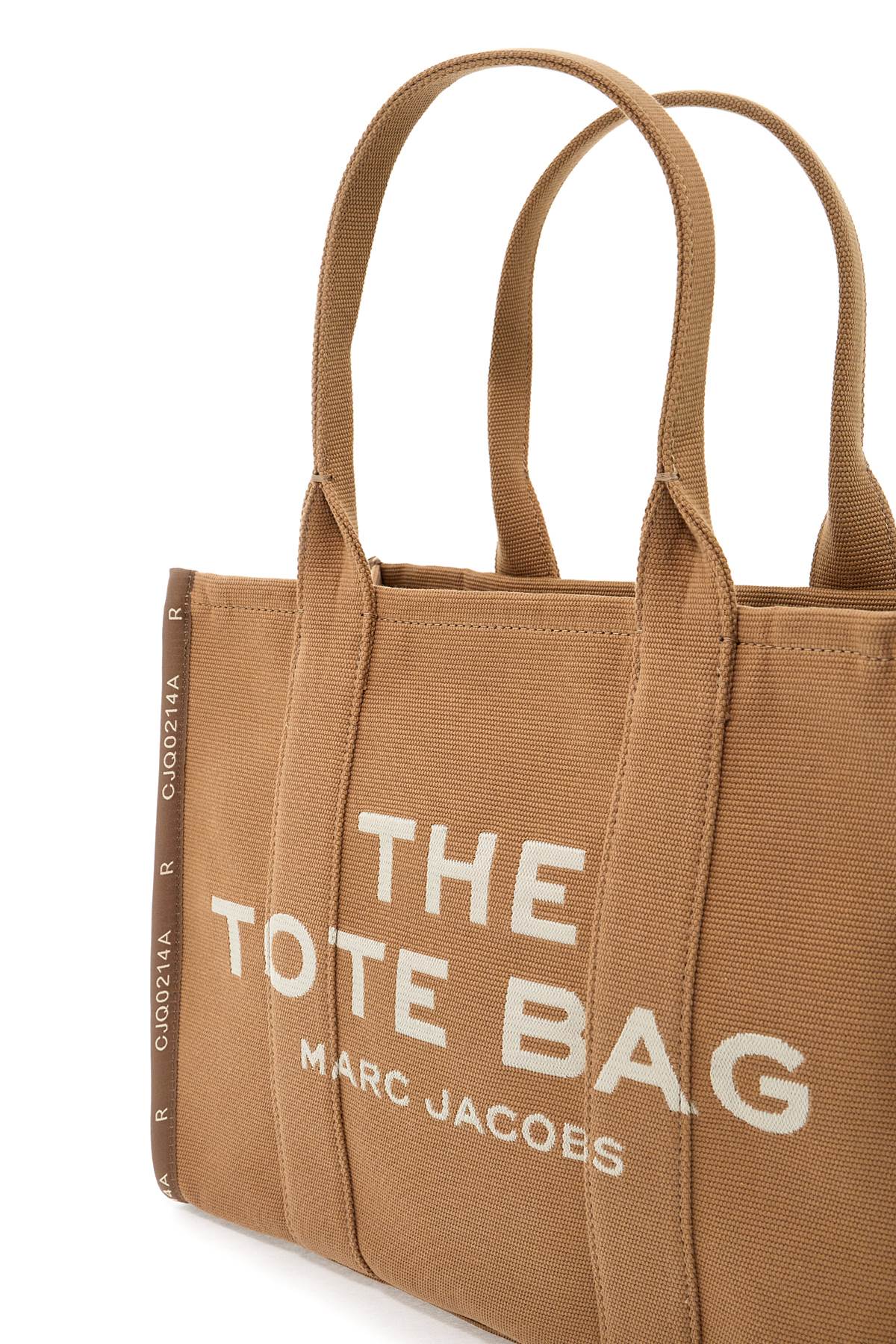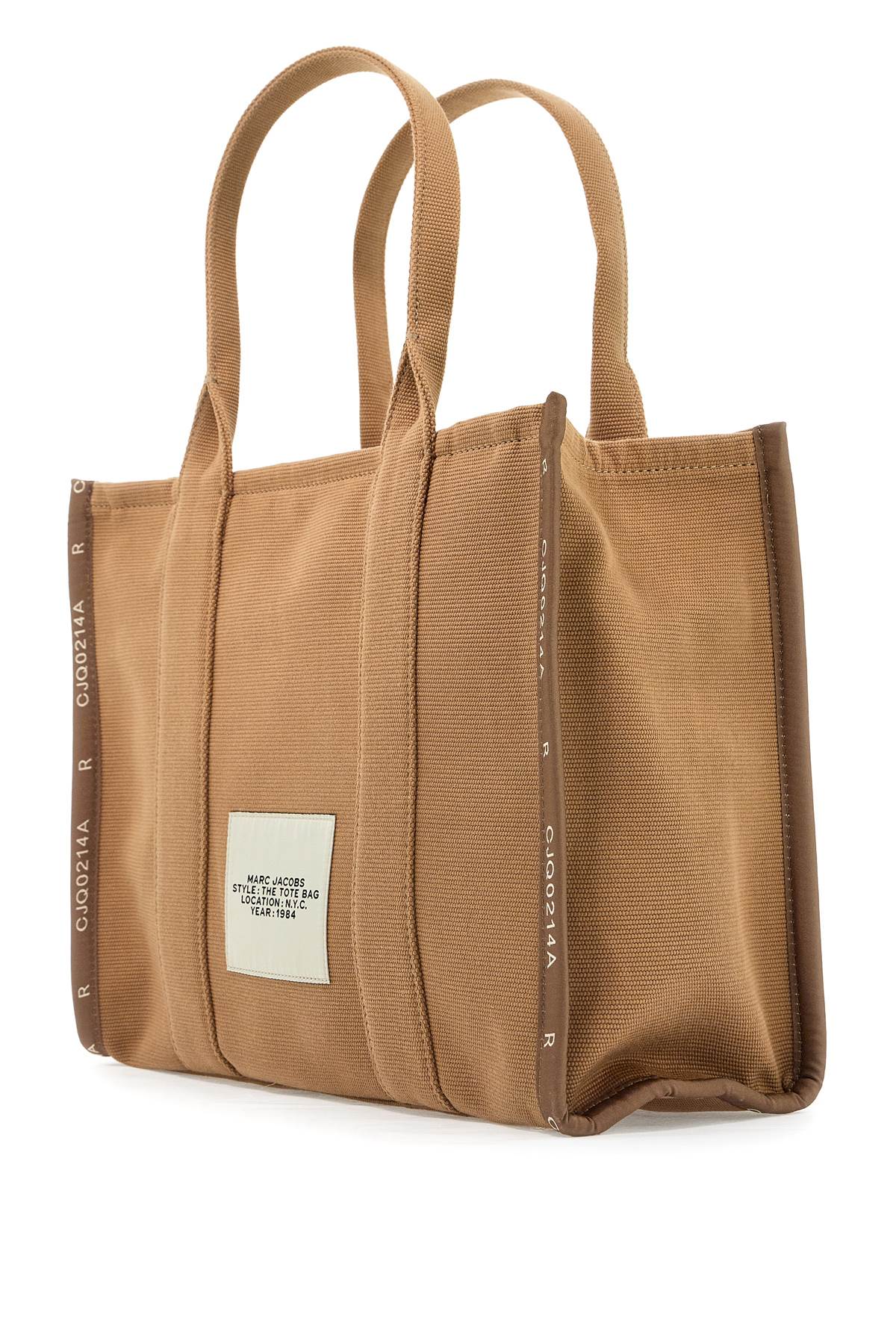 The Jacquard Traveler Tote Large bag by Marc Jacobs in cotton canvas featuring double handle, ribbons applied on the edges, and jacquard embroidery with logo on the front. Logo patch applied on the back, top zip closure, side handle. Unlined interior with one zip pocket and two small pockets, steel-finish metal hardware. Size and Fit - Bag Length = 41 cm, Bag Height = 33 cm, Bag Weight = 14 cm, Handle Height = 23 cm,