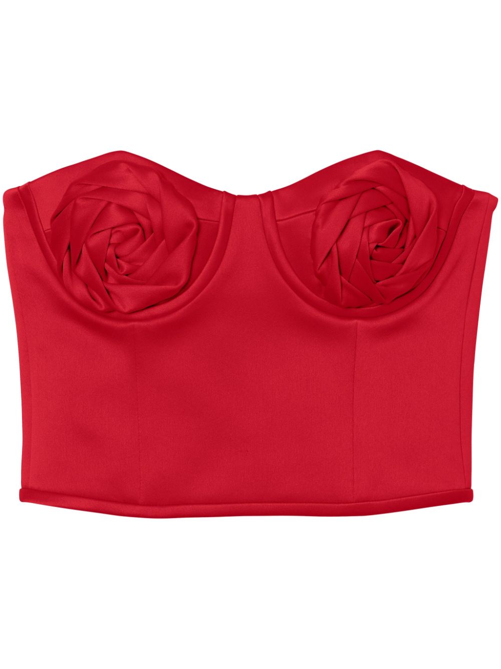 bright red satin finish balconette style faux-rose detailing rear hook and eye fastening boned bodice strapless cropped Size and Fit - This piece fits true to size. We recommend you get your regular size. Model is 1,75m / 5ft 8in wearing size 4 (US)