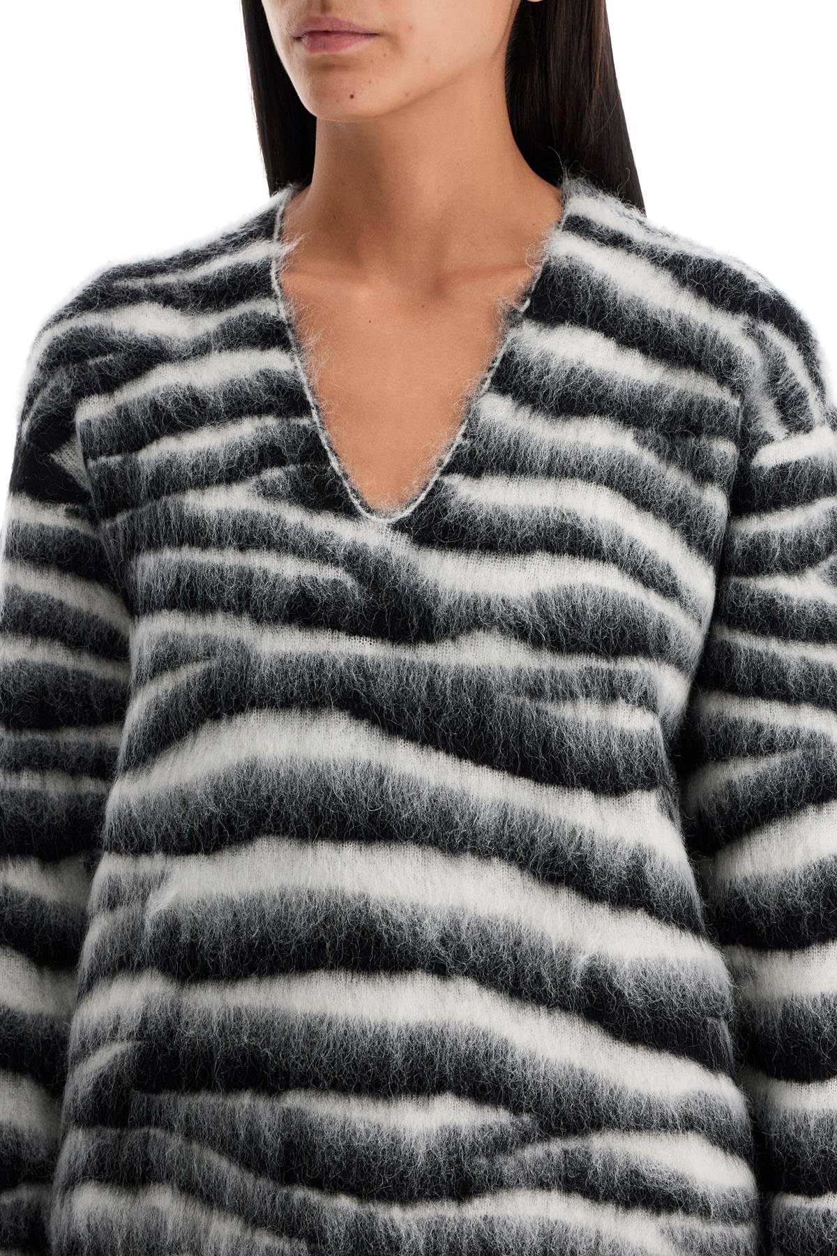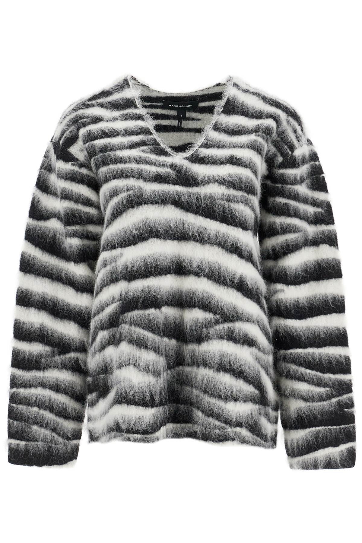 This oversized Marc Jacobs sweater is made of jacquard wool and mohair with an all-over zebra pattern and a brushed finish. The V-neckline completes the design. The model is 177 cm tall and wears size S.