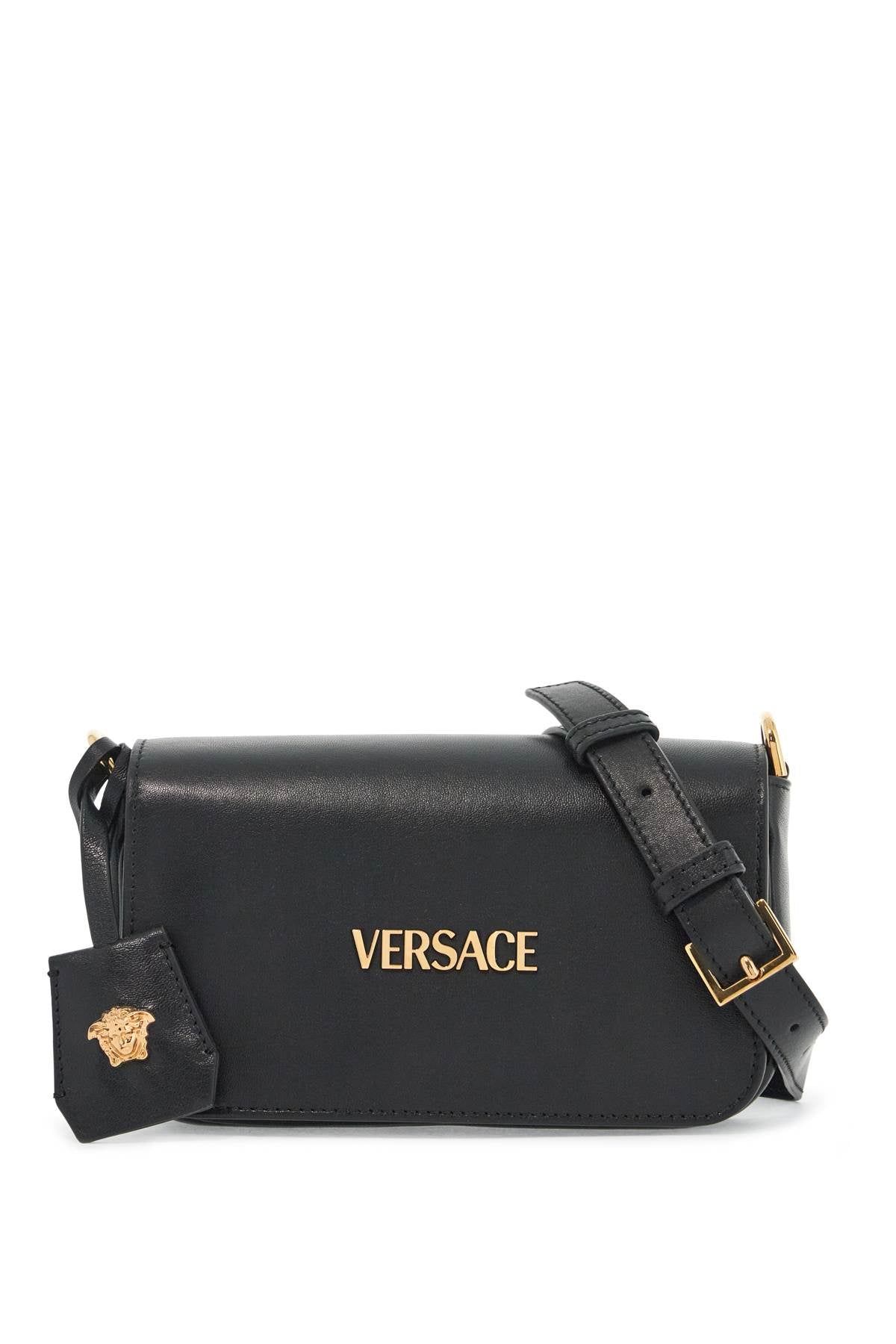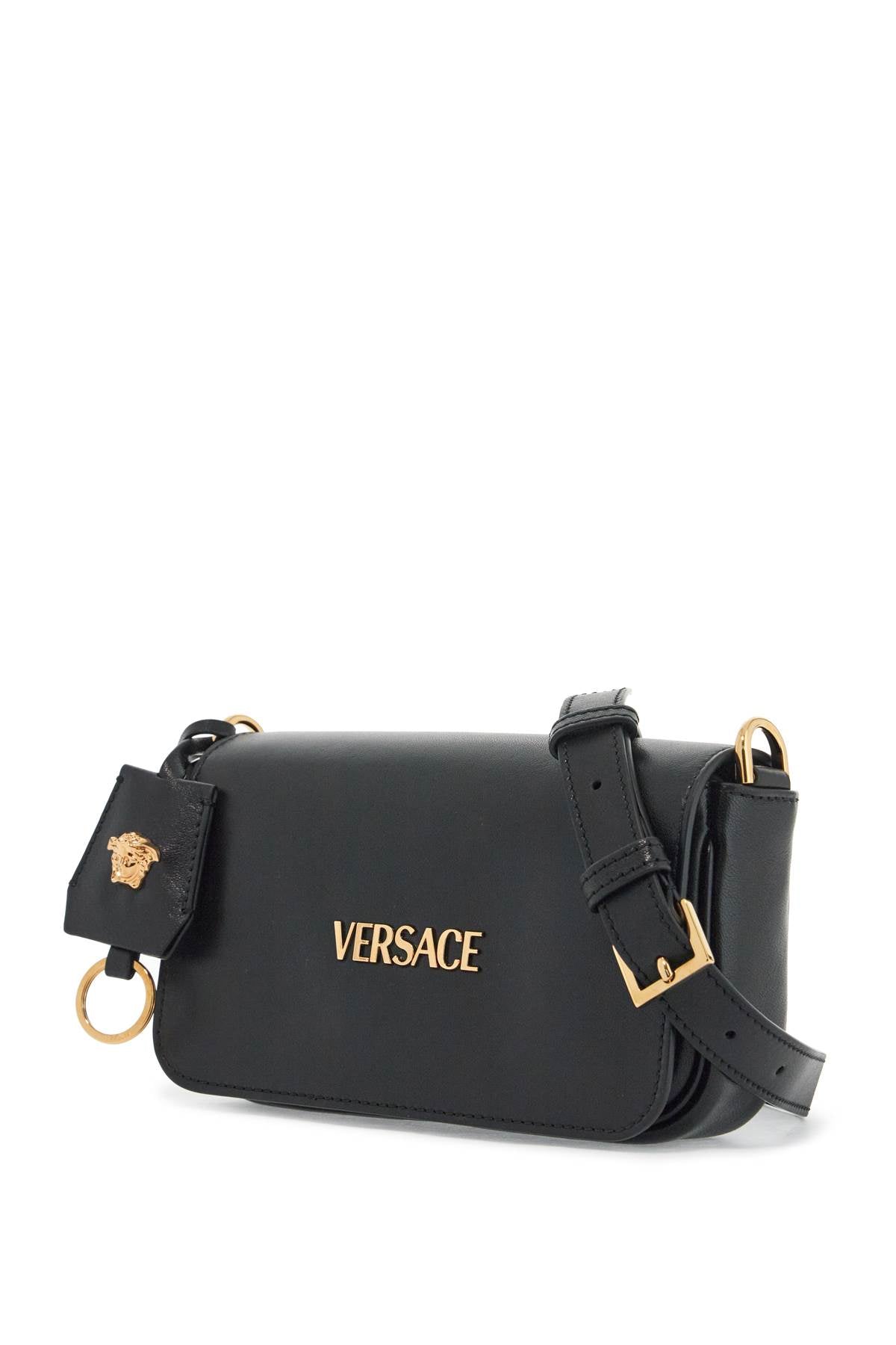This mini Versace bag is made of soft leather and features a metal logo lettering on the front. It also comes with a removable keychain featuring the iconic Medusa on a leather case. The magnetic flap closure reveals a zip pocket, while the interior is lined with suede-like microfiber and includes an open pocket. The bag can be worn as a crossbody thanks to the adjustable and detachable strap. All hardware details are finished in gold. Size and Fit - Bag Length = 19 cm, Bag Height = 11 cm, Bag Weight = 3,5 cm,