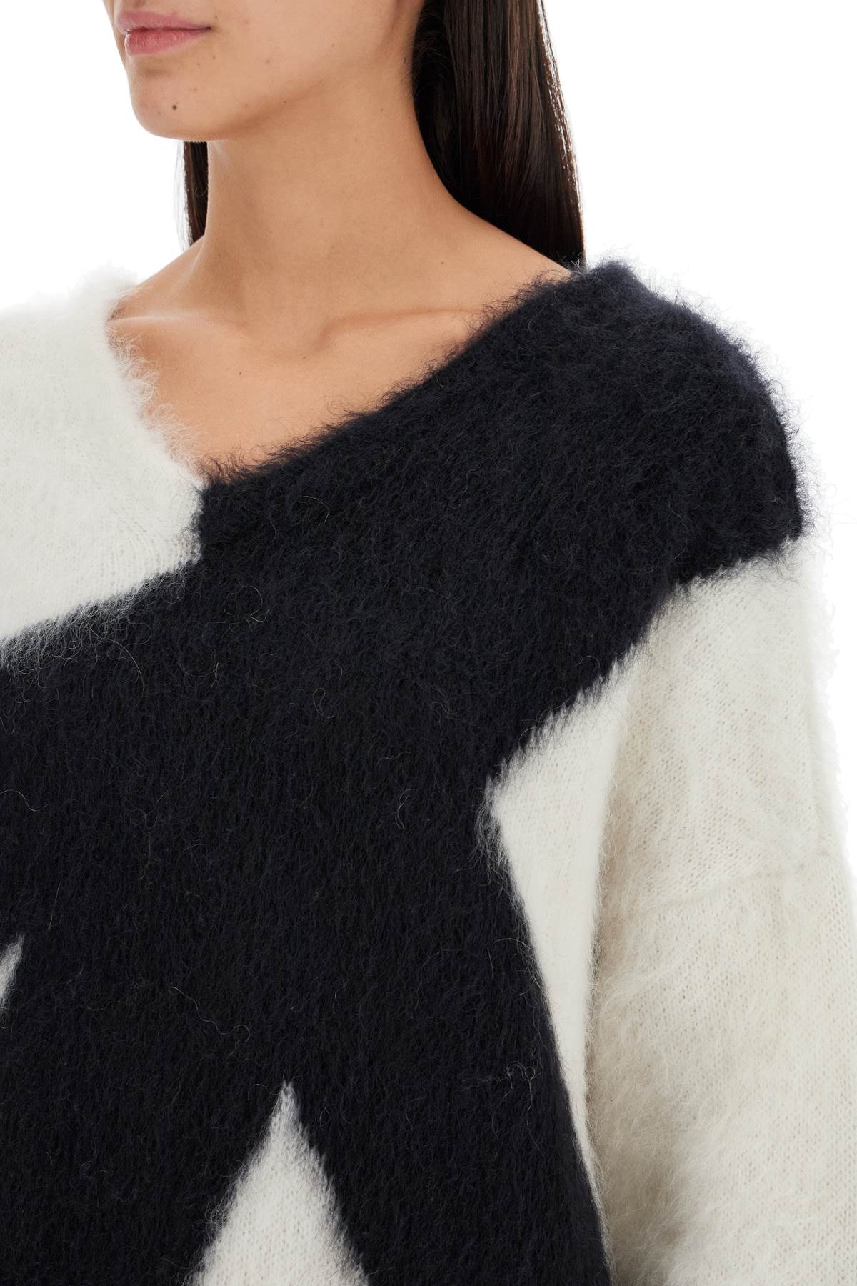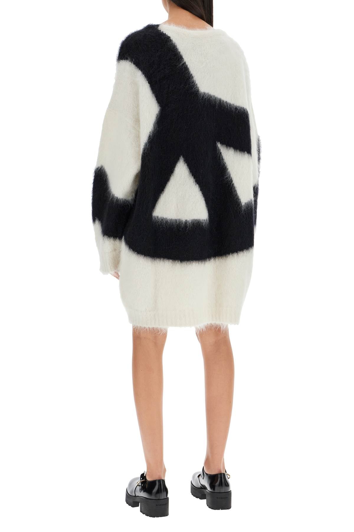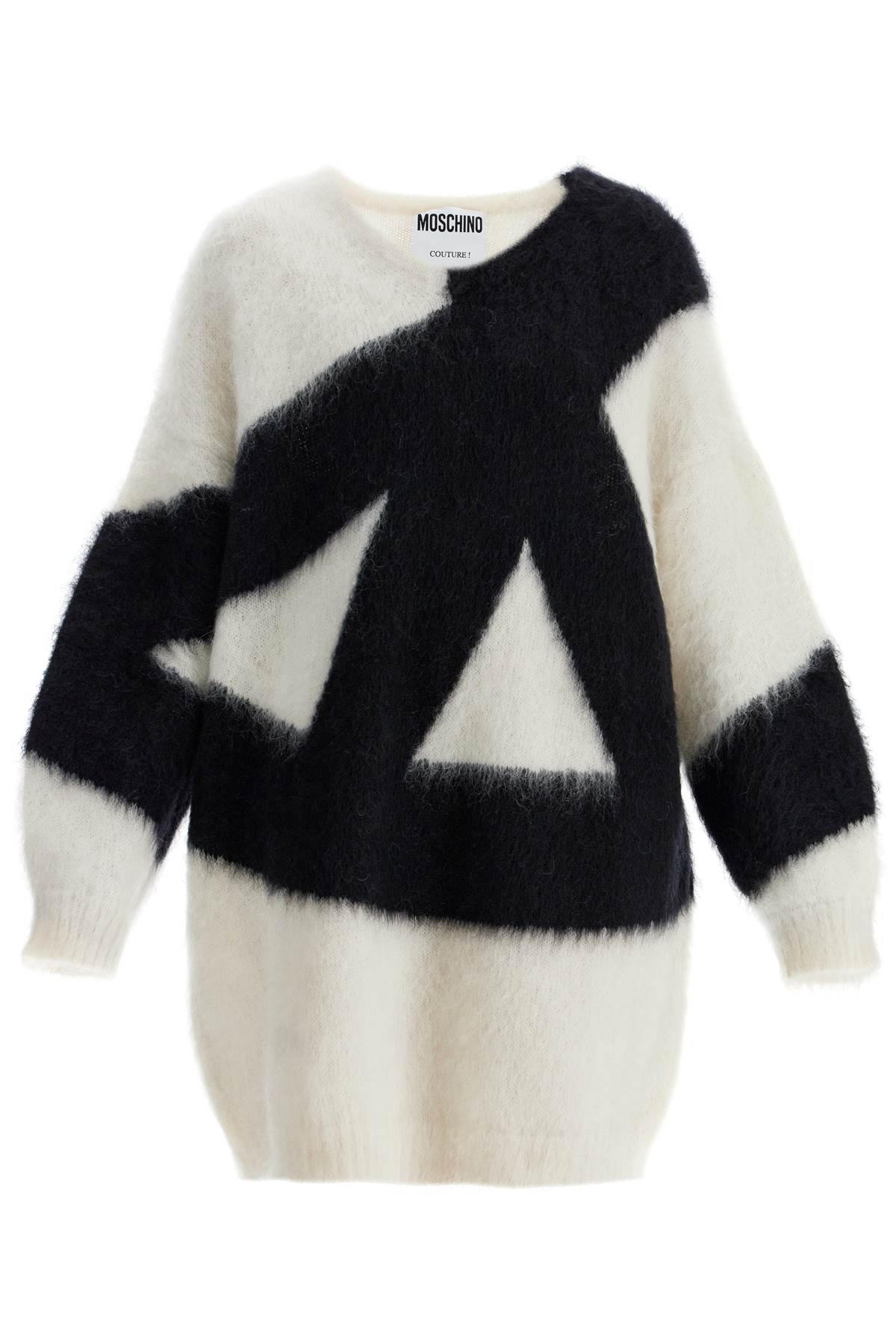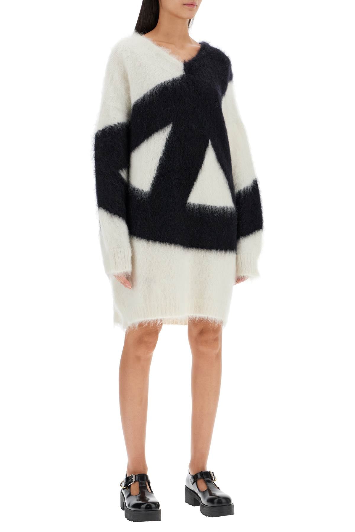 This short Moschino dress is characterized by a pullover-style design with oversized proportions and a V-neckline. Made of brushed mohair blend knit, it is decorated on the front and back with an inlaid graphic pattern. The model is 177 cm tall and wears size IT 38.