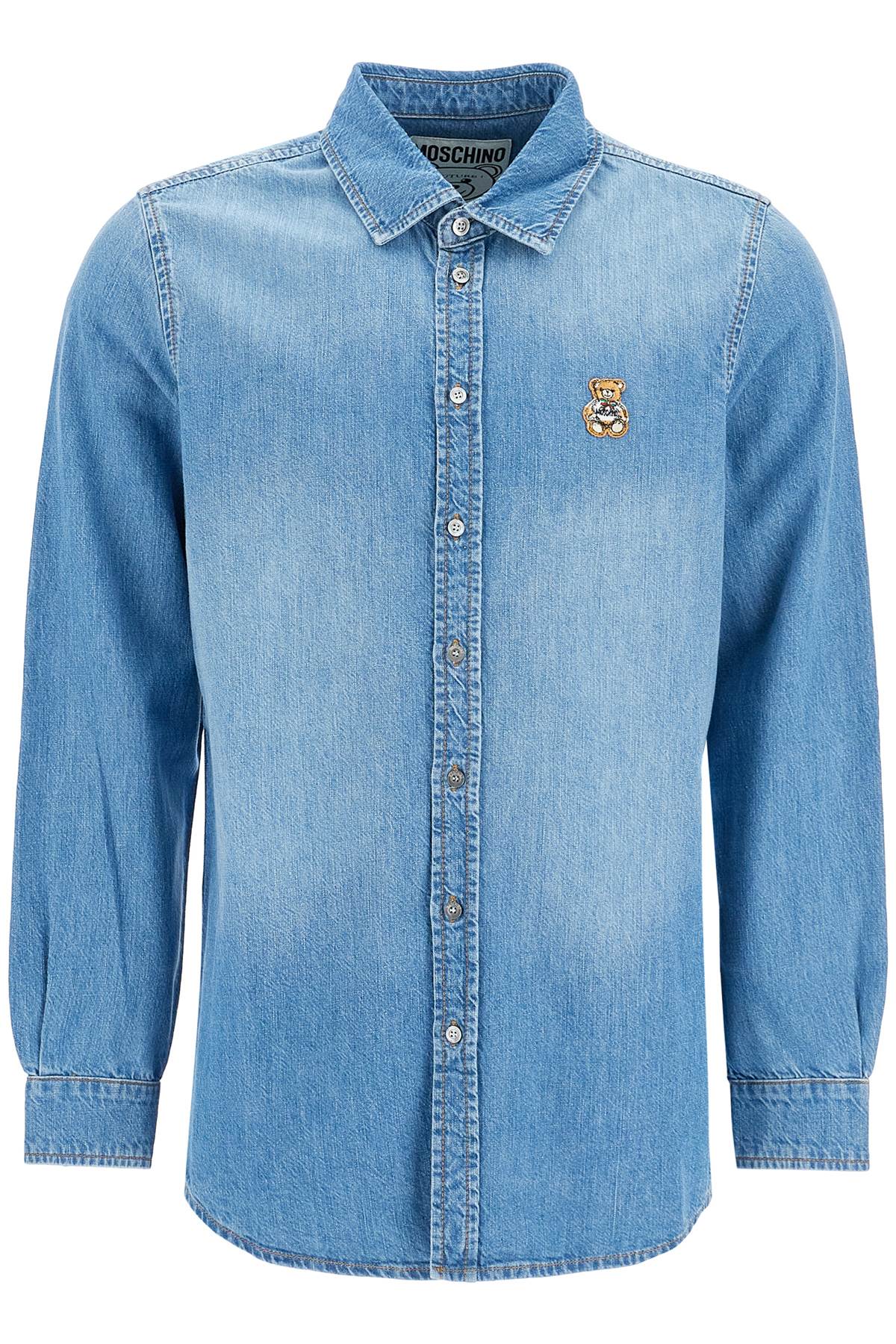This Moschino denim shirt features an embroidered Teddy Bear applique on the chest. Finished with contrasting stitching, it has classic cuffs and collar and a button closure with a placket. Regular fit. The model is 187 cm tall and wears size 40.