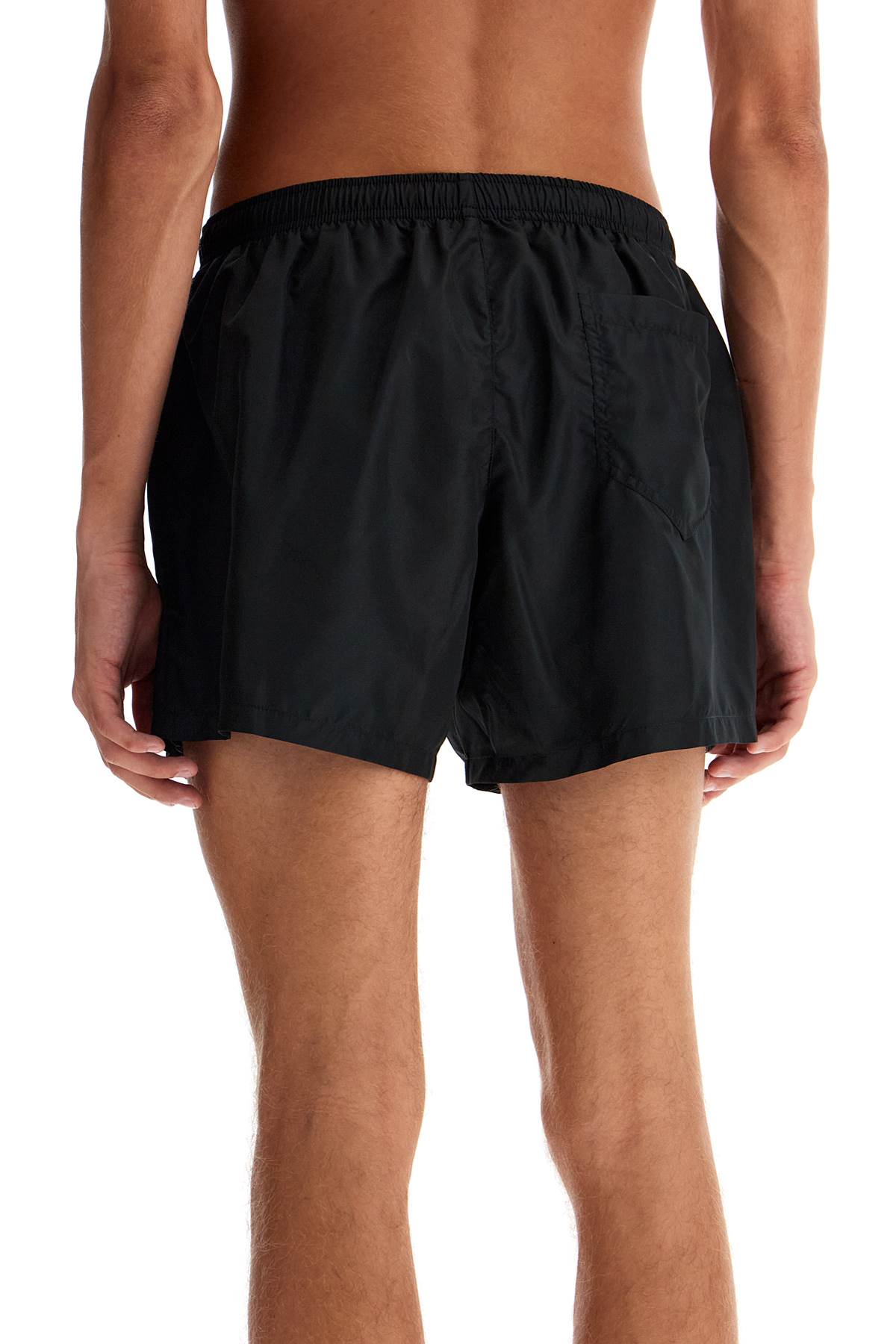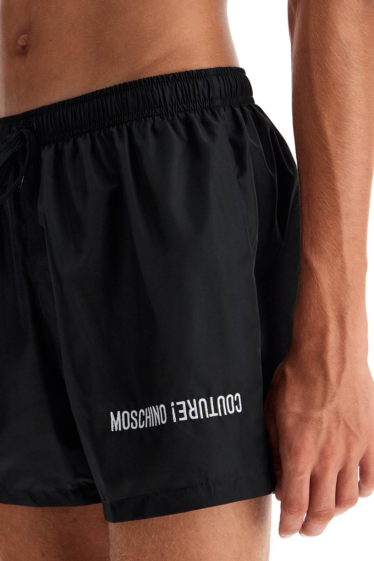 The Moschino men's swim trunks feature a soft design with an adjustable elastic waistband and drawstring. Made of lightweight polyester, they are embroidered with the "Moschino Couture" lettering and have a back pocket and mesh lining. The model is 187 cm tall and wears size IT 48.
